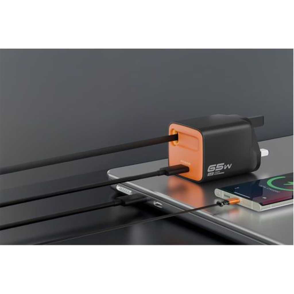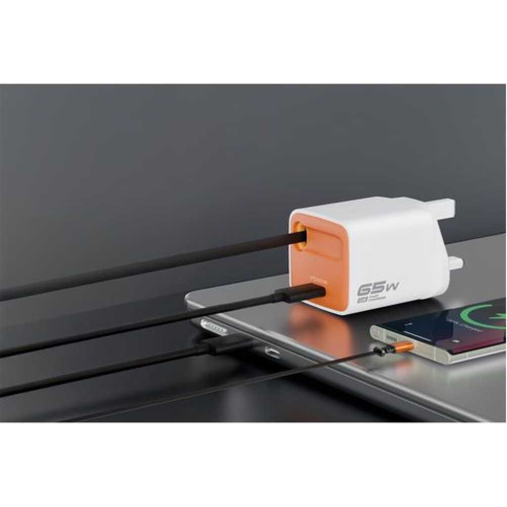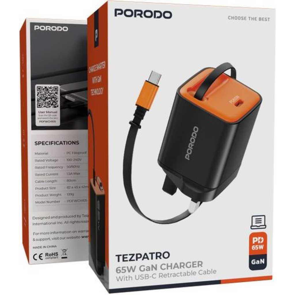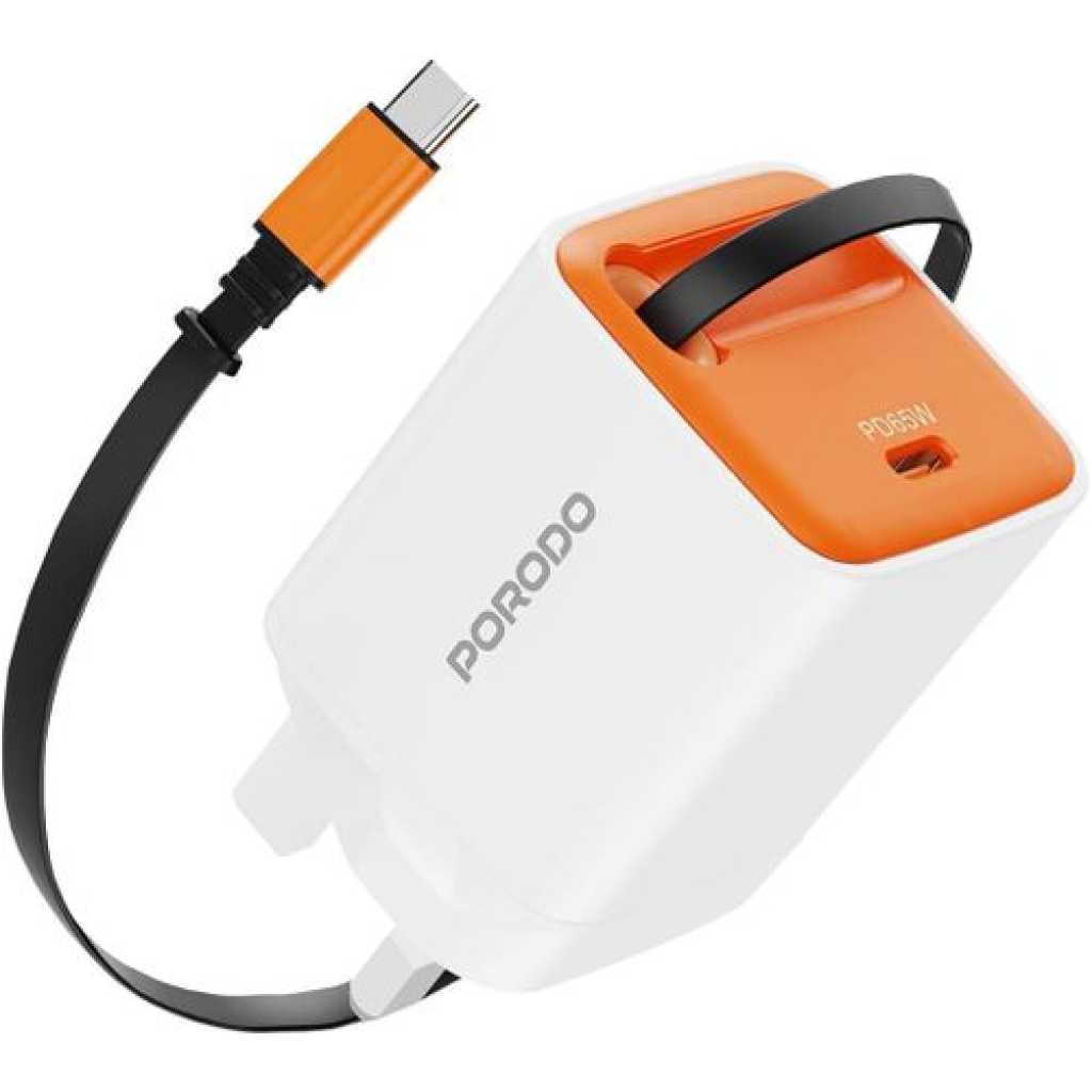 Porodo TEZPATRO 65W GaN Charger, Type C Wall Charger with Fast Charging, 65W PD Output, 80cm Retractable USB-C Cable, Compatible with iPhone 17/ 17Pro/ 17Pro Max/16/15/14, Samsung S25/S24/S23