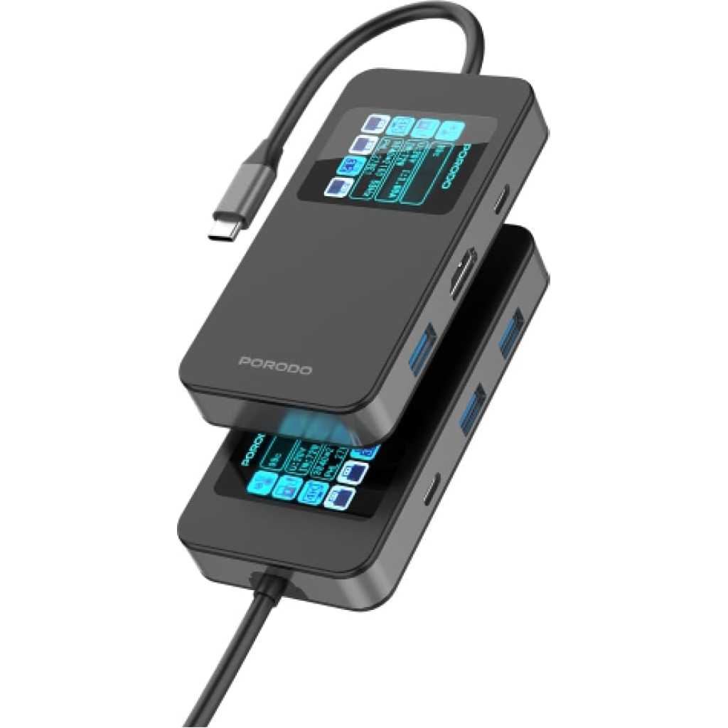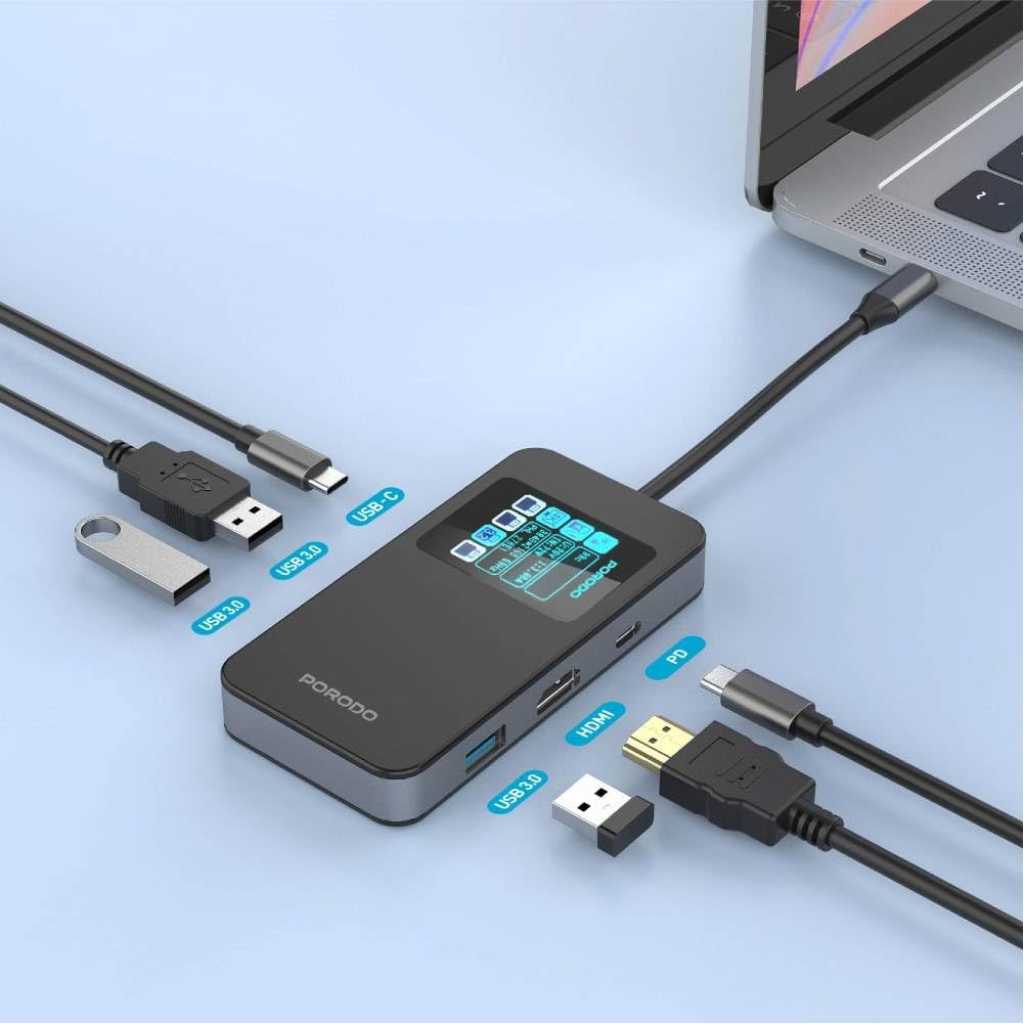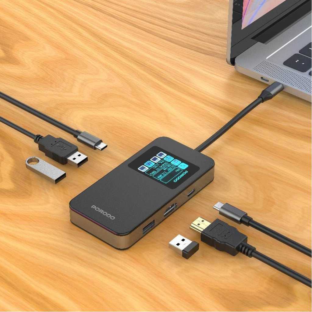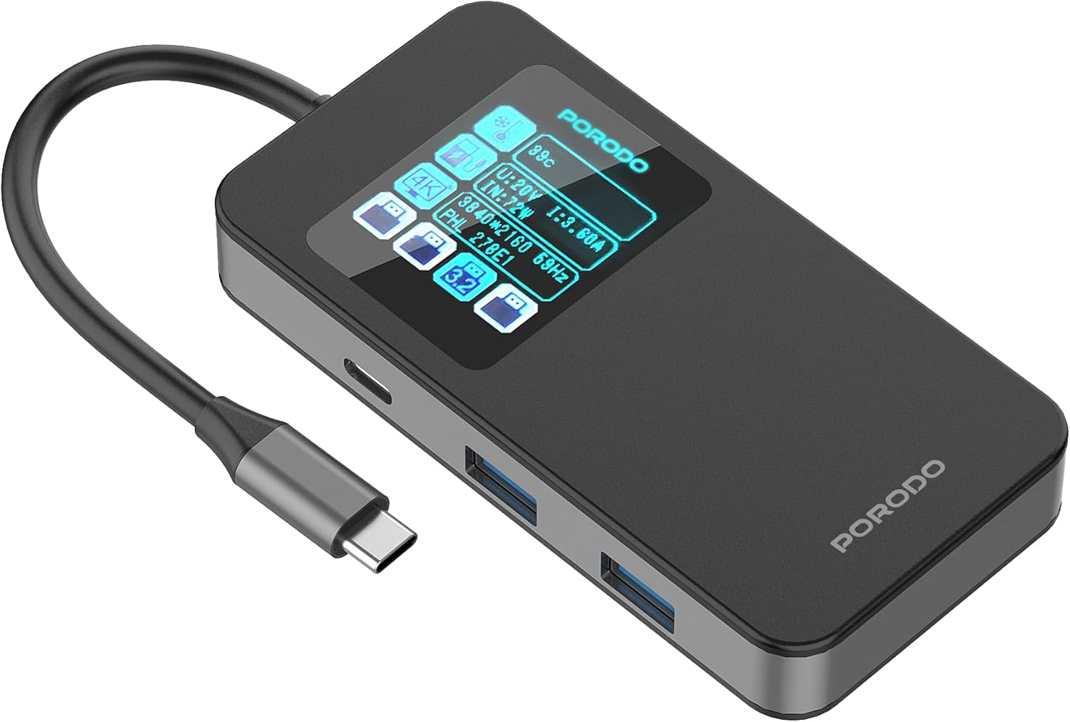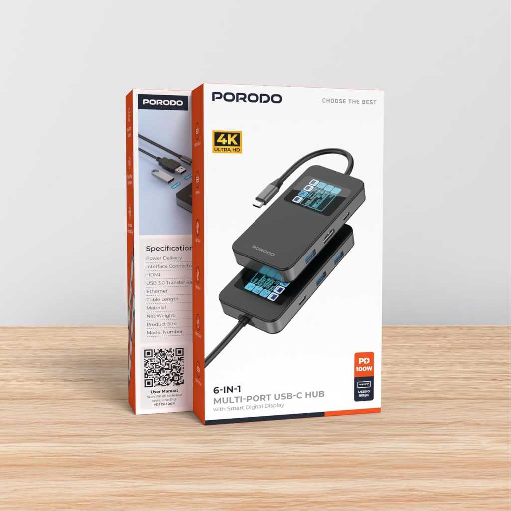 Porodo USB Hub 6-IN-1, Smart Digital Display, USB C With 100W PD Charging, 5Gbps USB 3.0, HDMI 4K60Hz, High Speed Data Transfer,Compatible with iPhone/Laptop/Desktop PC/MacBook/Smart TV