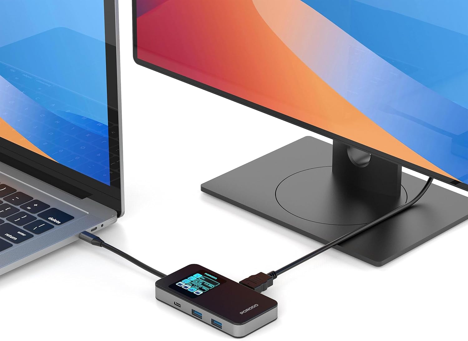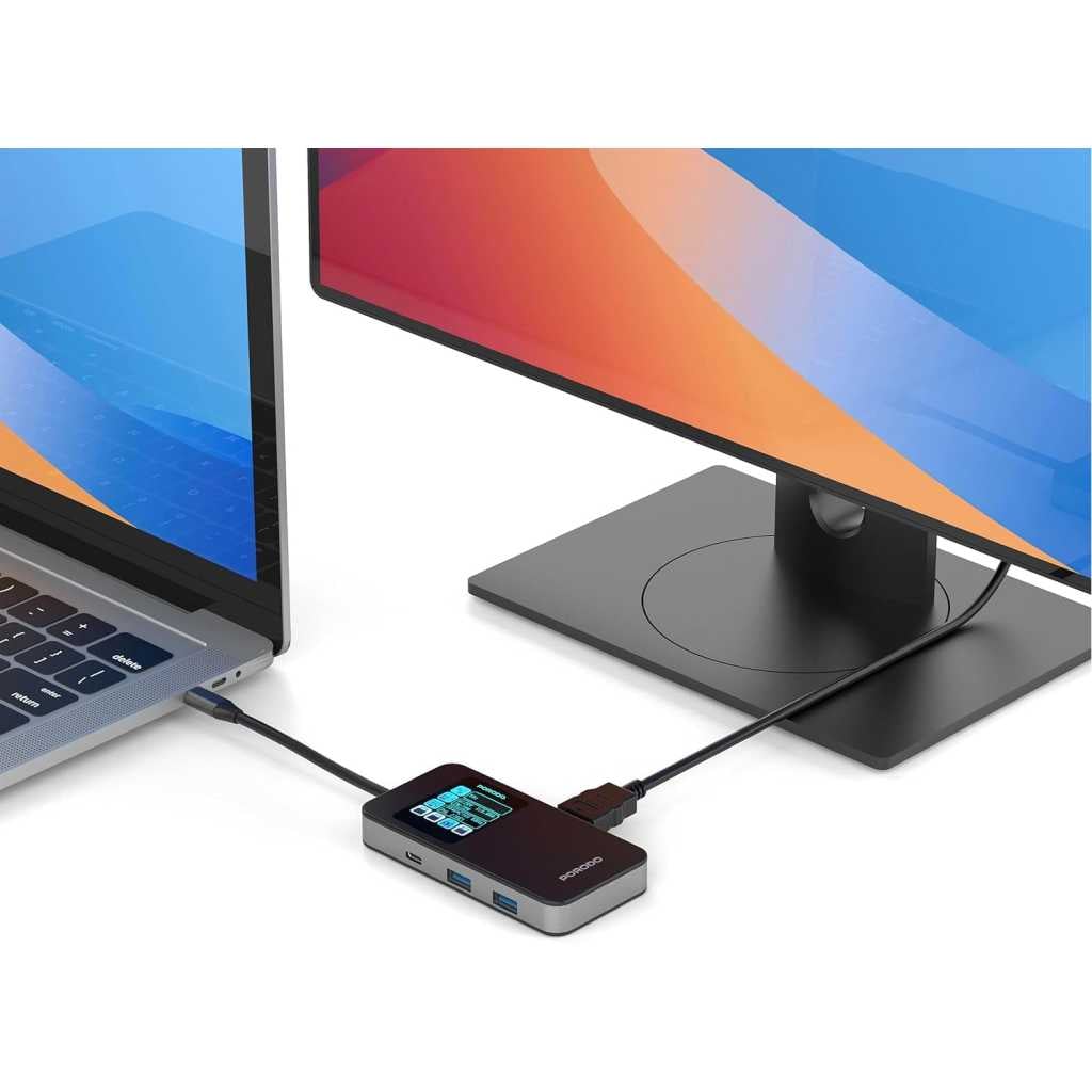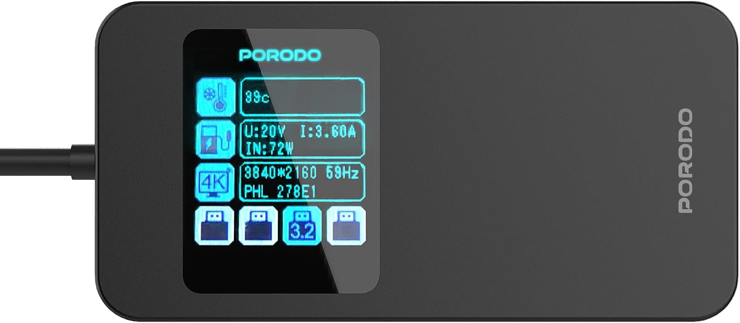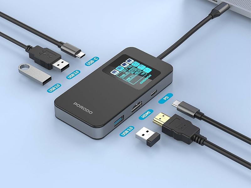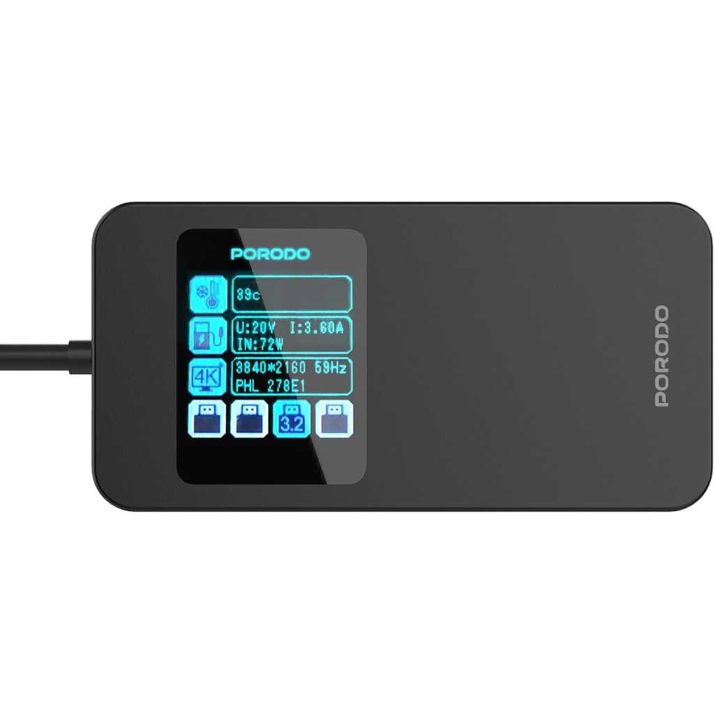 Porodo USB Hub 6-IN-1, Smart Digital Display, USB C With 100W PD Charging, 5Gbps USB 3.0, HDMI 4K60Hz, High Speed Data Transfer,Compatible with iPhone/Laptop/Desktop PC/MacBook/Smart TV