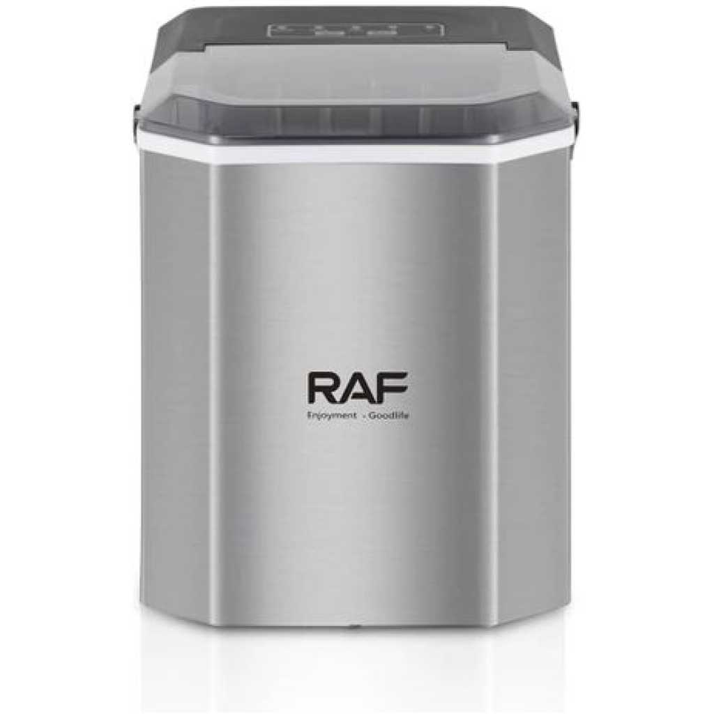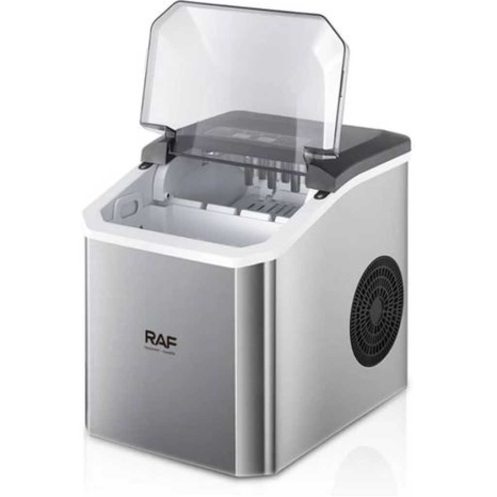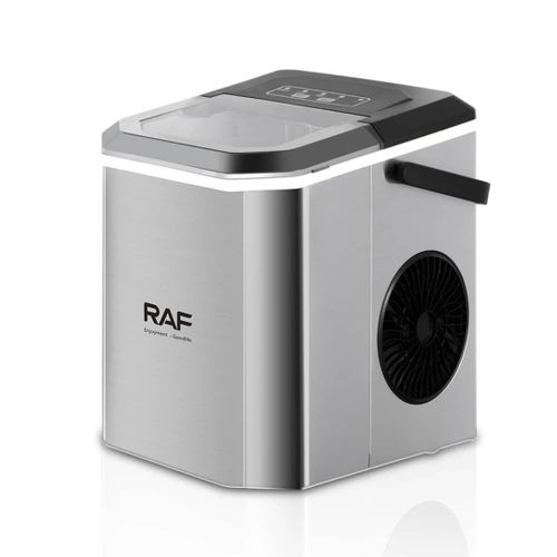 Rapid ice making,Single ice release time:6-13minutes Ice cube maker has two ice size options, select whether you want small or large ice cubes Device is portable, now you can chill out anywhere anytime Continuous ice makingCan get a total of 12kg ice within 24 hours Easy to clean Material Combination Installation Table Top Colour Name Silver Product Length 20 cm Product Height 26 cm Product Width/Depth 27 cm Energy Used Electric Wattage 95 W What’s In The Box Ice Maker, Shovel Model Number R.0300 Model Name RAF ICE MAKER
