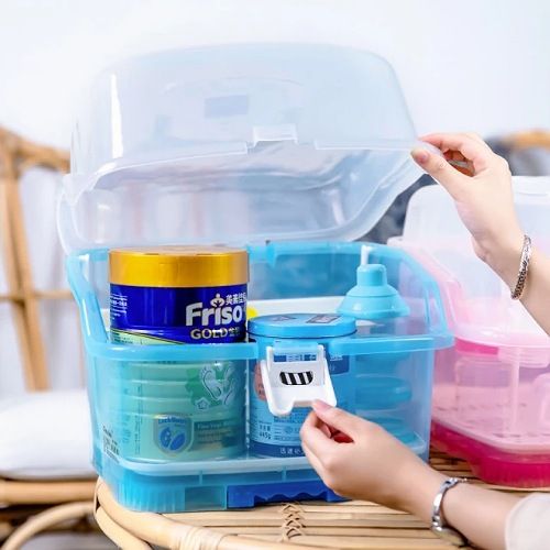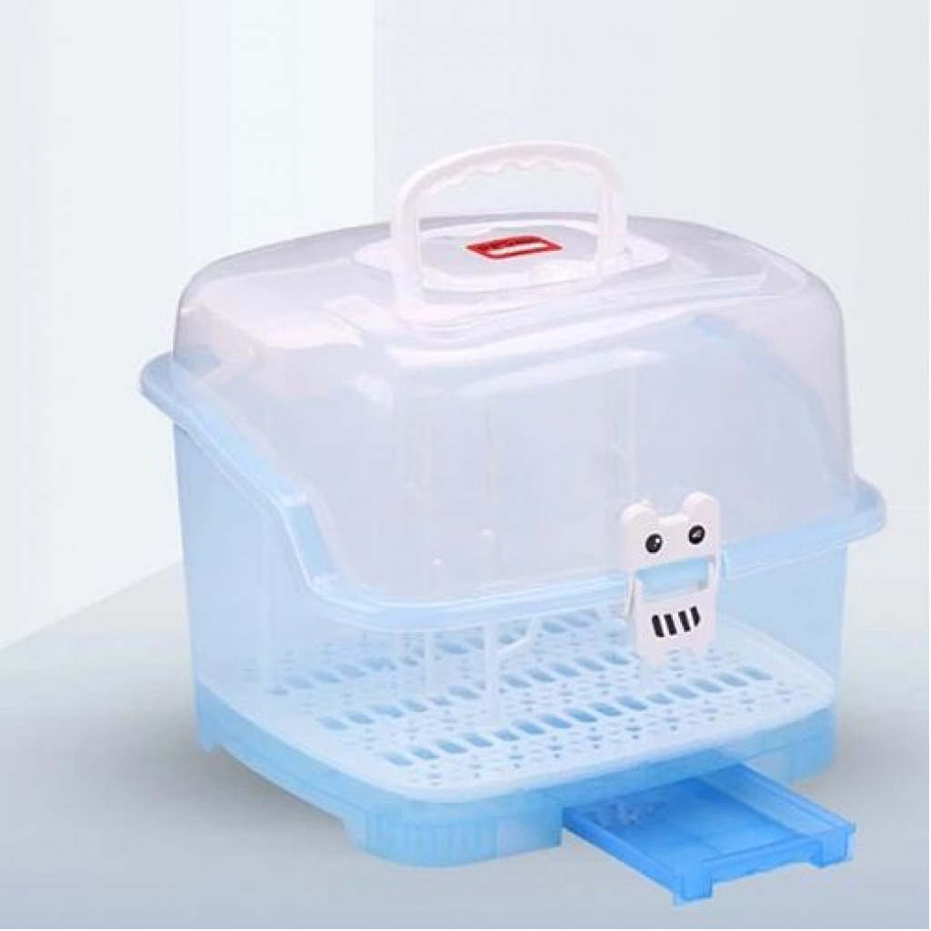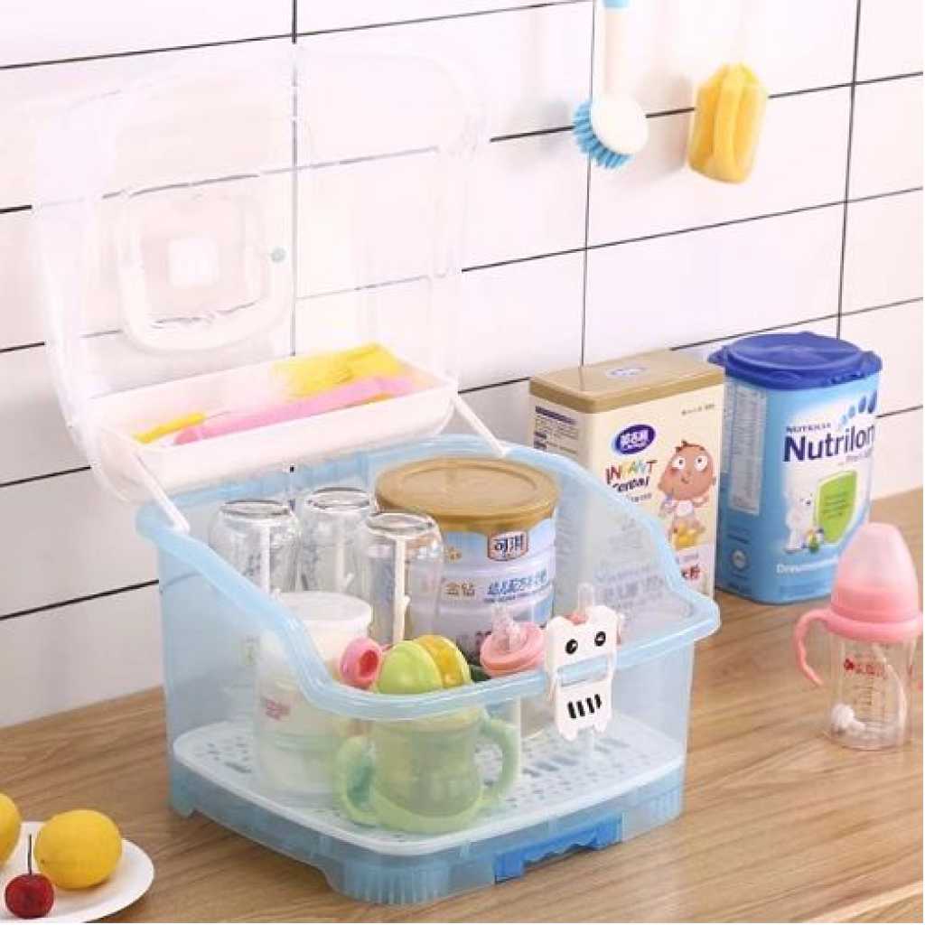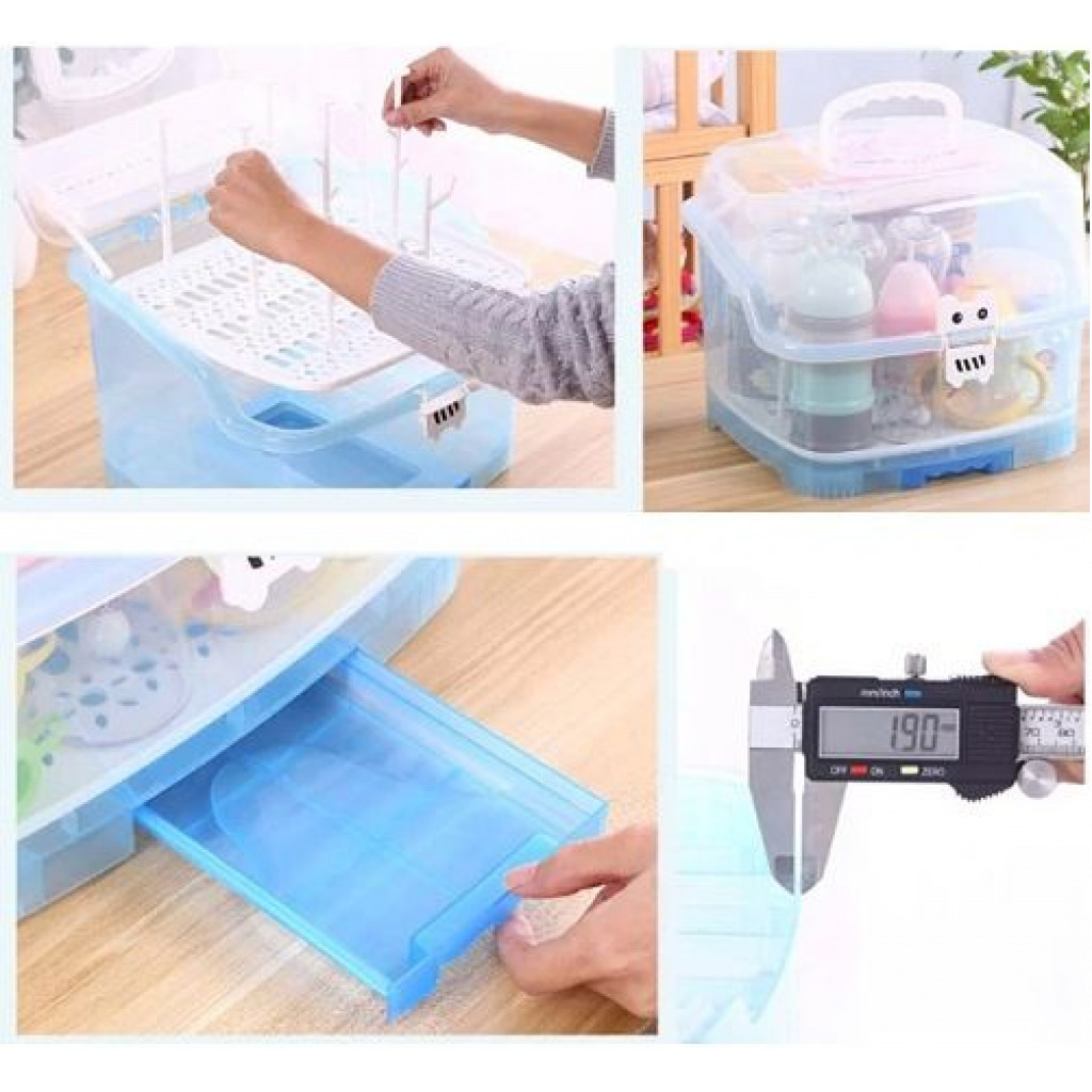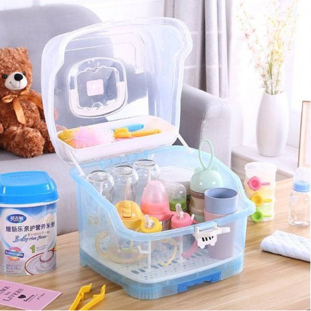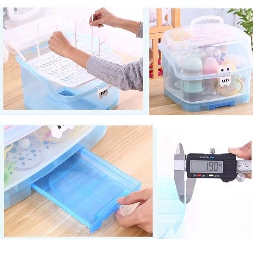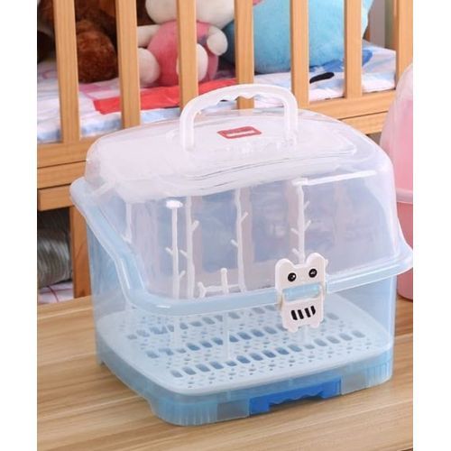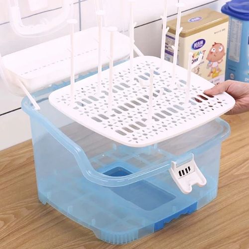 Made of high quality eco-friendly PP material, non-toxic, BPA free, which is safe, durable and easy to carry. With removable cutlery basket, it is ideal for use on valves, straws, nipples, pump accessories, pacifiers, baby spoon, clean brush. Suitable for storing baby nursing bottles, cutlery or tea cups, dining utensils, kitchen seasonings and so on. With 6 Bottle support holders, can hold baby’s bottles and accessories easily. Specifications: Material: PP Color: Blue Size: 10.6*9.8 inches Package includes: 1 * Baby Bottle Drying Rack with Storage Box