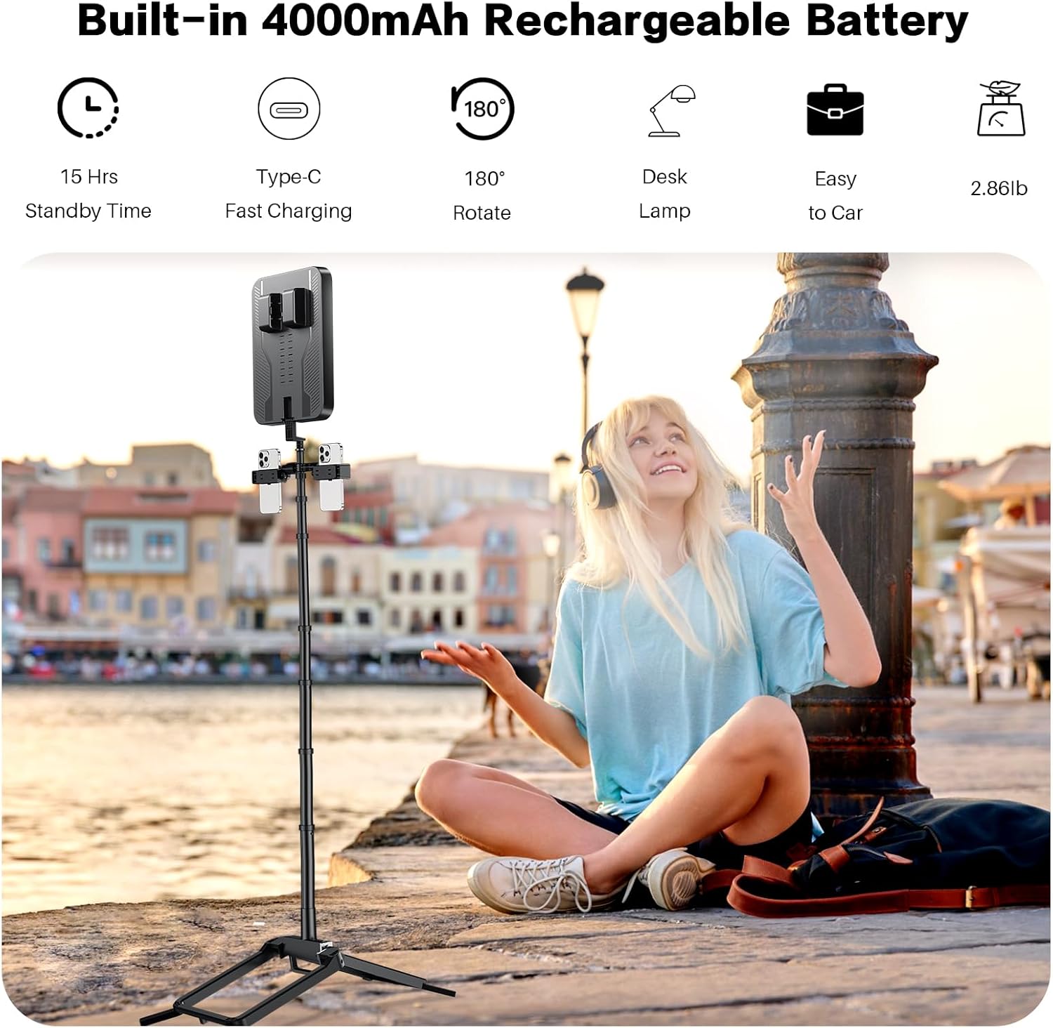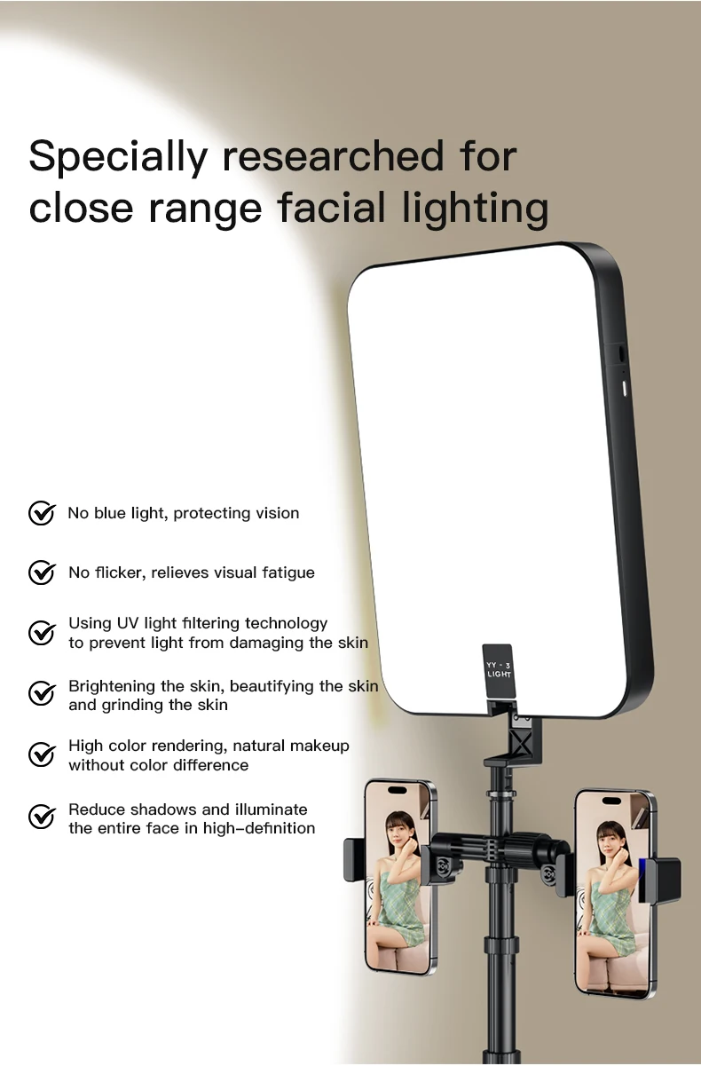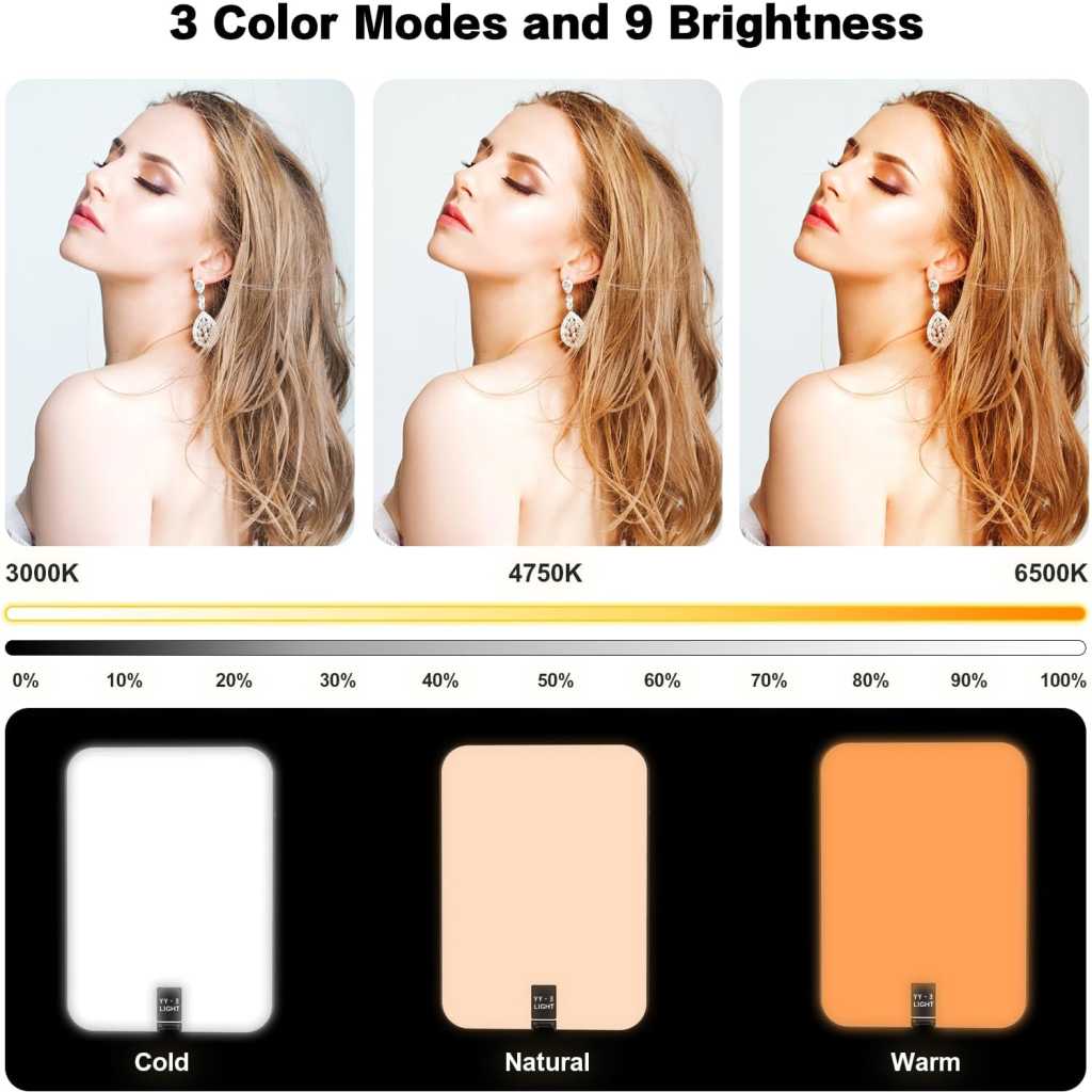 Key Features: Model: YY-3 Dimension: 331*216*62mm(L*W*H) Size of light panel: 14″ Extension height: 170cm Net weight: 1300g Gross weight: 1557g Light source: Energy-saving LED Color of light: warm, white, warm white Lumen: 24-26lm Working time: 2-8h Working temperature: 0-40℃ Battery capacity: 4000mAh Charging voltage: 5V Charging current: 2A Material: PC+ABS+Al alloy+Zn alloy+TPU Max bearing capacity of bracket: 5kg