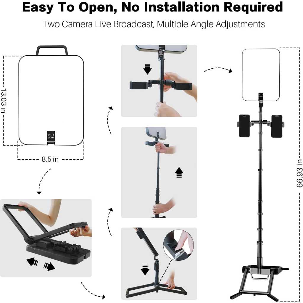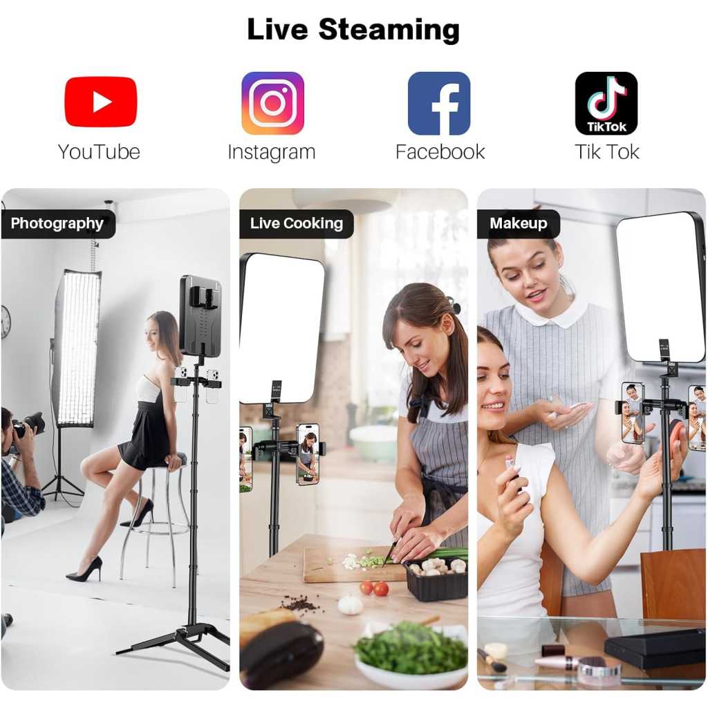 The YY-3 tripod lamp is a modern, practical tool for shooting high-quality content on a smartphone with professional lighting. Its unique folding design and adjustable light allow you to easily adapt the lighting to any task for shooting photos and videos in any conditions. Features and benefits of the YY-3 tripod lamp: • Folding design with compact dimensions (331×216×62mm) and a practical handle for maximum convenience of carrying. • High-quality electronic components and reliable assembly of parts made of polycarbonate, ABS plastic, aluminum and zinc alloy. • Telescopic stand with multi-layer protective coating and practical clamps for adjusting the required height up to 170cm. • Base of two U-shaped supports with 4 corner clamps to ensure stability on any horizontal surface. • 2 folding smartphone holders that can move along the tripod and are equipped with hinges for adjusting the angle of inclination. • 14″ diagonal lamp with a hinged mount for adjusting the angle of inclination and a high-quality diffuser with a thin frame of the body. • Illuminated area of 609cm², 9 brightness levels and 3 operating modes with different color temperatures: cold, warm and mixed light. • From 2 to 8 hours of operation (depending on brightness and mode) from the built-in 4000mAh battery. • Connector for connecting to a power source and low power consumption (15W max). The YY-3 tripod lamp combines mobility, reliability and professional lighting, providing ideal conditions for shooting. Regardless of the place and time, it will help create bright and clear shots.