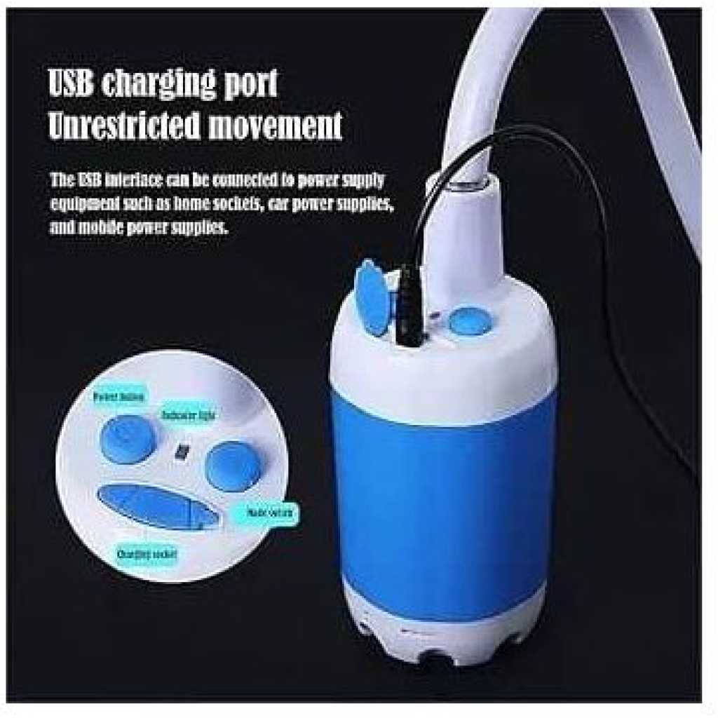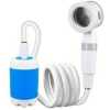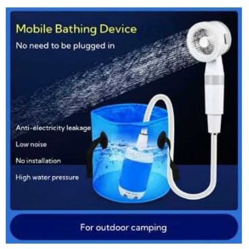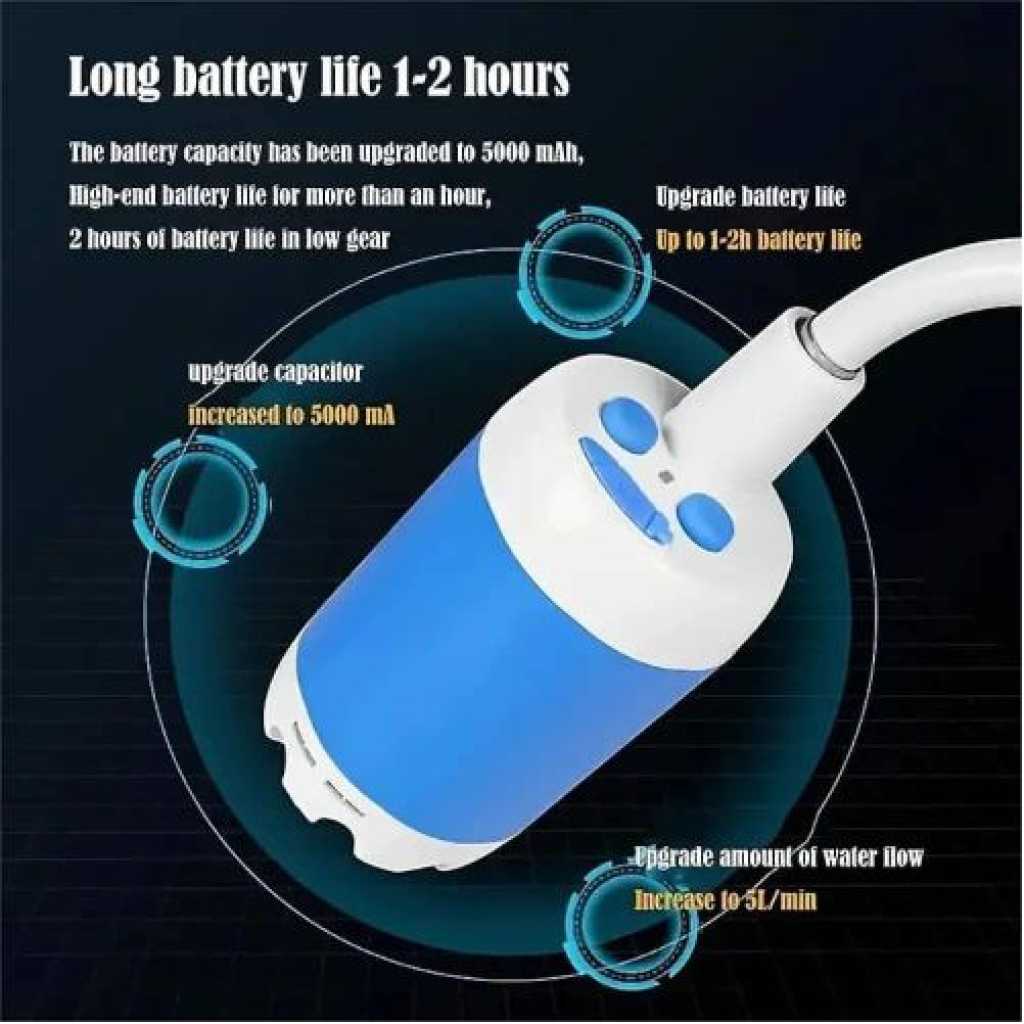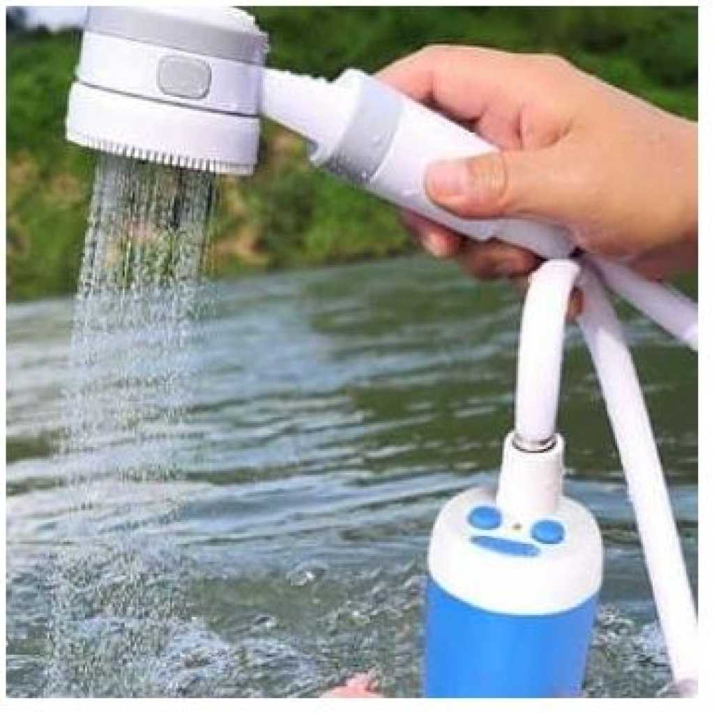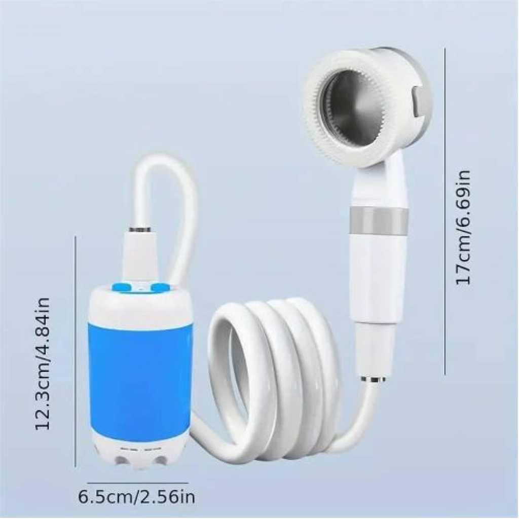 Portability Lightweight and compact design allows you to carry the shower pump effortlessly for outdoor adventures like camping, hiking, and travel. Rechargeable Battery Equipped with a rechargeable battery for extended use, eliminating the need for external power sources and ensuring you stay refreshed anywhere. Versatile Use Ideal for various applications, including car washing and pet cleaning, making it a multifunctional tool for all outdoor and home needs. Product Details Versatile Handheld Shower: Transforms a sink or water bucket into an instant shower stream, with two meters length Hose making it perfect for indoor and outdoor use. Adjustable Water Flow: Features two flow rates for a comfortable bathing experience, The camping shower offers gentle and comfortable stream at 0.9gal/min(3L/min) & 1.32 gal/min (5 L/min)) Long-Lasting Power: The built-in 4000mAh rechargeable battery provides up to 60 minutes of continuous use on a single charge. Compact and Portable: Weighing only 1.5 pounds and including a mesh storage bag, it’s easy to carry in your luggage, backpack, or car trunk for various activities like hiking, camping, kid bathing, and pet cleaning. Multiple Charging Options: Charge the shower with ease using a USB port, car adapter, or laptop. The full battery charge allows for up to 60 minutes of continuous use. Suction Cup and Hook Included: Attach the showerhead securely to any smooth flat surface with the provided suction cup or hang it safely on trees for a convenient shower during your outdoor adventures.