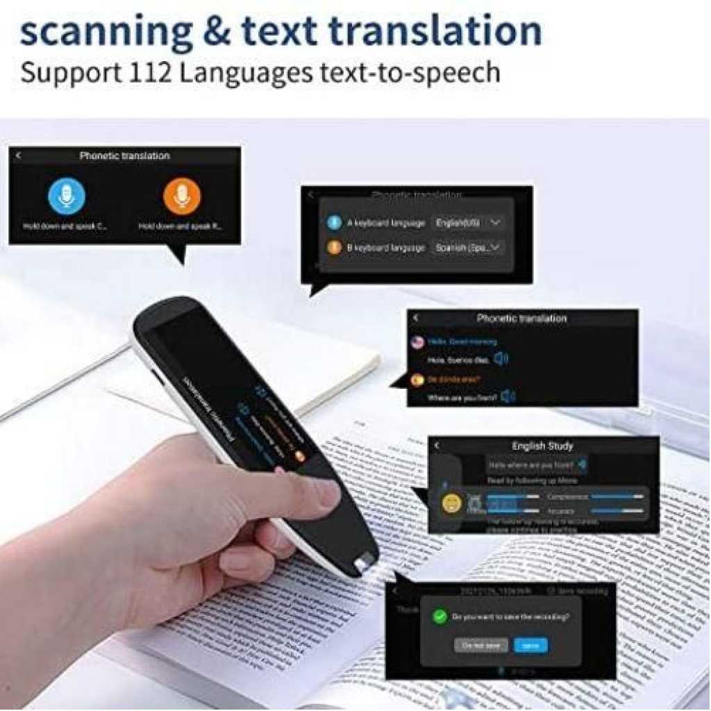 Key Features: Scanning&Translation: This scanning pen can scan text and translate the scanned text instantly.It has 98% accurate recognition rate and efficient scanning speed, just slide your handheld scanning pen across a line of printed text and watch it appear instantly on your screen. Intelligente AI TranslatorDevice: It is not only a scanning pen, it has all the functions of a translator, supporting 112 languages online voice translation, 112 languages recording translation, 55 languages scanning translation, and offline scanning translation in Chinese, English, and Japan. Tested by over 5000 users, this language translator’s translation accuracy reaches 98%. Text Excerpt: It allows you to Scan the Text, Story, or full article and transfer text to PC or Mac, directly via USB or from the 8GB storage, with no additional software required. Newly designed Intelligent recording feature functions as a digital recorder. You can record and save all your Lectures and presentation audio without missing any important words. Multifunctional Pen Scanner: This Scanner can be used as an MP3 player to connect your Bluetooth, earphone, and type C port. The 1500mah makes 8 hours voice translation and 210 hours device standby true. The user can use it for long time. This scan translation pen enhances the travel experience, it helps you overcome cross-language barriers, like hotels to stay, attractions to visit and so on while traveling overseas. Just enjoy it in anywhere. Light & Portable -portable design with the same size as a pen. 3.5inch large touch screen display with eye-protective UI design. Full angle recognition. Covered by Alloy Rear Shell: high-quality materials designed to maximum-optimize user experience. High-fidelity speaker.