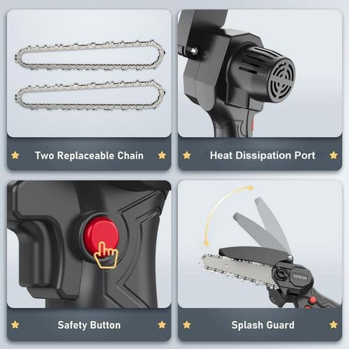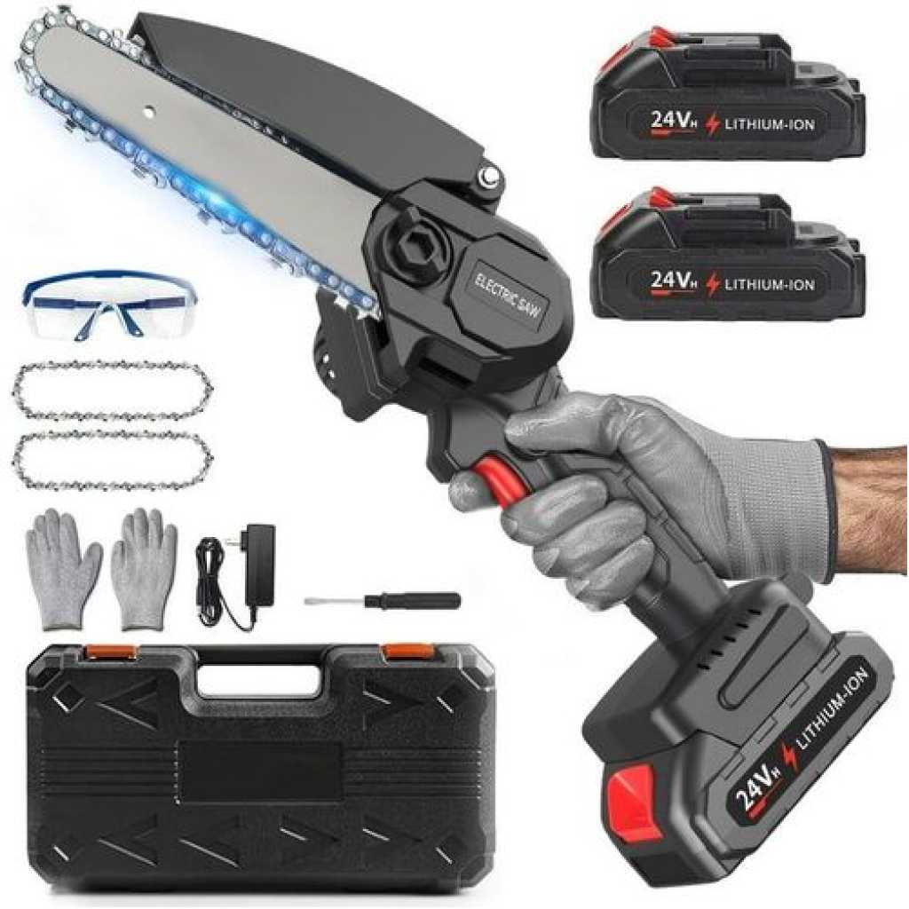 Power Tools Mini 24V Battery-Powered Cordless Chainsaw, Portable Electric Pruning Chain Saws with 2 Batteries 2 Chains, Cordless Handheld Chain Saw Wood Cutter Pruning Shears for Tree Branches, Courtyard, Patio, Woodworking Garden Tools- Black Mini Cordless Chainsaws are a great replacement for a variety of home, garden, patio or farm projects. It is suitable for logging, cutting branches, pruning branches, gardening, municipal greening projects, etc. Great tool for your temporary job! Great as a gift for friends, DIYers, dads, woodworkers, and craftsmen. With a portable chainsaw start your work today. Vemingo Mini Chainsaw with 2 Batteries, High-Quality Chain and Gear, Wood Cutting Ideas, Tree and Branch Pruning. The Vemingo 6″ Mini Cordless Chainsaw is equipped with a sharp and strong chain, ensuring efficient cutting of wood and tree branches. It provides a reliable tool for pruning and trimming tasks in your courtyard, patio, or garden. Powered by a brushless copper motor, this chainsaw delivers powerful performance while maintaining durability and longevity. The motor’s design allows for smooth and precise cutting, enhancing the overall cutting experience. With a wider baffle design, this chainsaw provides added safety during operation. The baffle effectively blocks wood chips and debris from flying out, reducing the risk of injury and creating a cleaner working environment. The chainsaw is designed for easy installation, allowing users to quickly assemble and disassemble the components. This convenience saves time and effort, enabling users to start their cutting tasks efficiently. To ensure user safety, the chainsaw features a work protection safety lock button. This button prevents the accidental starting of the chainsaw, minimizing the risk of injuries or damage. Users can have peace of mind knowing that the chainsaw has an added layer of safety measures in place. A 4-inch long guide plate, with a guard design, prevents flying sawdust and debris. The sawchain has been deep quenched by high temperature, with sharping sawteeth, more wear-resistant, smooth cutting. Scope of application cutting trees in orchards, pruning branches in municipal gardens, splitting firewood and etc.. Electric Pruning Shear: Quickly cutting and convenient to use, small size, wireless design, easy to carry, improves working efficiency. The anti-slip handle conforms to human engineering design, is easy to use and effort saving. With fine heat dissipation effect and low noise design, can provides long service time. High efficiency, improve production efficiency, release labor load and reduce production costs. SK5 steel sharping cutting-blade design, strong hardness, corrosion resistance, and wear resistance. Support cutting branches and twigs with 0-30mm diameter. 21V 2000mAh large capacity lithium battery, 1-1.5 recharge time can provide 4-5 hours operating time, also comes with 1pcs replacement battery. Can be used for fruit picking, gardening design, flower market pruning, farm picking, etc. Specifications: Name: Electric Pruning-Saw and Pruning Shear Set Material: ABS+metal Battery: 2 * lithium battery, 21V, 6000mAh(included, you will find there are 5 batteries inside if disassemble one) Operating voltage: 21V Guide plate type: chain-wheel type Length of guide plate: 4-inch Chain-speed: 5m/s Pruning shear-rated power: 100W Max power of pruning shear: 800W Cutting capacity of pruning shear: 0-30mm diameter Operating temperature: -10 to 65/14-149 Pruning shear with battery size: 110 * 73 * 285mm / 4.33 * 2.87 * 11.22in Chainsaw with battery size: 315 * 73 * 110mm / 12.40 * 2.87 * 4.33in Carrying box size: 400 * 290 * 125mm / 15.75 * 11.42 * 4.92in Item weight: 3189g / 7.03lb Package size: 410 * 120 * 325mm / 16.15 * 4.72 * 12.80in Package weight: 3