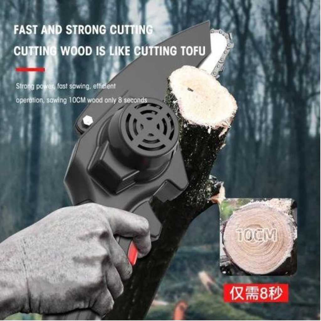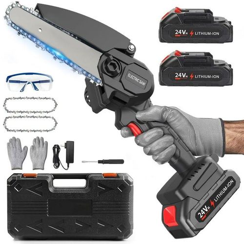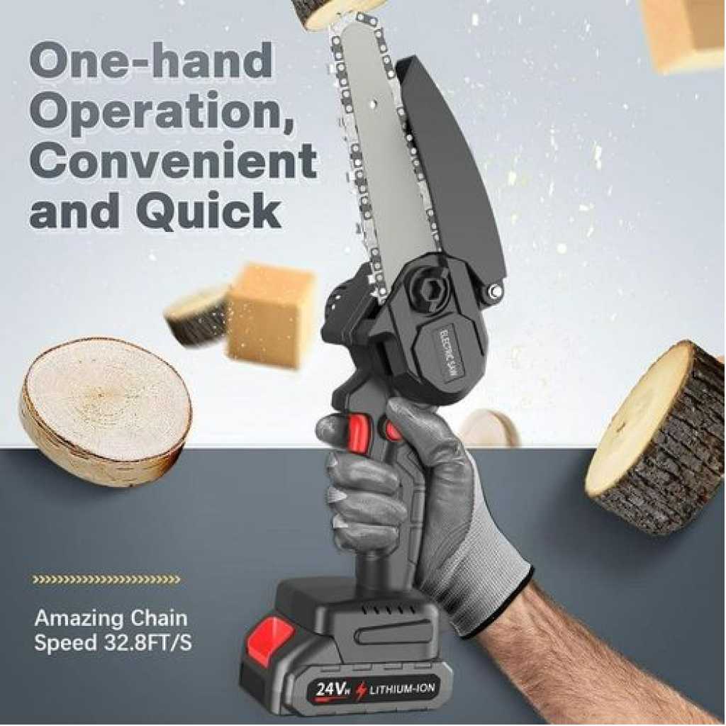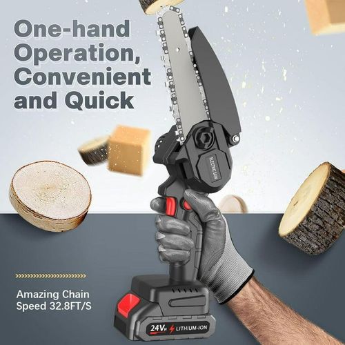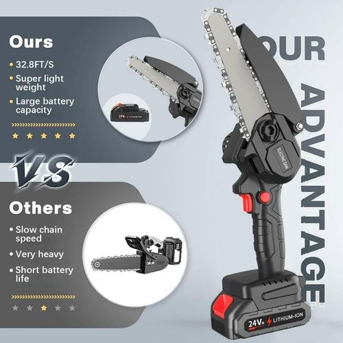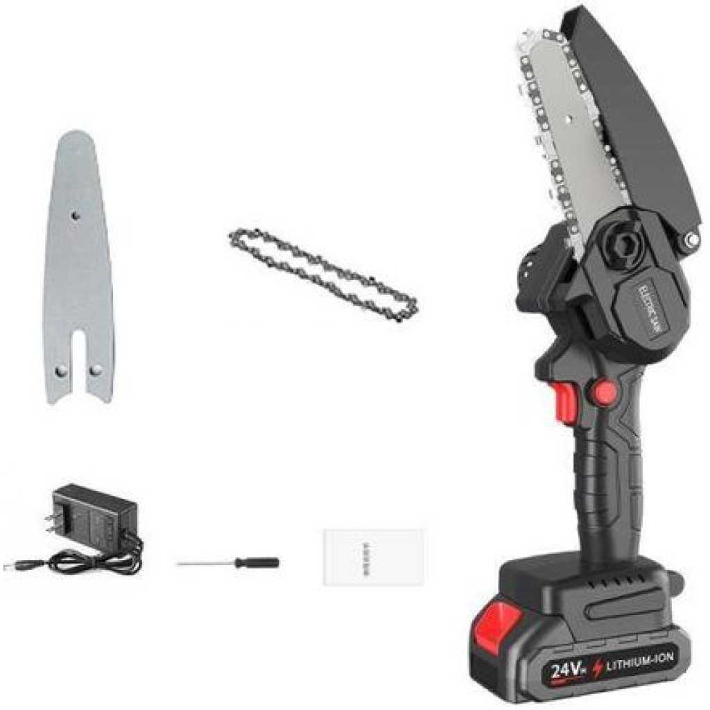 Key Features: Power Tools Mini 24V Battery-Powered Cordless Chainsaw, Portable Electric Pruning Chain Saws with 2 Batteries 2 Chains, Cordless Handheld Chain Saw Wood Cutter Pruning Shears for Tree Branches, Courtyard, Patio, Woodworking Garden Tools- Black Cordless design, lightweight and portable, easy to carry out and cutting the wood. Adopts a brush motor, quick-start, timely braking, smooth speed regulation in a wide range, relatively simple control of the circuit and so on. Ergonomic handle design, one-hand use, long time griping will not tire hands. With high working efficiency, high positioning accuracy, and low noise. 5m/s quickly cutting speed, practical, low power consumption, high stability, and high performance.