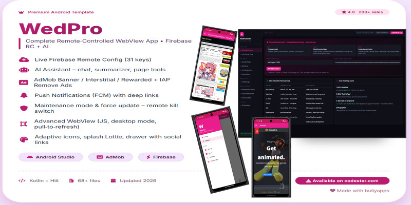 Powerful Android WebView template. Powerful Android WebView template with live admin panel via Firebase, AI assistant, AdMob, push notifications & more.