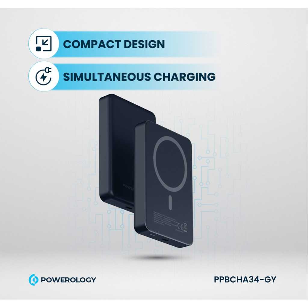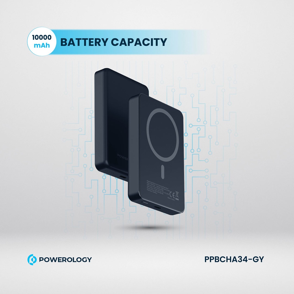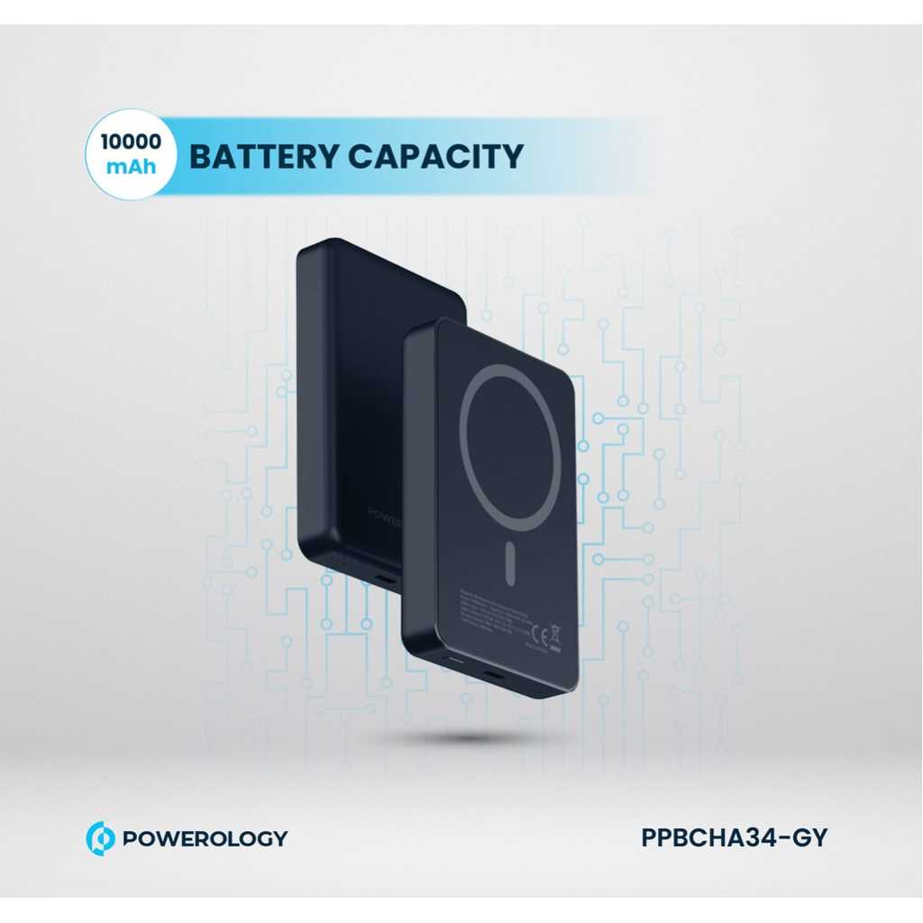 Powerology Magsafe Power Banks, 10000mAh MagSafe Aluminum Power Bank, Compact Design, Simultaneous Charging, Type C Input, PD 20W, Titanium | PPBCHA34-TI PPBCHA34-TI The Powerology 10000mAh MagSafe Aluminum Power Bank is designed to provide reliable power in a compact and portable form. Equipped with a 10000mAh battery capacity, it offers both USB-C and wireless outputs, ensuring fast and efficient charging for a variety of devices. The USB-C output delivers up to 20W Power Delivery, while the wireless charging feature supports up to 15W, making it ideal for those who need both wired and wireless options. Its compact design, measuring just 105 x 67 x 16 mm, makes it easy to carry, while the simultaneous charging capability allows you to charge two devices at once with a total output of 10W.