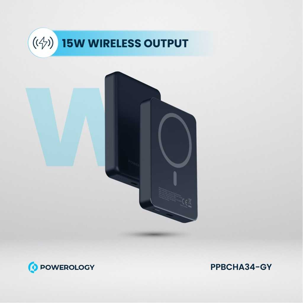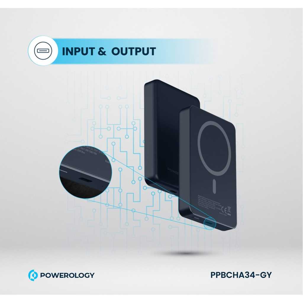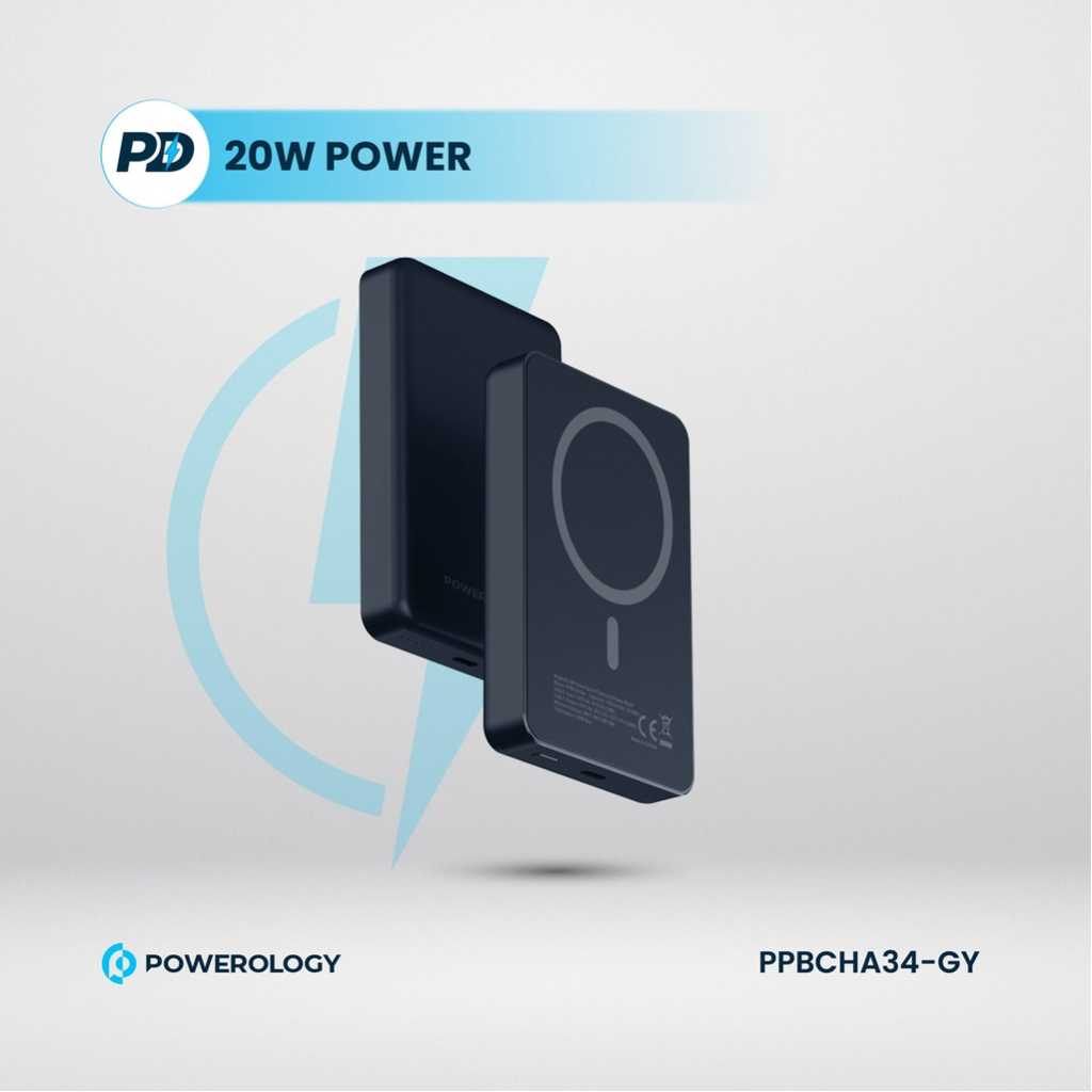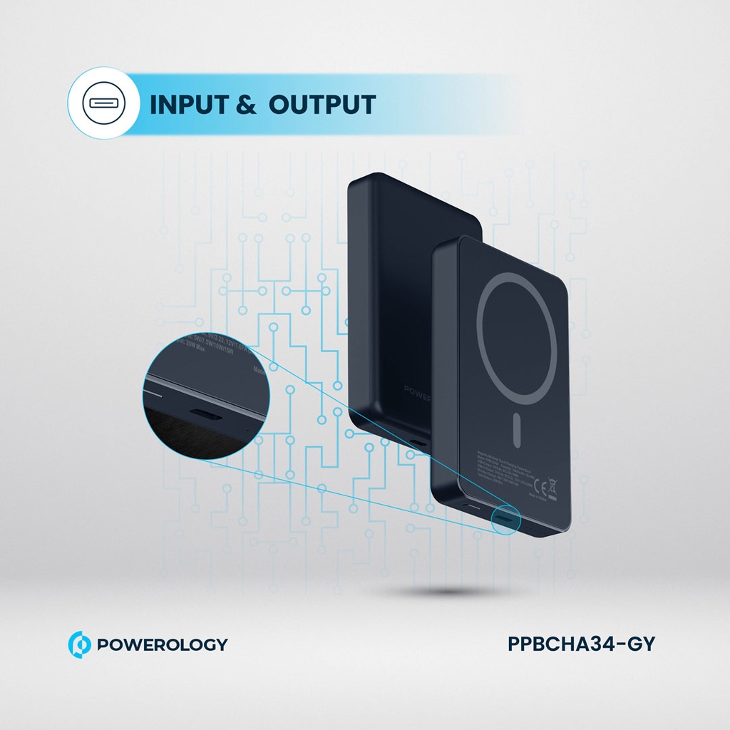 Powerology Magsafe Power Banks, 10000mAh MagSafe Aluminum Power Bank, Compact Design, Simultaneous Charging, Type C Input, PD 20W, Titanium | PPBCHA34-TI PPBCHA34-TI The Powerology 10000mAh MagSafe Aluminum Power Bank is designed to provide reliable power in a compact and portable form. Equipped with a 10000mAh battery capacity, it offers both USB-C and wireless outputs, ensuring fast and efficient charging for a variety of devices. The USB-C output delivers up to 20W Power Delivery, while the wireless charging feature supports up to 15W, making it ideal for those who need both wired and wireless options. Its compact design, measuring just 105 x 67 x 16 mm, makes it easy to carry, while the simultaneous charging capability allows you to charge two devices at once with a total output of 10W.