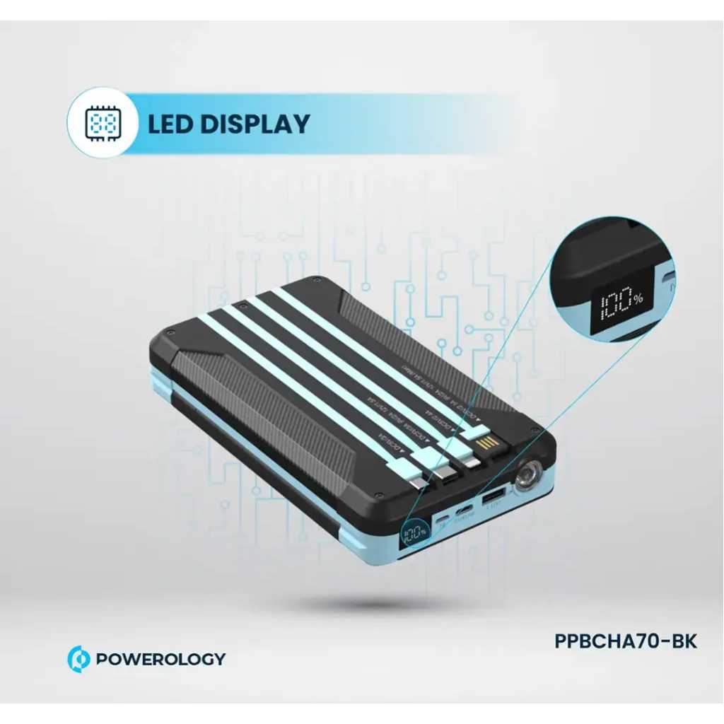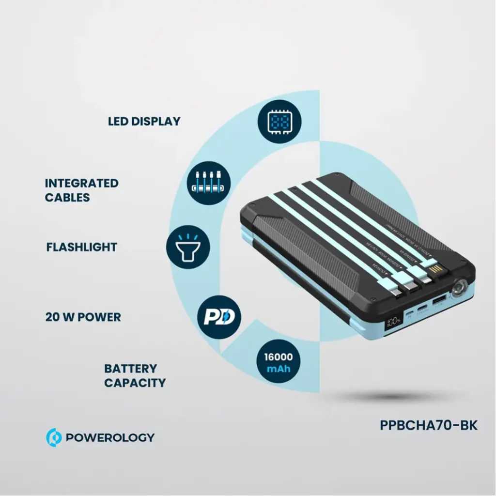The Powerology 16000mAh Solar Power device is a versatile, all-in-one gadget combining essential features for outdoor and emergency use. It offers a robust 16000mAh battery capacity, delivering 59.2Wh of power at 3.7V, making it suitable for charging devices on the go. The device supports wireless output at 2.5W, ideal for charging smartwatches, and offers FM radio functionality covering frequencies from 87.5 to 108MHz. Equipped with a 2-watt LED light and an additional emergency light, it ensures visibility in low-light conditions. Other features include an LED digital clock, an integrated cable, a 3-watt speaker, and Bluetooth V5.3 connectivity. The device also supports 20W PD for fast charging, making it a comprehensive tool for various needs.