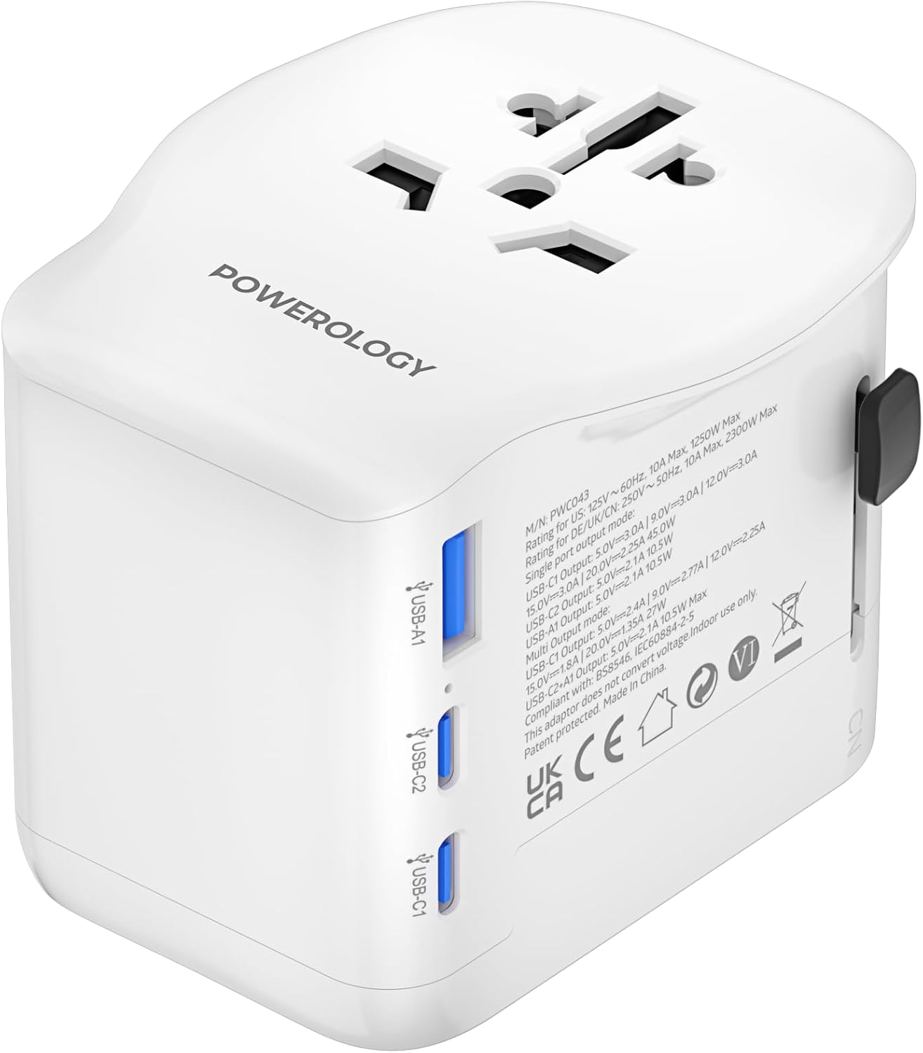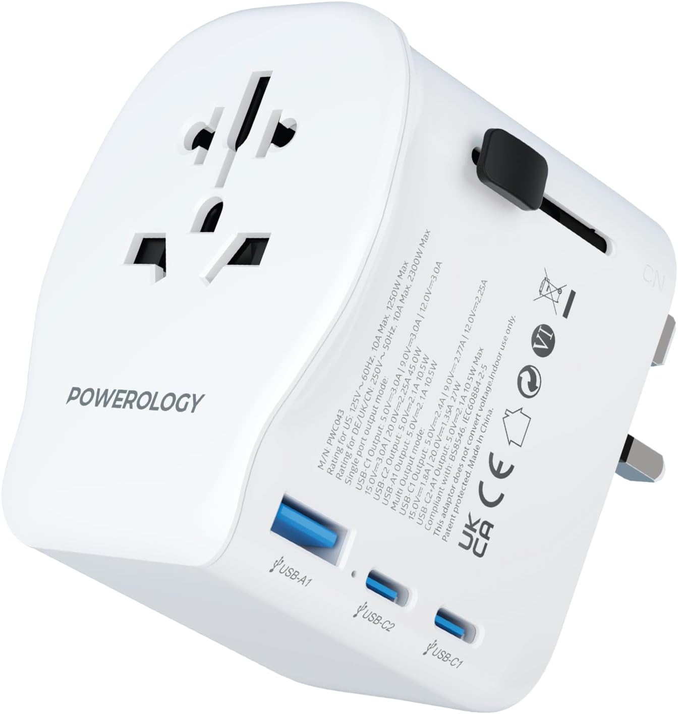 Key Features: 【 】Compatible with outlets in over 150 countries, making it perfect for international travel. 【 】Delivers a robust 2300W output, ideal for powering multiple devices simultaneously. 【 】Includes 45W PD USB-C output for rapid charging of smartphones, laptops, and other devices. 【 】Equipped with Earth Grounding Protection to ensure secure use in all environments. 【 】The package includes Powerology 2300W Universal Travel Adapter, a QR Code Card for easy access to the user manual, – , , and a + .