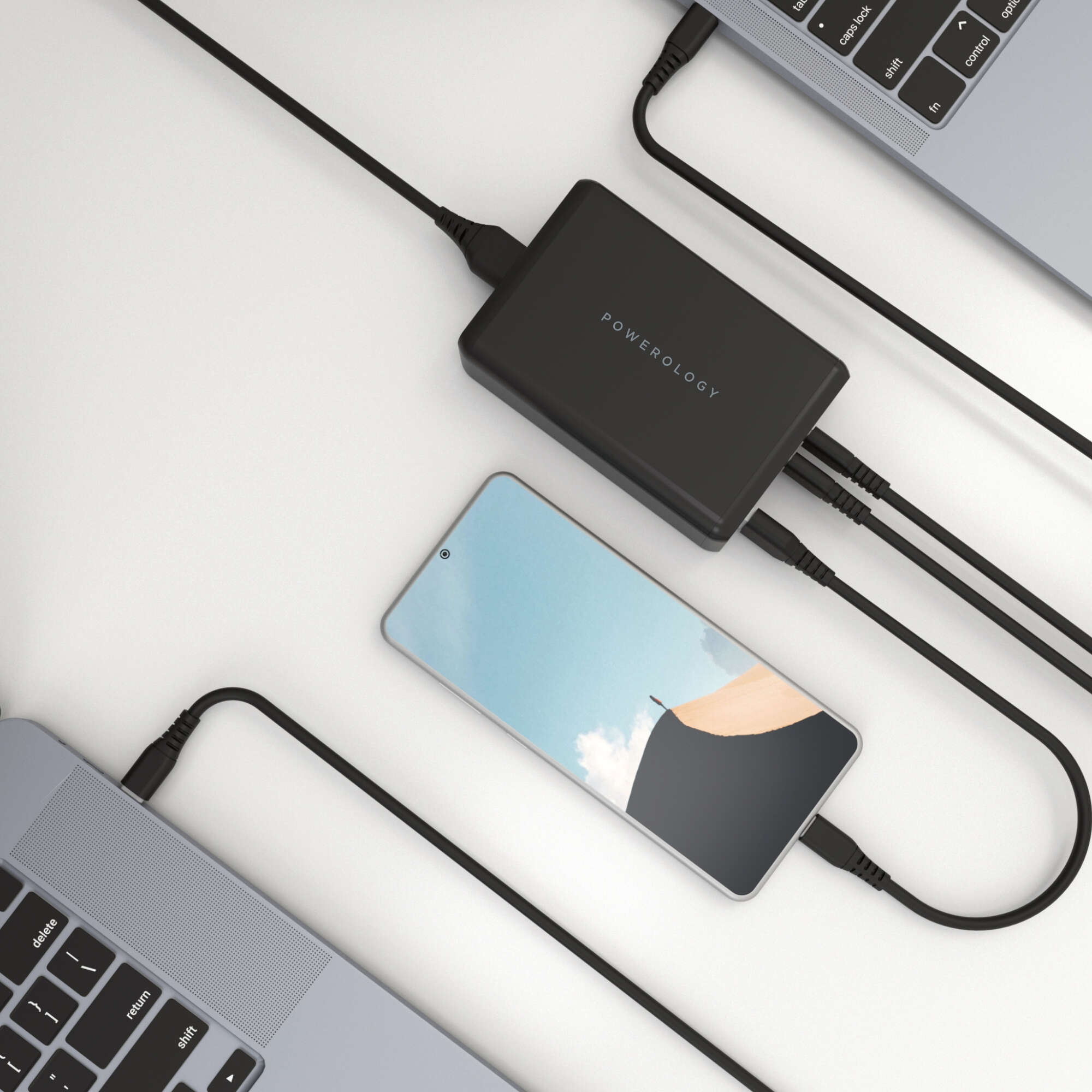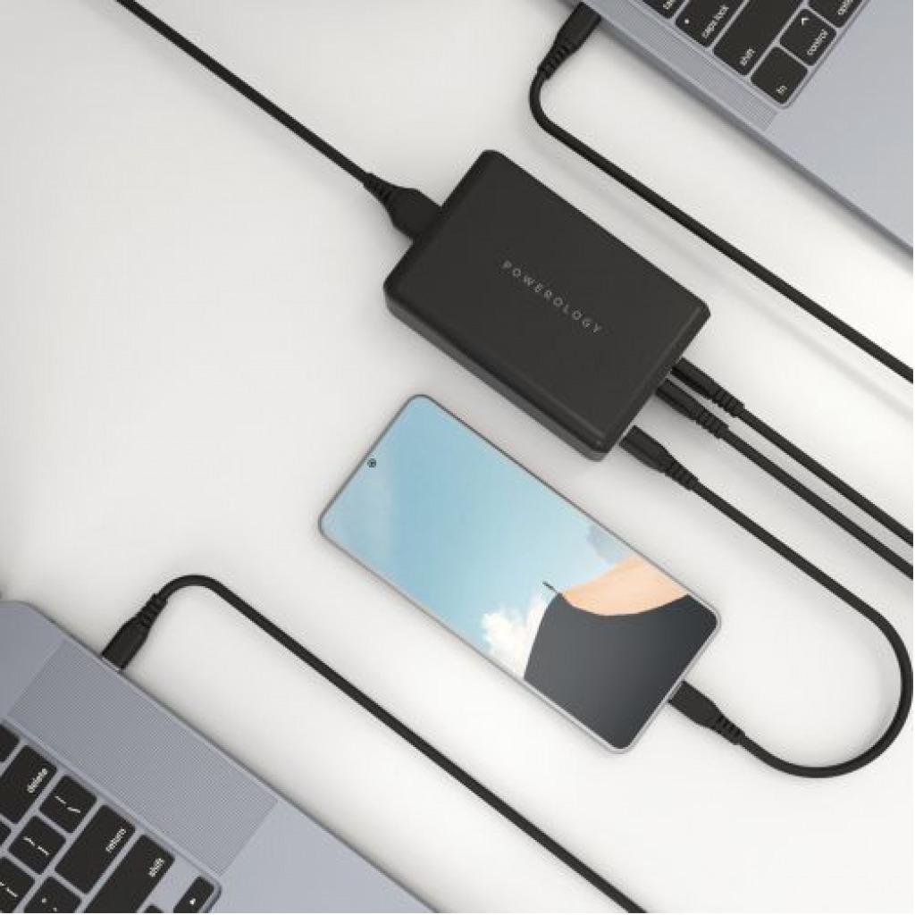 Powerology 75W Laptop Power Bank 4-Port Quick Charge Power Terminal PD – Black. Powerology 4-Output 75W Quick Charge Power Terminal Simultaneous Fast-Charging for Laptops and Phone -Charge Time Depend On Device And Usage -Charges Macbook Pro and Macbook Air -Charge 0%-60% in 35 Minutes* -1.5m Power Cable Key Features: Powerology 75W Laptop Power Bank 4-Port Quick Charge Power Terminal PD – Black. -Charge Time Depend On Device And Usage -Charges Windows & Macbook Laptops. -Charge 0%-60% in 35 Minutes* -1.5m Power Cable – UV Coating – Power Dash 3.0 – Protects you and your device at all times – USB-C / USB-A Charging Port
