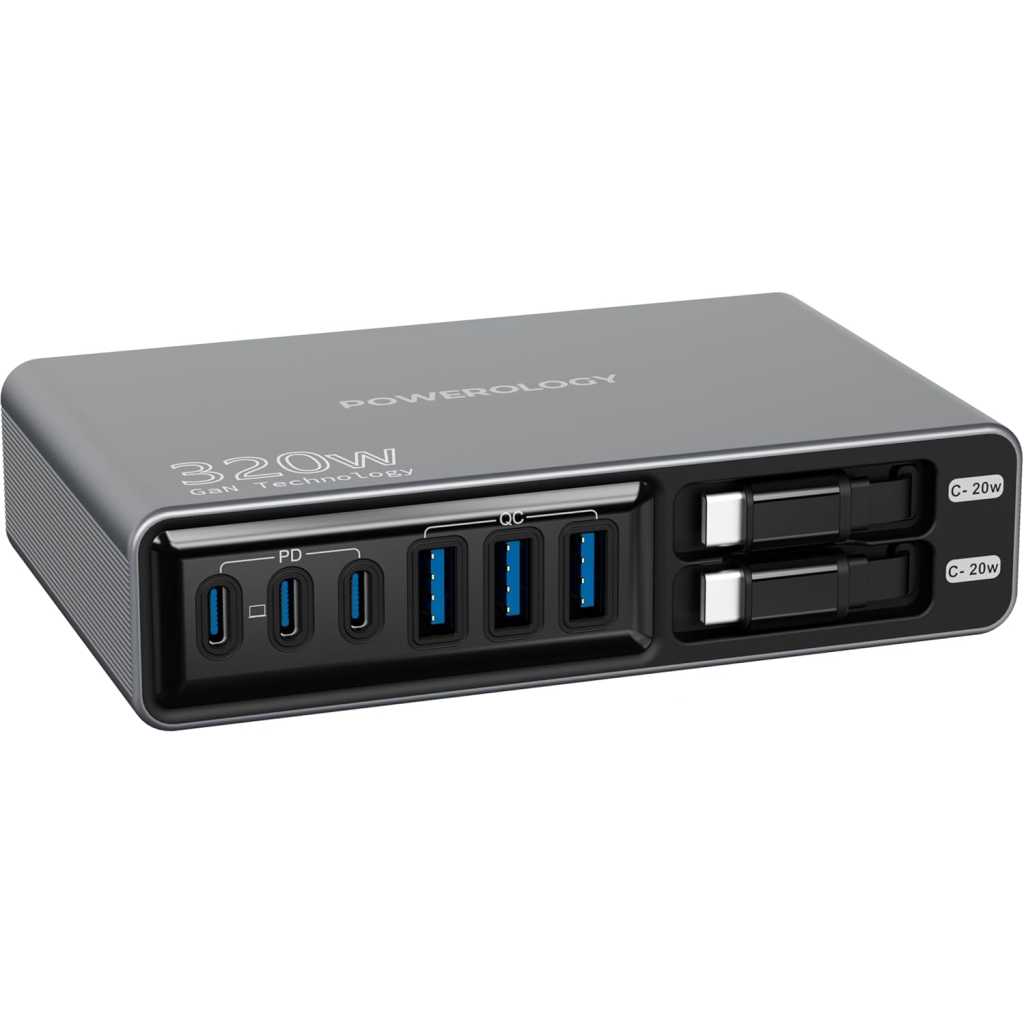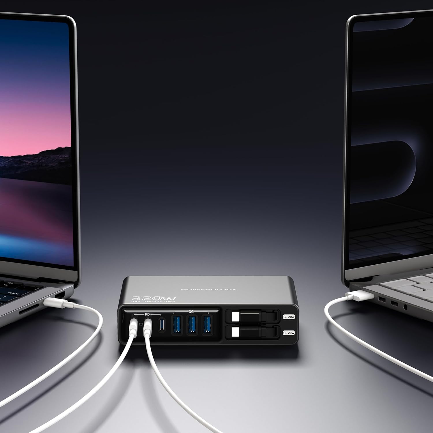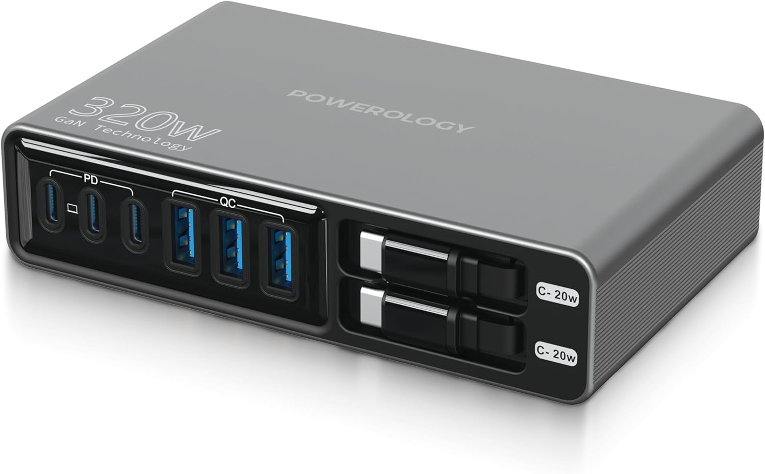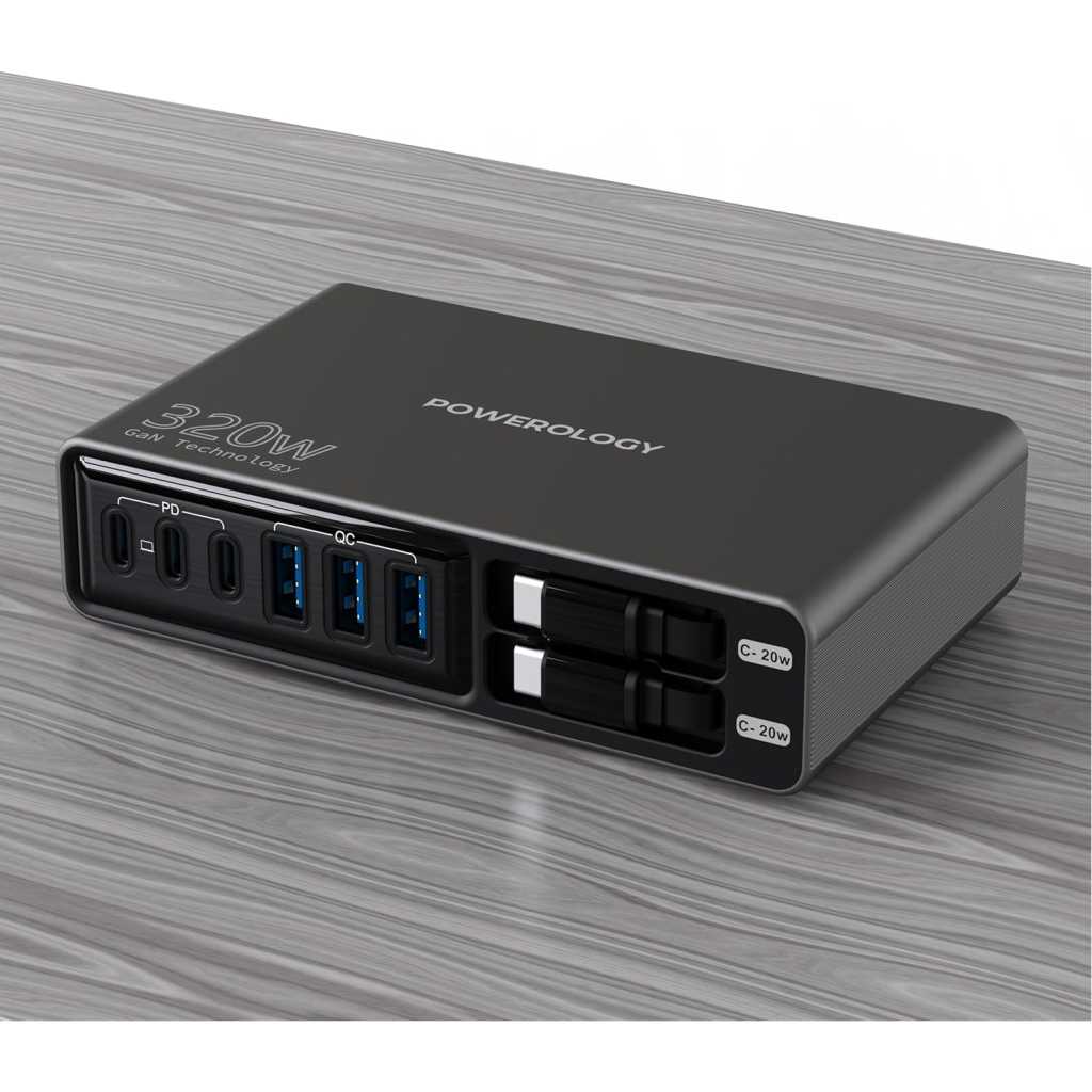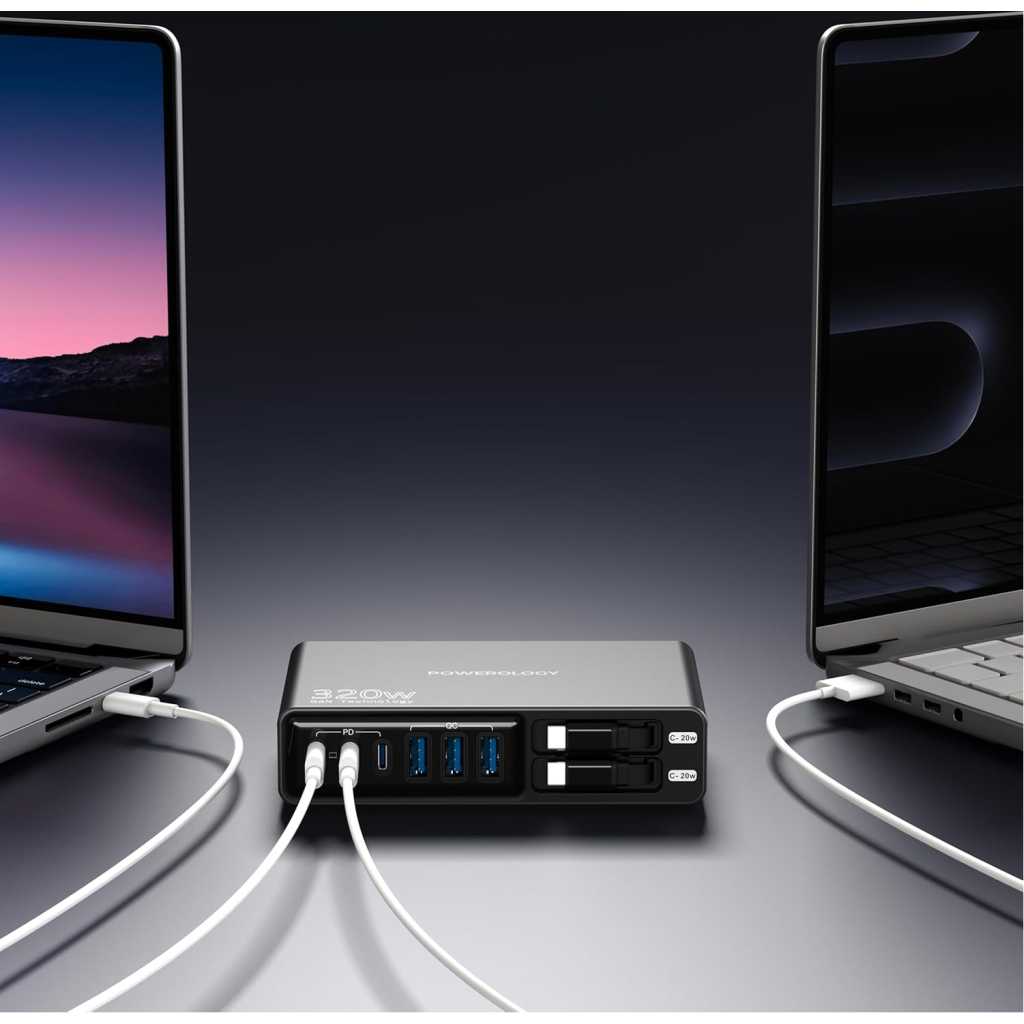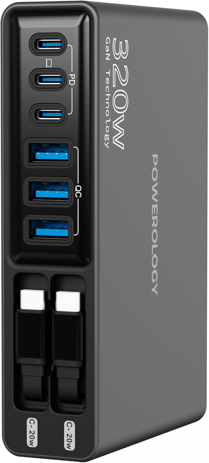 Key Features: 【 】320W GaN technology for faster, more efficient charging in a compact design. 【 】Charges laptops and other high-power devices quickly with 100W PD output. 【- – 】Two built-in Type-C cables for easy, tangle-free charging on the go. 【 】Ensures safe, efficient charging by adjusting power distribution. 【- 】Charge up to 6 devices simultaneously with 3 USB-C and 3 USB-A ports. 【 】The package includes Powerology Univo 320W GaN Charging Station, a QR Code Card for easy access to the user manual, – , , and a + .