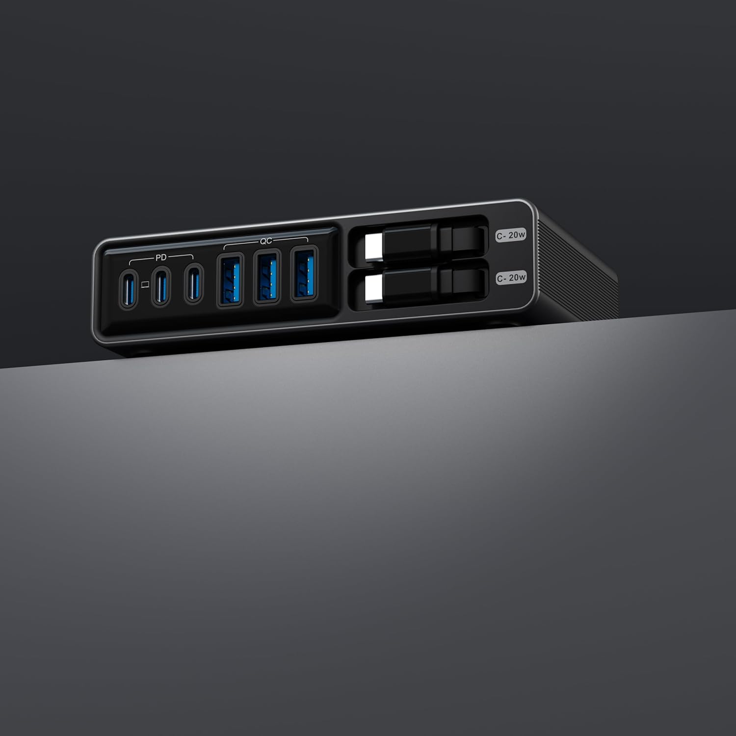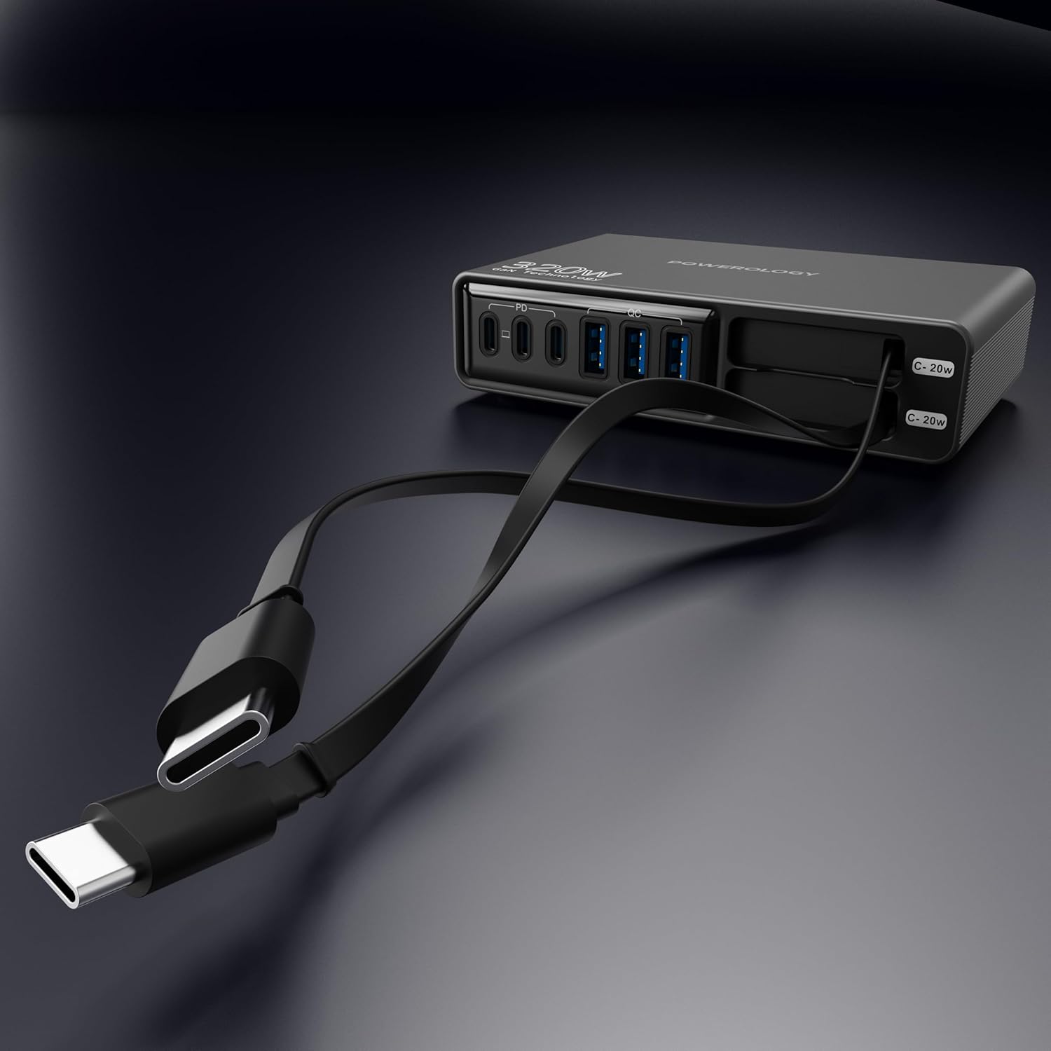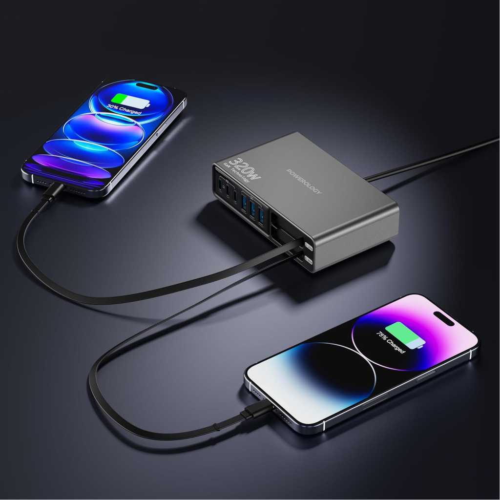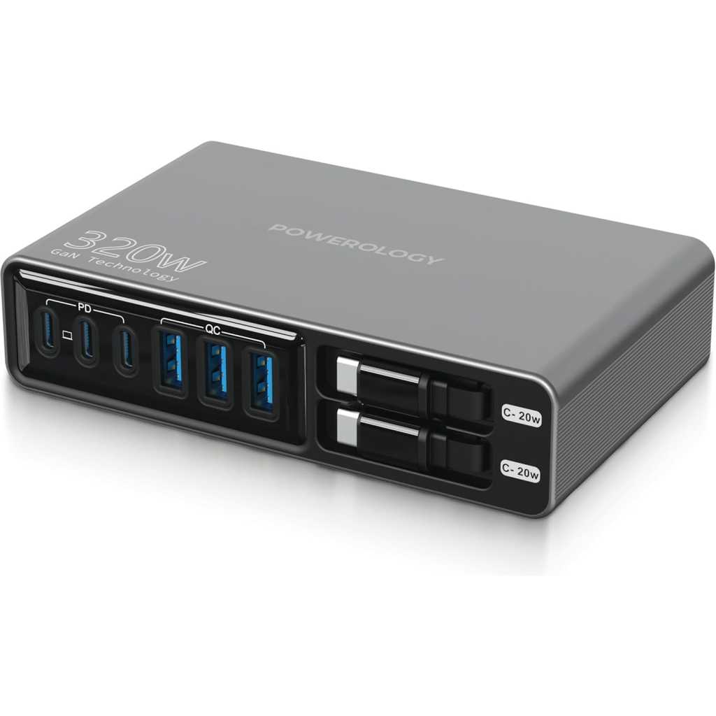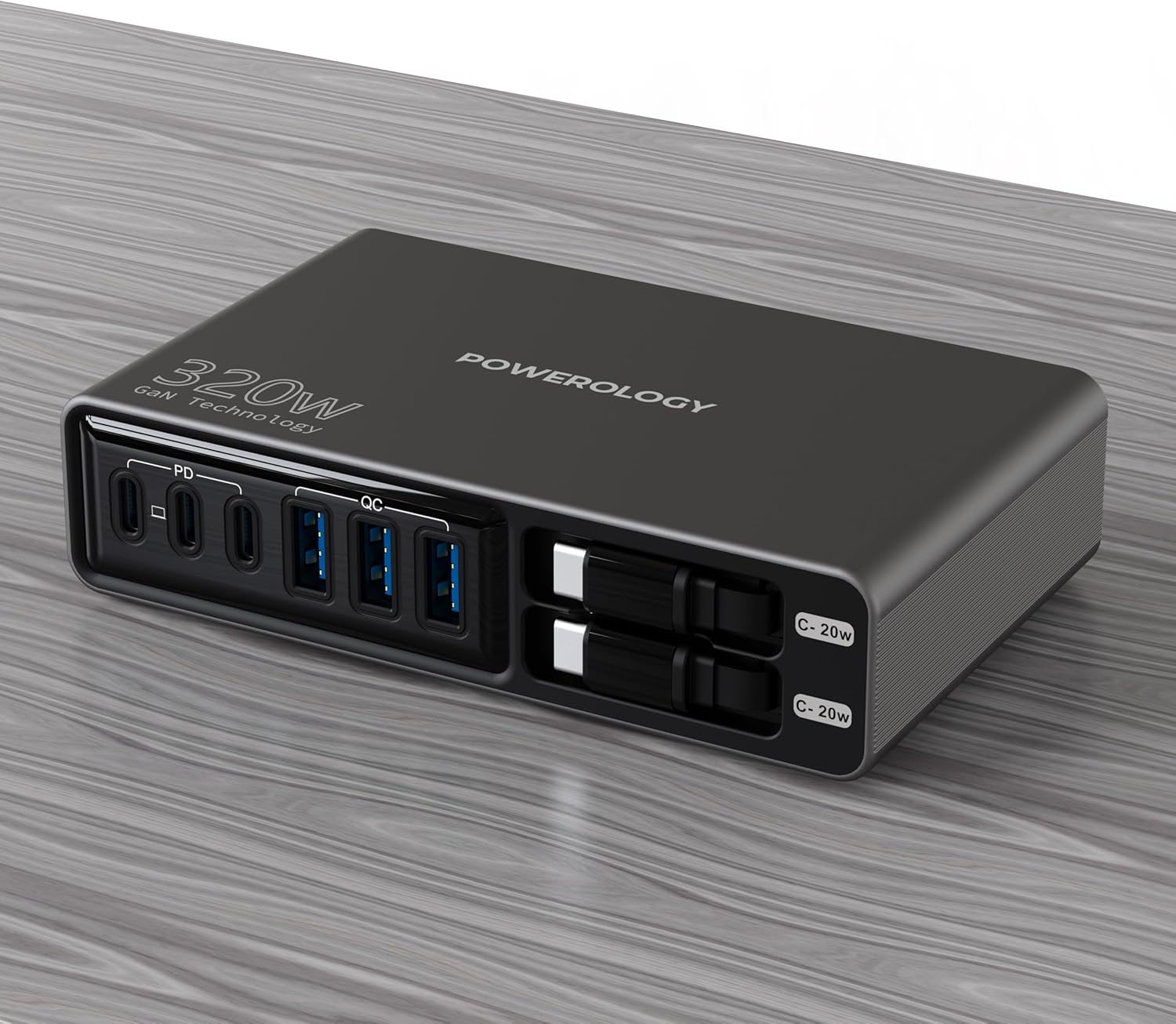 Key Features: 【 】320W GaN technology for faster, more efficient charging in a compact design. 【 】Charges laptops and other high-power devices quickly with 100W PD output. 【- – 】Two built-in Type-C cables for easy, tangle-free charging on the go. 【 】Ensures safe, efficient charging by adjusting power distribution. 【- 】Charge up to 6 devices simultaneously with 3 USB-C and 3 USB-A ports. 【 】The package includes Powerology Univo 320W GaN Charging Station, a QR Code Card for easy access to the user manual, – , , and a + .