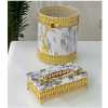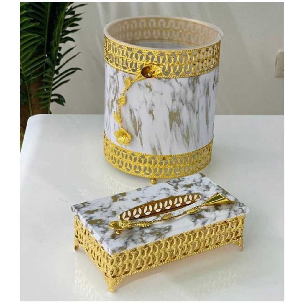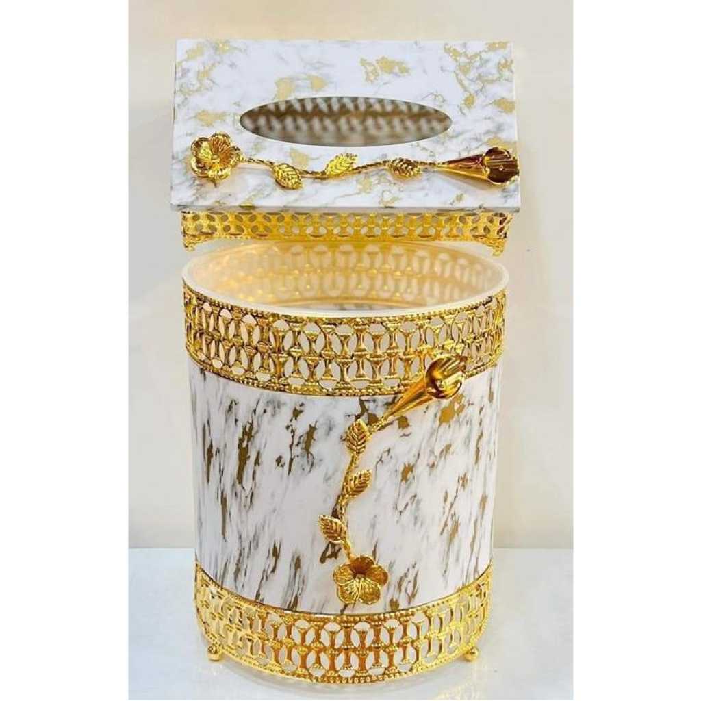 Premium Plastic Tissue Holder Box And Trash Bin Dustbin Set Dustbins are used as waste basket for dry waste like papers and office waste. This Dustbin and tissue box set is decorated with a stone lace. Keep your house clean and tidy with this presentable fancy designed dustbin and tissue box set. The dustbin is in a cylindrical shape accompanied with a square shaped tissue box. Contains a dustbin and a matching tissue box. Lightweight. Increase the beauty of your home with this set. product dimensions: Dustbin (29.5×20)cm, Tissue box (26.5×13.5×8.5)cm Key Features: Premium Plastic Tissue Holder Box And Trash Bin Dustbin Set Tissue box with elegant and deluxe appearance. Suitable for general household, café, hotel, restaurant and used in car for decoration and daily use. Easy to take tissue out from the hole and can be used time and time again Trash used tissue papers in a luxury way in a similar designed metallic trash bin.