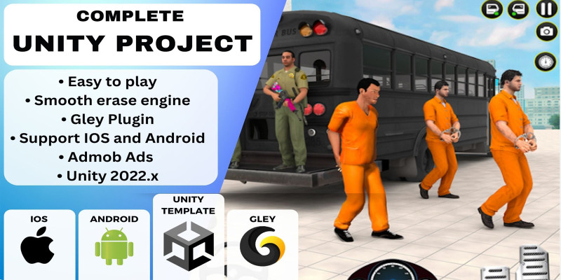 Prison Bus Simulator - Unity And Gley. Drive a prison bus, transport criminals safely, and avoid dangerous obstacles in this intense game