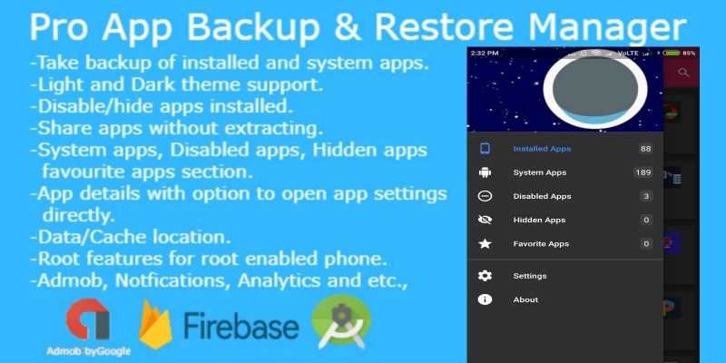 Pro App Backup - Android Source Code. Pro App backup and Restore with root features + Admob + Analytics + Push Notifications