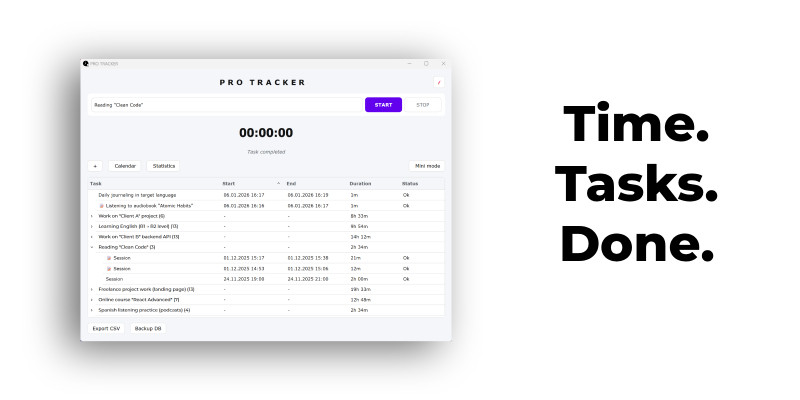Pro Tracker - Time Tracker Python. A sleek, privacy-first desktop time tracker for freelancers. Local storage, offline-ready & Python source code included.