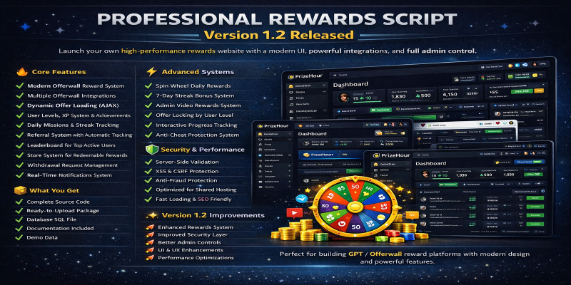 Professional Rewards Script Bundle. A modern Offerwall Reward Script with tasks, levels, referrals, leaderboard, withdrawals, and full admin control.
