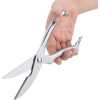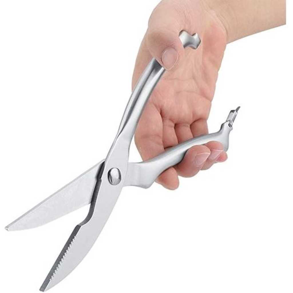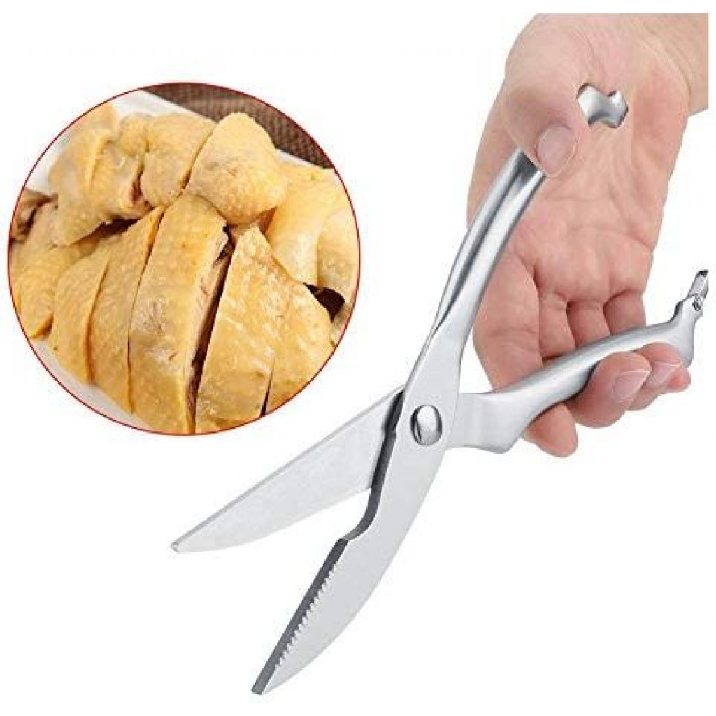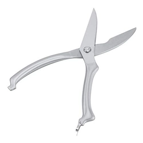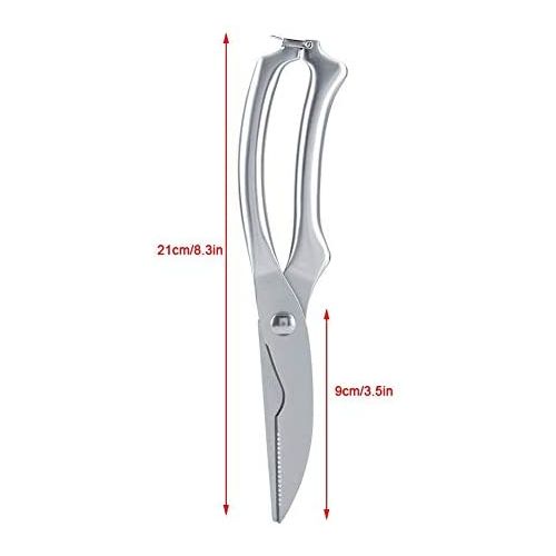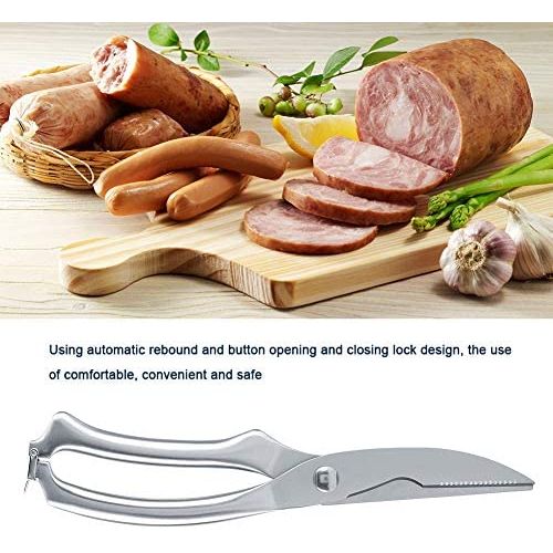 Professional kitchen meat scissors 【Sturdy and Durable】Made from high quality food grade stainless steel, this chicken bone scissors is highly hard and has a strong rust and corrosion resistance. 【Super sharp】The stainless steel blade is sharp enough to cut meat and bone quickly, saving you kitchen preparation time. 【Safety Lock Design】Using automatic rebound and button opening and closing lock design, convenient to use. The safety lock makes this kitchen cutting scissors completely closed while not in use, which ensures safe and better storage. 【Unique Design】Concave on lower jaw is for cutting tree shape object and cartilage objects, such as chicken foot bone. 【Multifunctional Shears】This professional poultry scissors is great for cutting meat, turkey, poultry, vegetables, fish, seafood, chicken wings, bones, crab, herbs and fish scale scraping, etc.