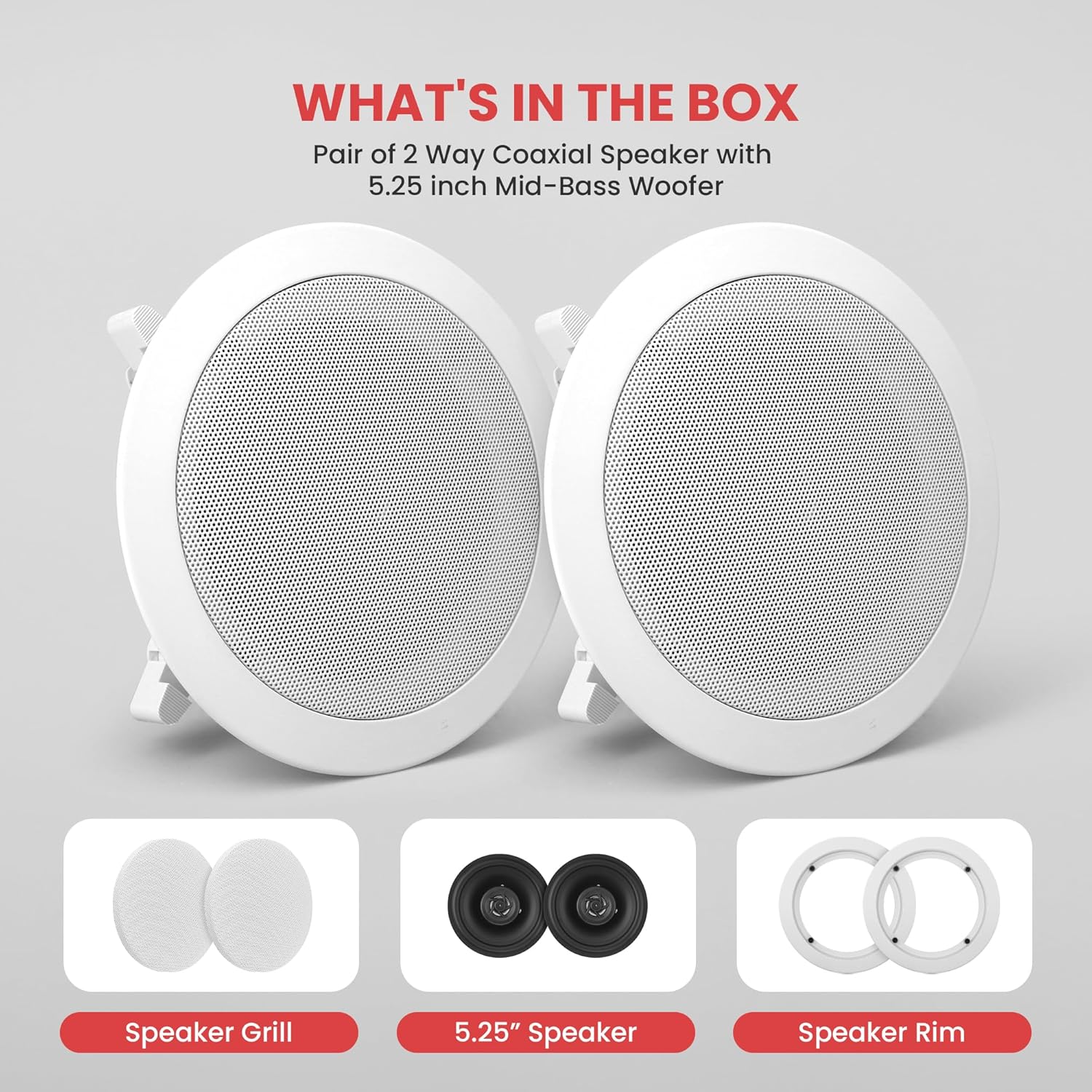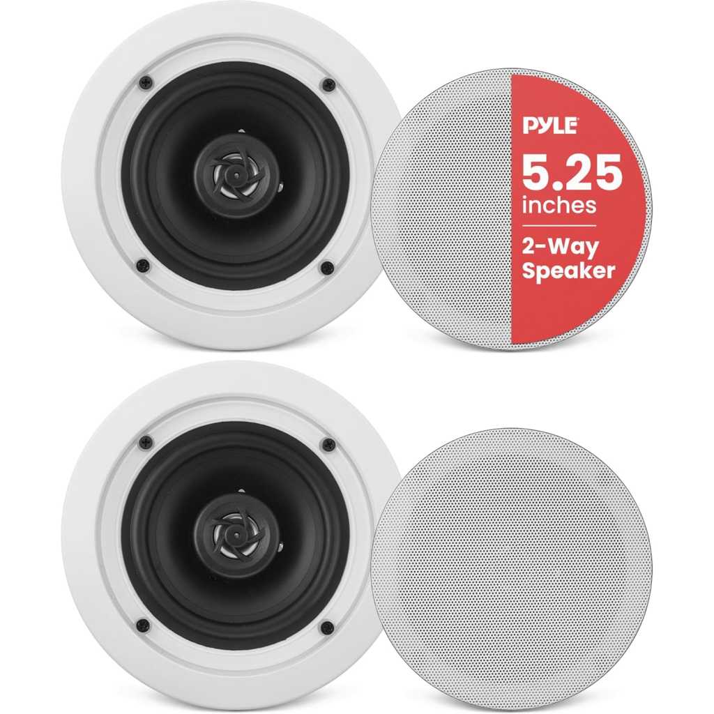80Hz – 20kHz FREQUENCY RESPONSE: Pyle 5.25” speaker system has a directable 1” polymer dome tweeter and frequency response. This flush mount speaker is pack with exceptional 4-8 ohm impedance rating and impressive 150 watts power handling capability 2-WAY MOUNT SPEAKER: The pair of 5.25” stereo sound speaker has two way of installation: in-wall or in-ceiling flush mount. It has convenient speaker terminals that allow for quick and hassle-free speaker wire connection at any custom installations FLUSH MOUNT DESIGN: A pair of flush mount design midbass stereo sound speaker for simple and easy in-wall / in-ceiling installation. The product features 1” high temperature voice coil to produce powerful, rich sound or quiet background music 150 WATTS PEAK: Pyle in-wall speaker system in white were carefully combined to reproduce sound clearly with outstanding responsiveness. It can achieve wide-ranged sound performance speakers secure as well as extending the life of the product EASY INSTALLATION: The product includes cut-out template for easy installation. The measurement for cut-out dimensions 6 1/2” in diameter x 2 5/8” in depth while the overall dimensions measures 8” in diameter x 2 5/8” in depth Key Features: 80Hz – 20kHz FREQUENCY RESPONSE: Pyle 5.25” speaker system has a directable 1” polymer dome tweeter and frequency response. This flush mount speaker is pack with exceptional 4-8 ohm impedance rating and impressive 150 watts power handling capability 2-WAY MOUNT SPEAKER: The pair of 5.25” stereo sound speaker has two way of installation: in-wall or in-ceiling flush mount. It has convenient speaker terminals that allow for quick and hassle-free speaker wire connection at any custom installations FLUSH MOUNT DESIGN: A pair of flush mount design midbass stereo sound speaker for simple and easy in-wall / in-ceiling installation. The product features 1” high temperature voice coil to produce powerful, rich sound or quiet background music 150 WATTS PEAK: Pyle in-wall speaker system in white were carefully combined to reproduce sound clearly with outstanding responsiveness. It can achieve wide-ranged sound performance speakers secure as well as extending the life of the product EASY INSTALLATION: The product includes cut-out template for easy installation. The measurement for cut-out dimensions 6 1/2” in diameter x 2 5/8” in depth while the overall dimensions measures 8” in diameter x 2 5/8” in depth