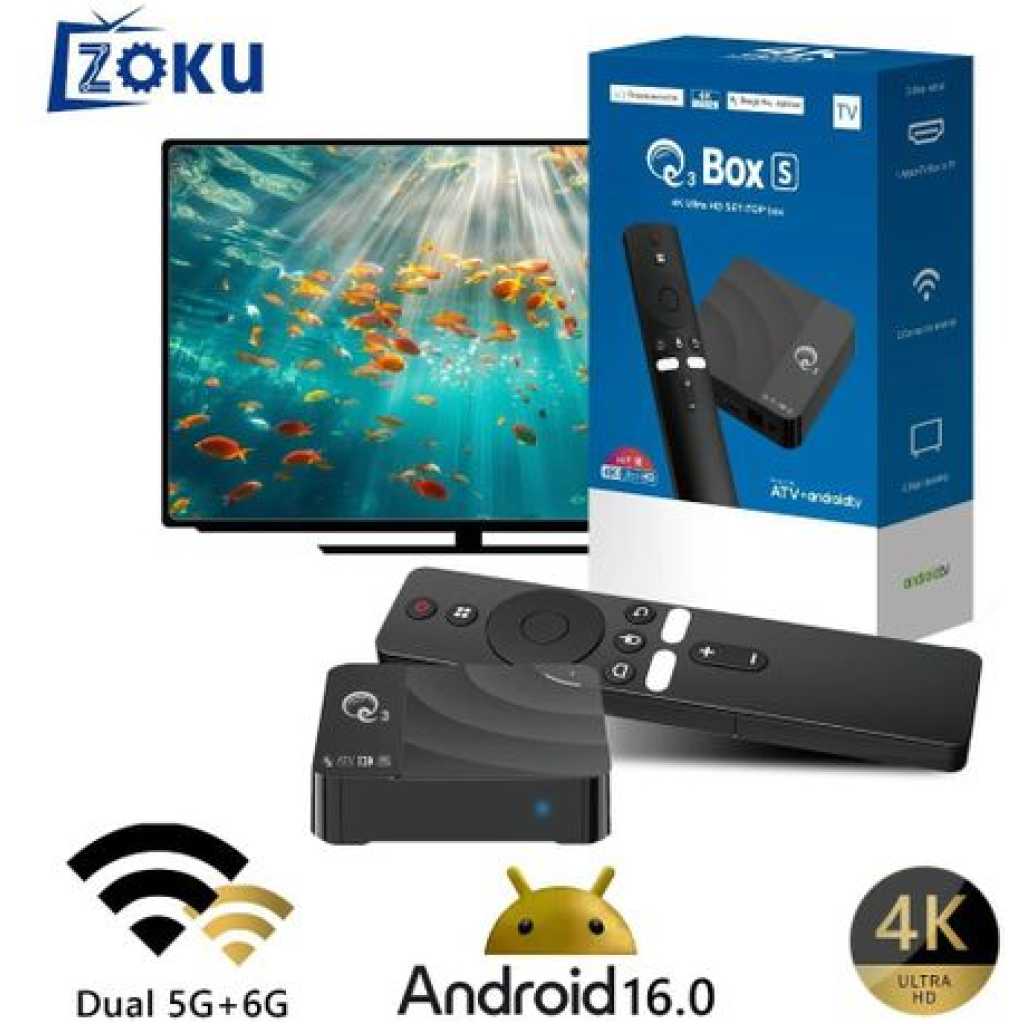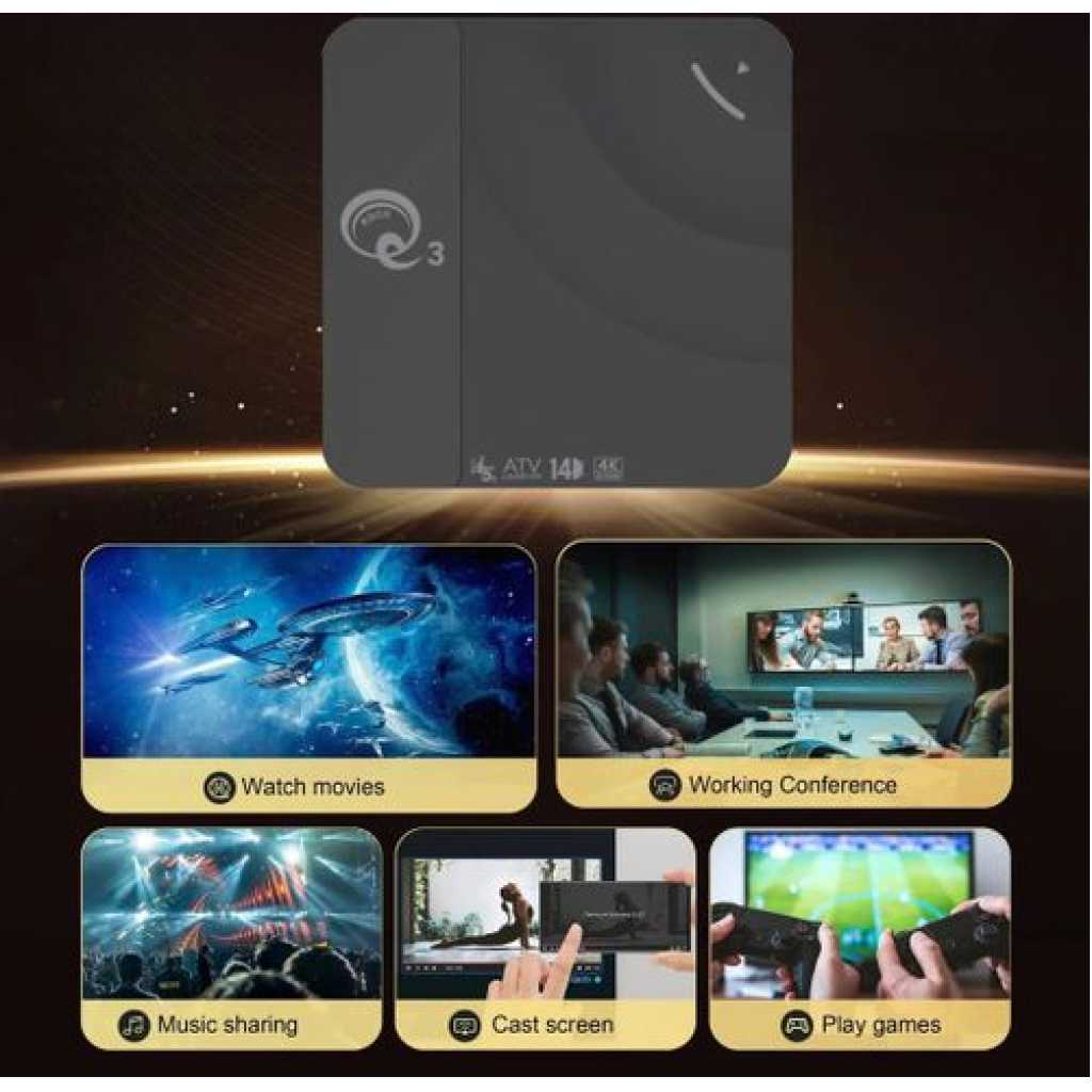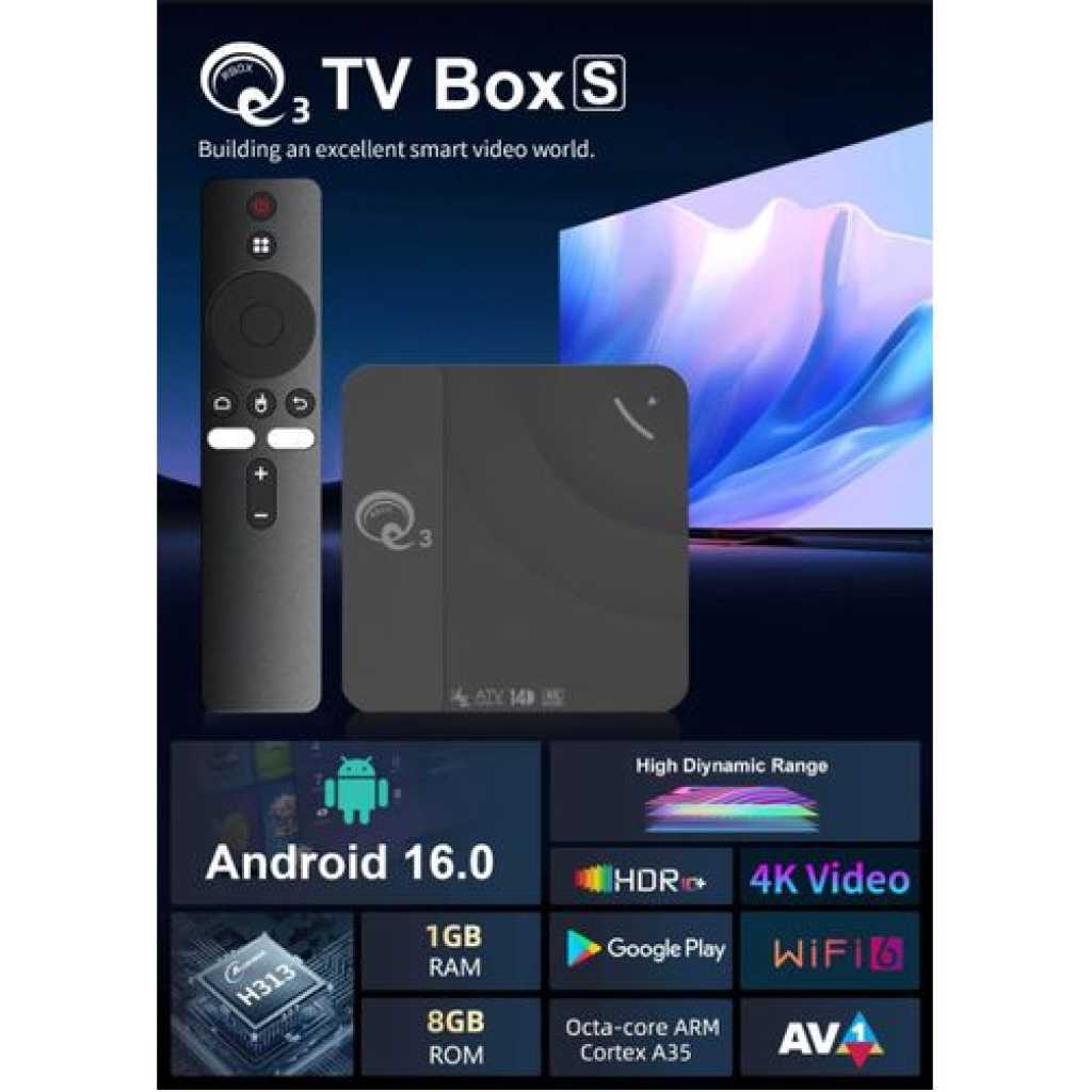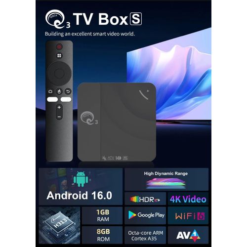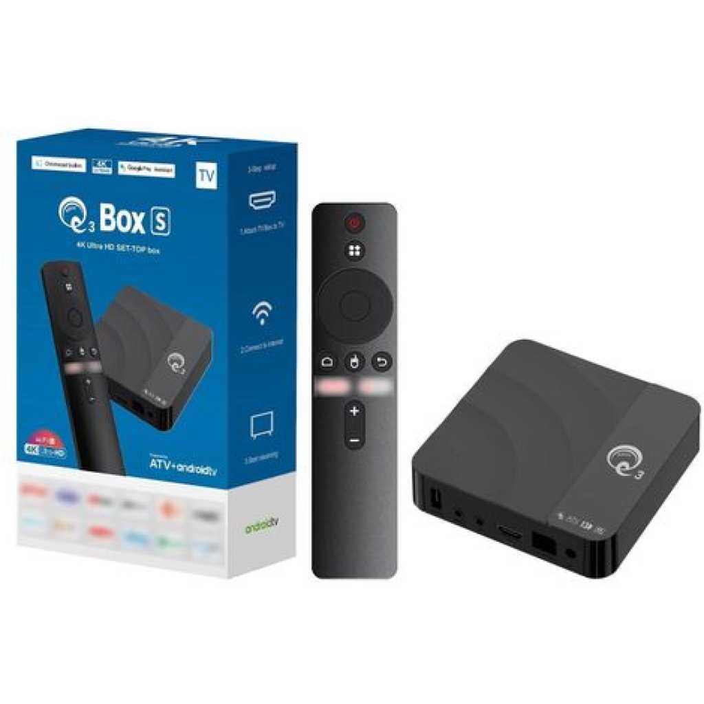 Upgrade your home entertainment with the Q3 Box S Smart Android TV Box 2GB 16GB Android 14, designed to transform any TV into a smart powerhouse. Running on the latest Android 14 OS, this device ensures faster performance, smoother streaming, and access to thousands of apps from Google Play. The Q3 Box S Smart Android TV Box supports 4K Ultra HD resolution, built-in Wi-Fi, Google Assistant, Chromecast, and YouTube integration, delivering endless entertainment options in stunning quality. Compact and user-friendly, it’s the perfect solution for families, gamers, and binge-watchers in Sri Lanka. Key Features Powered by Android 14 – Smooth, updated interface with latest features. 2GB RAM + 16GB Storage – Fast processing and storage for apps & media. 4K Ultra HD Resolution – Crisp, clear picture for immersive viewing. Google Play & YouTube Support – Access thousands of apps and videos. Built-in Wi-Fi – Stream content seamlessly. Voice Remote Control – Hands-free navigation with Google Assistant. Product Specifications Model: Q3 Box S Android TV Box Operating System: Android 14 RAM/Storage: 2GB RAM + 16GB ROM Resolution: 4K Ultra HD support Connectivity: Built-in Wi-Fi, HDMI, USB ports Smart Features: Google Play, YouTube, Google Assistant Control: Voice remote included Applications: Movies, gaming, online streaming, education, video calls Wireless interfaces: Bluetooth, Wi-Fi Wi-Fi standard: 802.11a Wi-Fi frequency range: 2.4 GHz Interfaces: component video output HDMI version: 2.0 Processor/Chipset: Amlogic S905W Package Includes 1 × Q3 Box S TV Box 1 × Voice Remote Control 1 × HDMI Cable 1 × Power Adapter 1 × User Manual