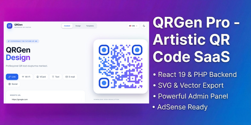 QRGen Pro - Artistic QR Code SaaS. Transform standard QR codes into branded masterpieces with React 19, SVG export, and a powerful PHP admin panel.