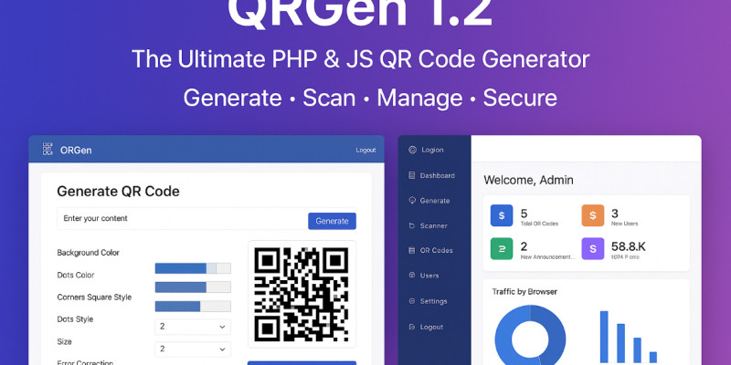 QRGen - Professional QR Code Generator. Complete QR code solution with generator, scanner, admin dashboard, analytics, user management and API. Bootstrap 5 design.