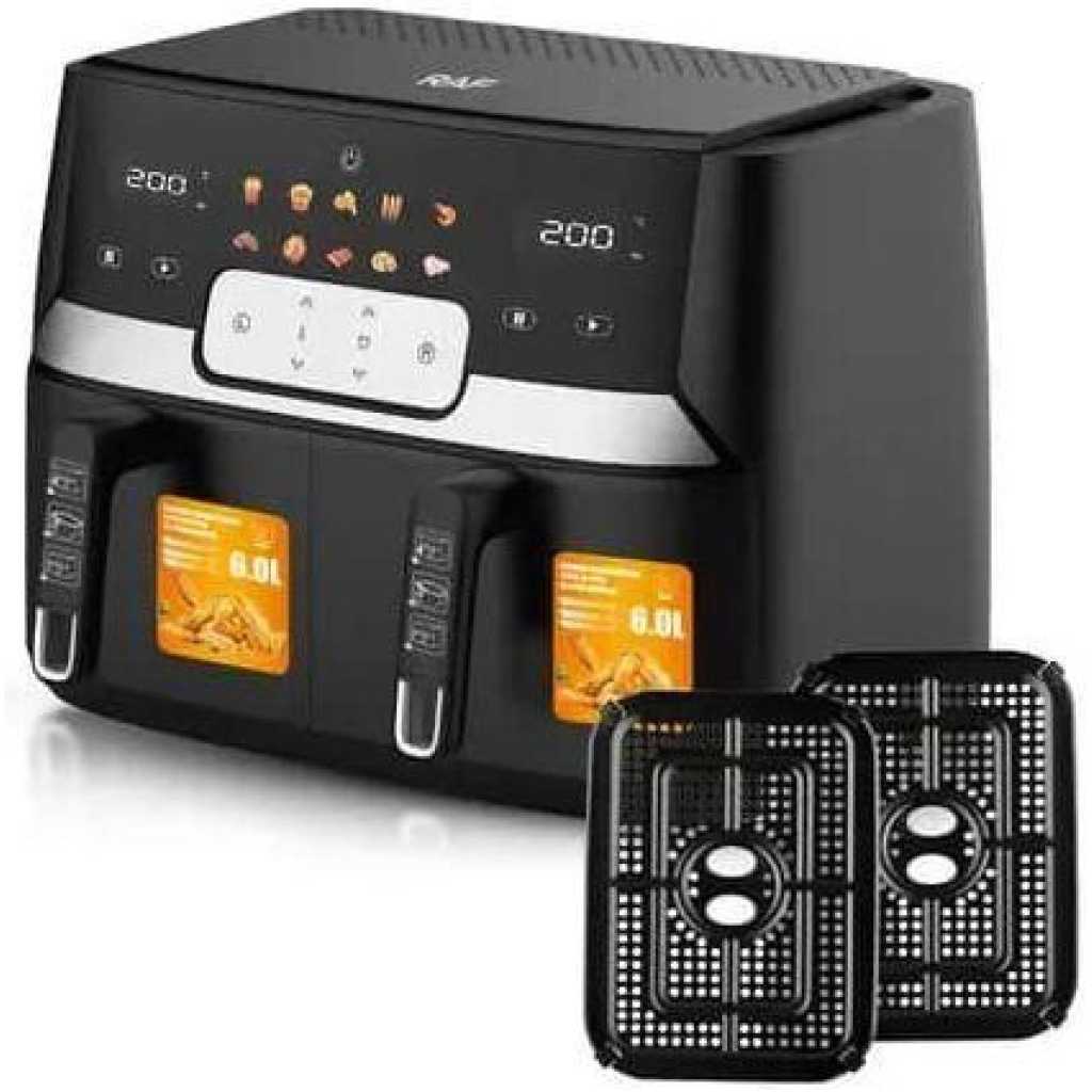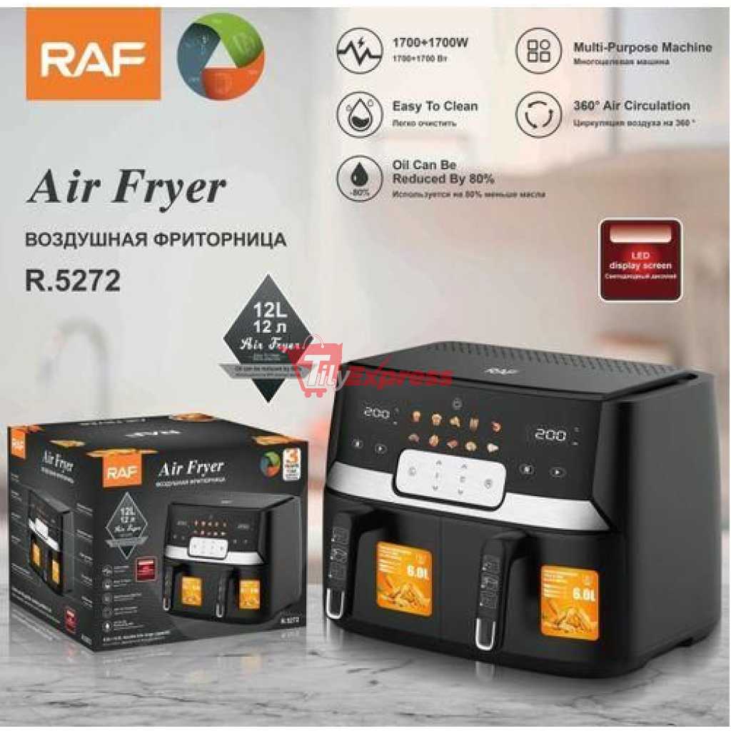RAF 12L Air Fryer With 2 Independent Baskets Grill Oven- Black Who said tasty can’t be healthy? With the use of rapid air technology, the RAF Air Fryer can make some of your favorite snacks completely oil-free. Here is your chance to stay in shape without giving up those delicious snacks you crave so much. Confused on how to make them? Not to worry! Our helpful manual provides examples of a wide variety of dishes that can be prepared with the air fryer and exactly how to make them. Whether you are looking to fry, grill, or bake the Raf Air Fryer is the way to go. The Air Fryer uses 360° air flow technology that creates a crispy texture, with up to 93% less fat than the traditional deep-fry method. A healthy gift for your family members or friends. Premium slick knob and fingerprint-resistant stainless steel material, the greasy stains will be gone with one simple wipe, and all accessories are dishwasher safe. Large Capacity: It can make 3.5 lbs fries at one round, perfect helper for a family of 5–7 or a big gathering. SpecificationsProduct Name Air FryerBrand RAFModel Number R5272 12 liters, double bowl, air fryer, convection oven, 2800W, Digital control panel, RAF Key Features: RAF 12L Air Fryer With 2 Independent Baskets Grill Oven- Black Rated voltage: 220V Rated power: 2800W Volume: 6+6L Material: PP/ABS/PC/PBT/PA66/SUS stainless steel Wire length: 0.9 meters Time: 60 minutes Connector: VDE Plug Unit Weight 7.95 kg Unit Size 42.5*38.5*36.8 cm