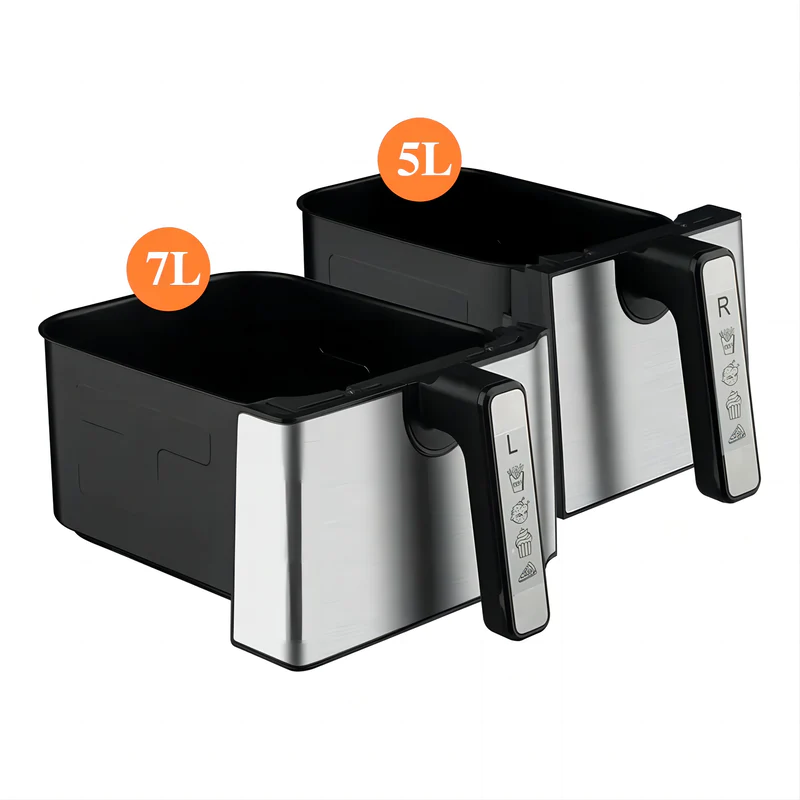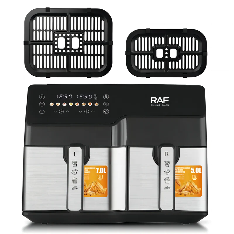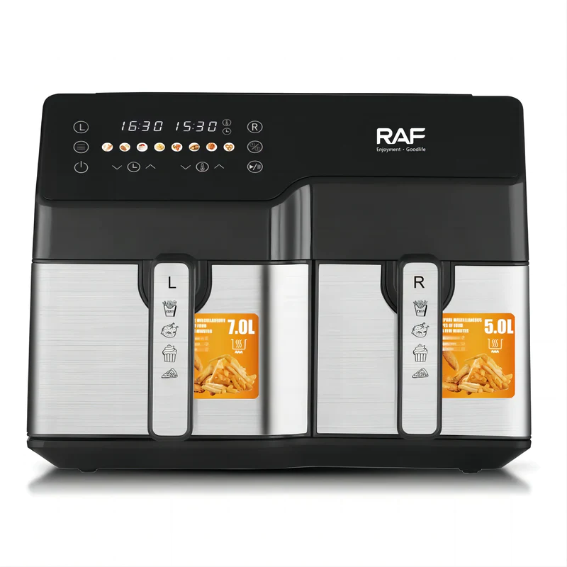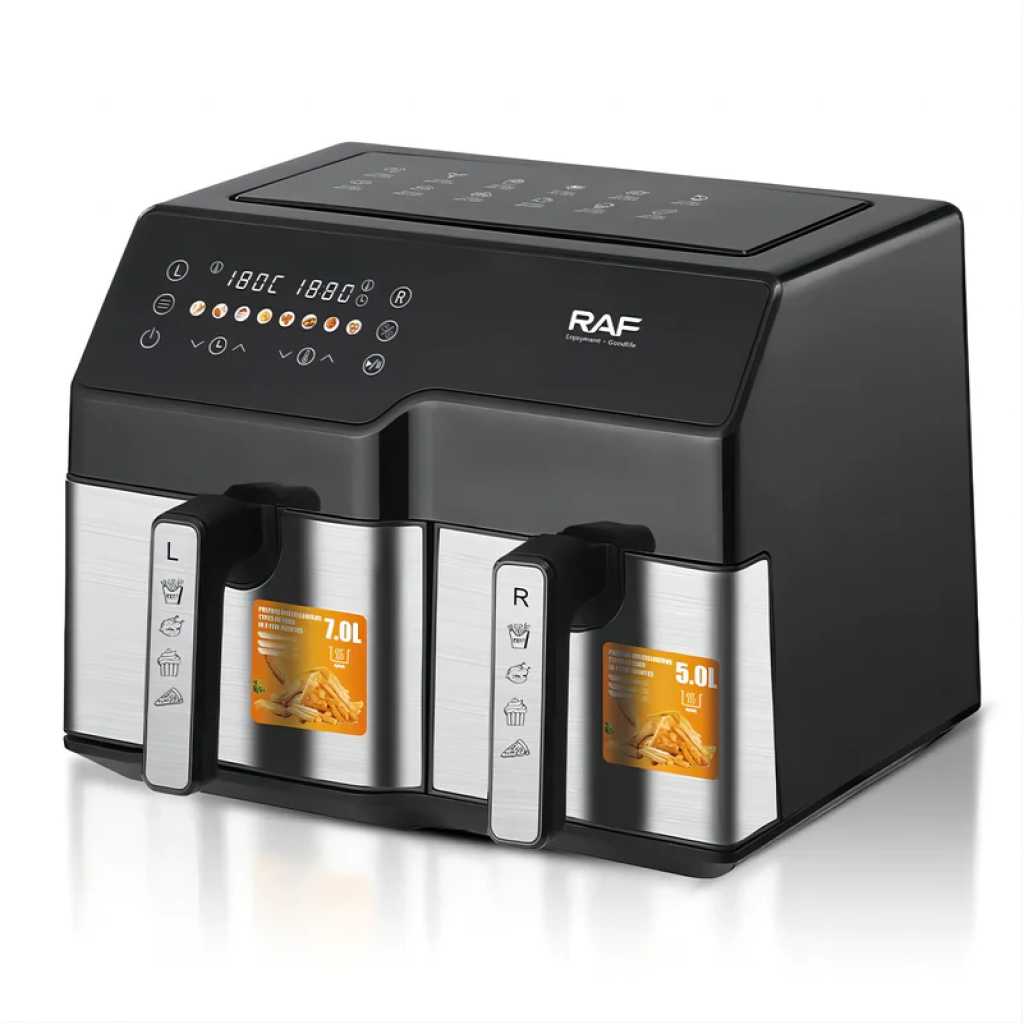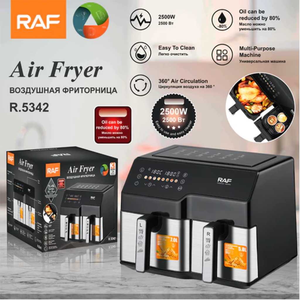 RAF Double Two Dual Zone 2 Basket LCD Display Touch Screen Smart Digital Air Fryer The RAF 12L (7L +5L) air fryer has been designed to make cooking easier and more efficient. Its dual cooking zones, 2 baskets, and digital control panel give you the power to precisely adjust temperatures and timings. The user-friendly LCD touch screen also makes it easy to monitor and adjust settings. Get restaurant-style results with this smart, functional air fryer. 2 FOODS, 2 WAYS TO COOK The air fryer that cooks 2 foods, 2 ways, and finishes at the same time. With 2 separate cooking drawers, you can cook different foods with different temperatures, times and functions – both ready to serve at exactly the same time! Our air fryer convection oven reduces fat by up to 85% compared with traditional frying methods. Toaster-oven-style air fryer with the help of well-designed air duct and high-speed fan so that the super hot air can quickly circulate 360 ° around the food. This allows cooking food more quickly and evenly than traditional oven. The multifunctional machine is not only an air fryer oven, but also a barbecue machine, dehydrator, toaster and oven. You can also adjust the cooking temperature and time to make delicious food that is not included in the presets according to the recipe. The RAF Air Fryer can make some of your favourite snacks completely oil free. Here is your chance to stay in shape without giving up those delicious snacks you crave so much. Confused on how to make them? Not to worry! Our helpful manual provides examples of a wide variety of dishes that can be prepared with the air fryer and exactly how to make them. Whether you are looking to fry, grill or bake, the Raf Air Fryer is the way to go. Highlights: The Air Fryer uses 360° air flow technology that creates a crispy texture, with up to 93% less fat than the traditional deep-fry method. A healthy gift for your family members or friends. Premium slick knob and fingerprint-resistant stainless steel material, the greasy stains will be gone with one simple wipe, and all accessories are dishwasher safe. Large Capacity: It can make 3.5 lbs fries at one round, perfect helper for a family of 5–7 or a big gathering. Specifications 7L + 5L Bowl Capacity Rated power: 1550W + 1250W Volume: 7L + 5L Material: stainless Steel Time: 60 minutes Connector: VDE Plug Rated voltage/frequency :220Y Actual power :2500W Actual volume :7+5L Product specification and material: ABS/PP/ stainless steel Specification and material of power cord: black PVC Length and front color of wire: black/total length 0.95M Product color: See the picture Plug: 250V/16A Accessories, two shelves Key Features: RAF 12L Dual Baskets Digital Air Fryer | R.5342. 7L + 5L Bowl Capacity Rated power: 1550W + 1250W Volume: 7L + 5L Material: stainless Steel