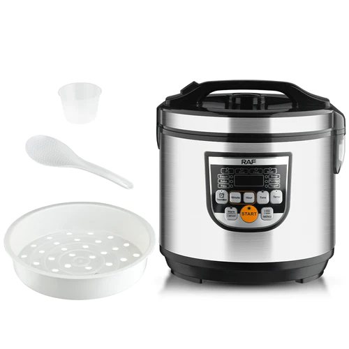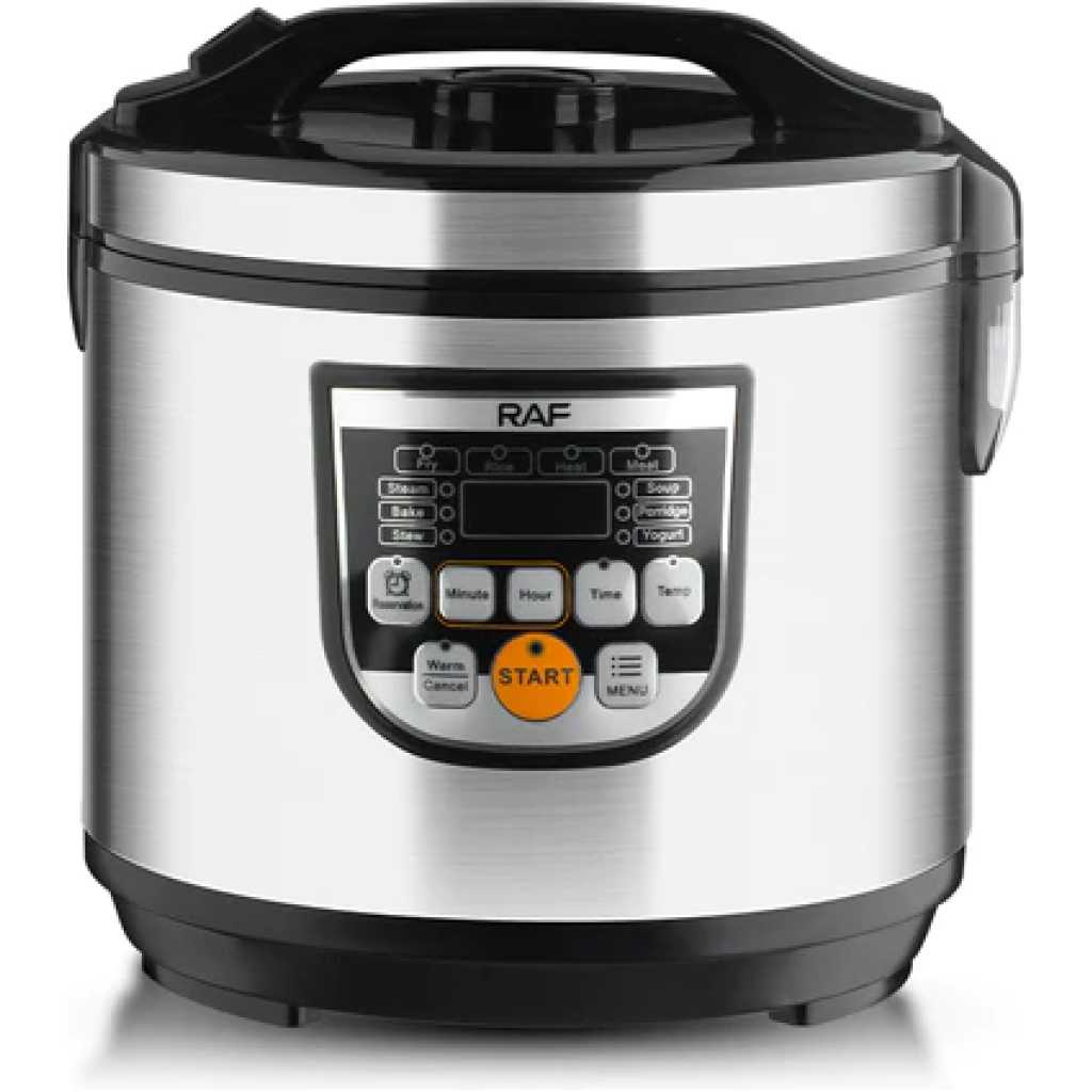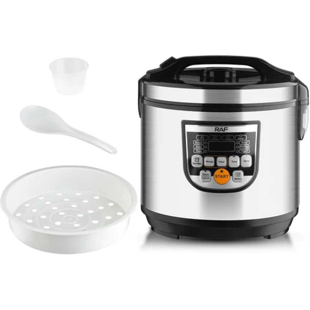 RAF 5 Litres Large Capacity Electrical Pressure Rice Cooker R-178 RAF Rice Multifunction Electric Cooker 11 Programm in 1 I 5L Anti Stick Inner Pot I 900W I Steam Function I Keep Warm Function I Timer Function I LED Display Panel Time Control Multicooker Function Stainless Steel, (Cook, Boil, Stir-fry, Steam, etc The RAF R178 Rice Cooker Is An Easy Way To Cook Rice. With A Large 5 Litre Capacity Bowl, Enough Space To Cook Up To 25 Cups Of Rice, It Is Useful For Larger Households Who Love To Cook. The Keep Warm Function Allows You To Keep Your Rice Warm, Ideal For Those Busy Families Who Find It Hard To All Sit Down Together. The Rice Cooker And Steamer Includes A Spatula And Measuring Cup Along With An Additional Tray For Steaming Fish Or Vegetables Making The Piece Very Versatile. Easy To Clean And The Glass Lid Allows You To View Your Food Whilst Cooking And Its Non Stick Removable Bowl Enables Easy Cleaning. Highlights: Digital Timer Control: Use the digital timer to let you easily set the desired temperature and time, you can make it a perfect choice for your family. Underpan Heating: It is a single cookware of stews, without any mess in your life with this innovative serving tray. In the meantime, it is a perfect vessel with its natural shape and bottom, slims down to cook as well as ergonomically designed. Specifications Brand:RAF Model Number: R.178 24-Hour Appointment Capacity: 5 litres Constant Temperature Multi-function Menu Product Dimensions: 31 x 29 x 29 cm Power / Wattage: 900 watts Voltage: 240 Volts Material: Aluminium Special Features: Non-stick, warm, multifunctional, overheating, timer Item Weight: 3.3 Kilograms
