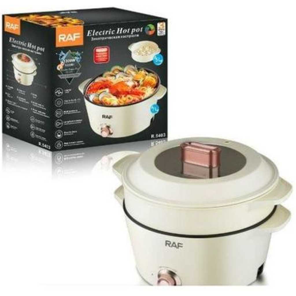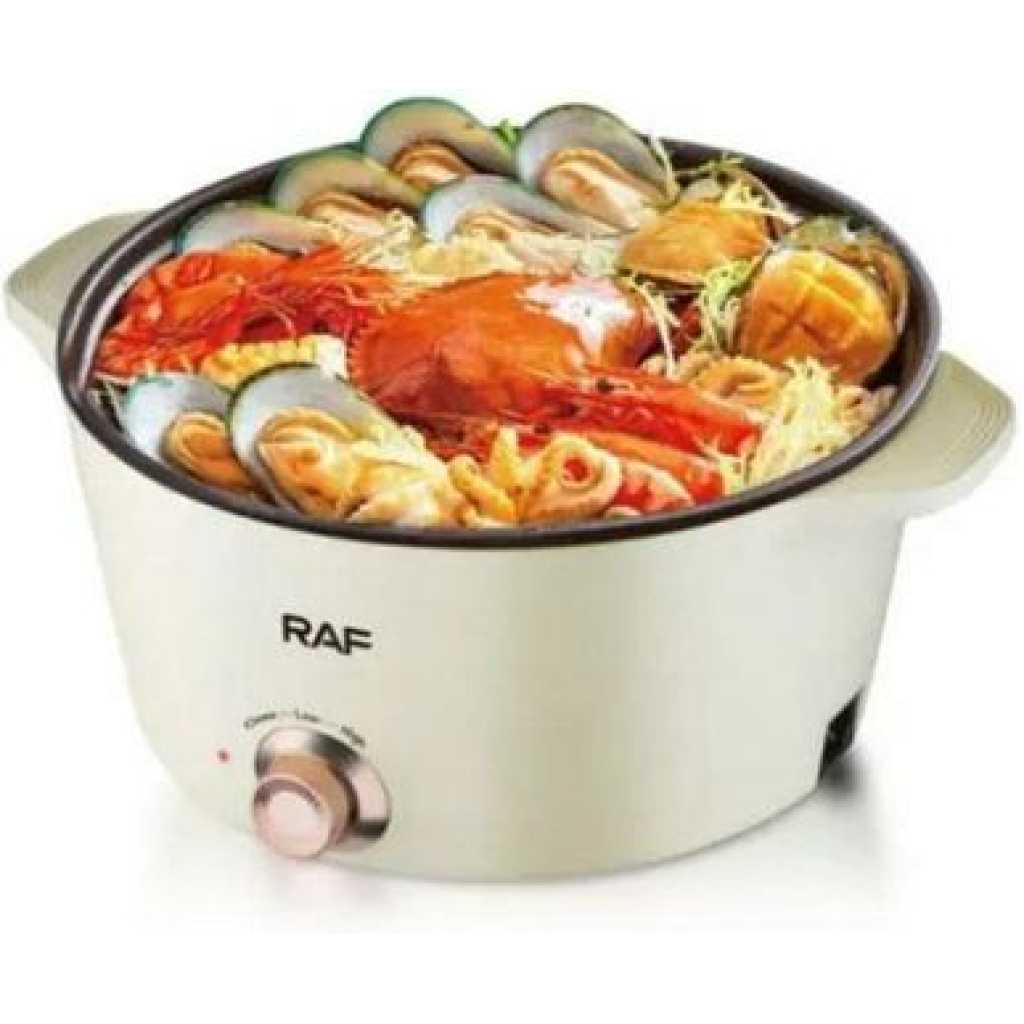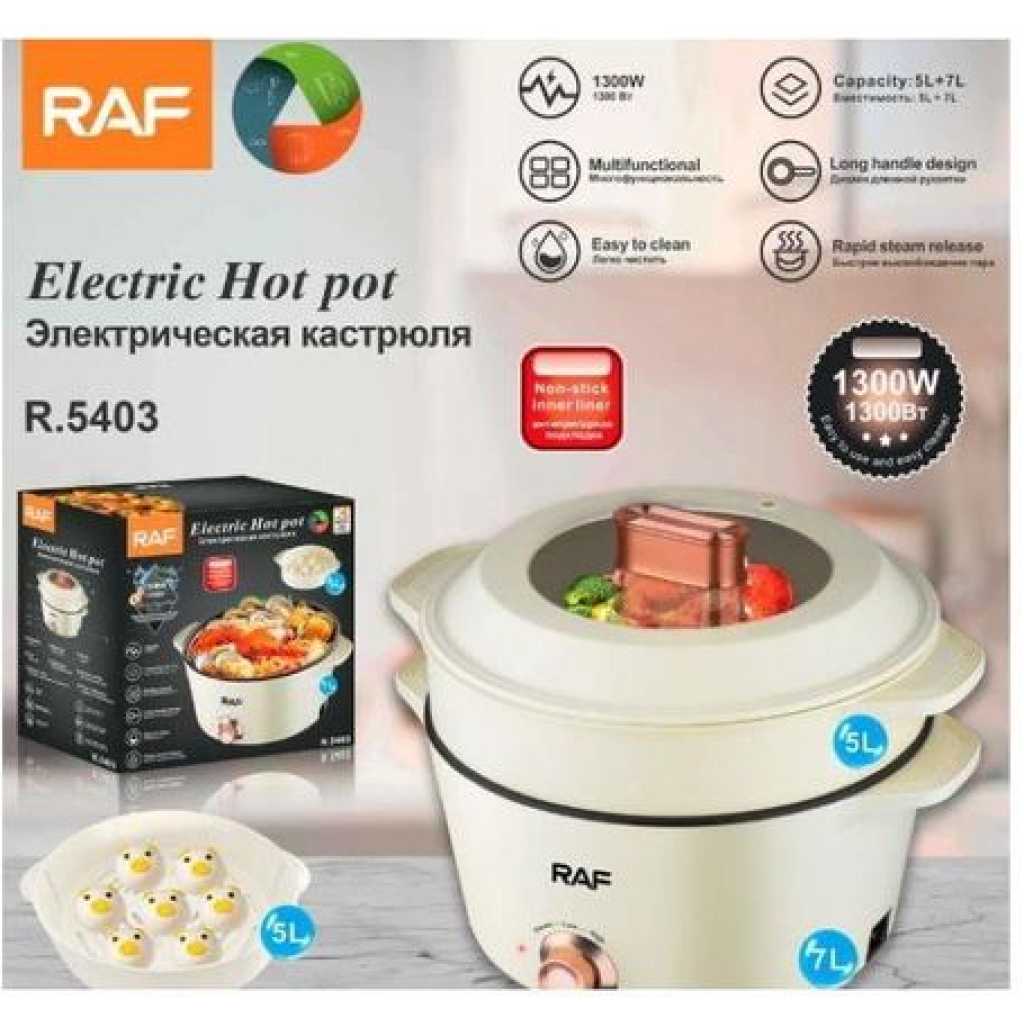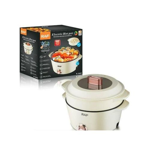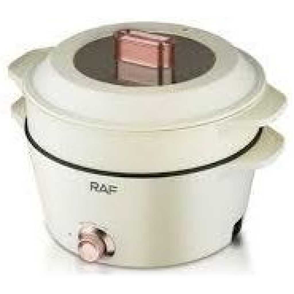 RAF 7 Plus 5 Litres Multipurpose Non-Stick Electric Hot Pot Stew Steamer Saucepan Frying Pan Cooker – Cream Multi-Function Electric Hot Pot: This multi-functional electric hot pot is an essential appliance for every kitchen. It can replace various traditional stove kitchenware to save money because it has an adjustable power knob to satisfy a different kind of way of cooking. You can use the low-power mode(300W) for cooking ramen, scrambled eggs, and pancakes. Healthy Non-Stick Coating: Hytric electric frying pan surface is made of food-grade nonstick coating which has the features to provide an effortless release and easy cleaning. You can sauté your foods smoothly on the pan to prevent sticking and cook foods at a low level of fat and oil to make your foods healthier. After cooking, easily clean up the surface. Convenience Cooking Appliance: Hytric 1.5L electric cooker hot pot has a mini size (14.4″ x 7.7″ x 5.1″) for easy storage and is portable, particularly useful in small spaces without kitchens like studio apartments, offices, and dorms. It can prepare your food swiftly at any time. If you are a travel lover, you can bring it with you to go on a trip and can cook your favorite food. Rapid Heating and Safe: We use round-shaped embedded heating element technology on our electric hot pot. This technology will keep your food heated evenly, not only making your tasty foods done more rapidly than traditional stove kitchenware but also preventing the foods from burning. In addition, Hytric electric hot pot has overheating protection. Good Gift Choice: Hytric electric cooker has an elegant look and humanized design, it can be a good gift choice for those who love cooking. Key Features: RAF 7 Plus 5 Litres Multipurpose Non-Stick Electric Hot Pot Stew Steamer Saucepan Frying Pan Cooker – Cream – Frying pot capacity: 7L – Steam pan capacity: 5L – Adjustable temperature knob – Non-stick liner – Easy to clean – Long handle design for heat insulation and burns prevention – Multi kinetic energy pot Stir frying,frying ,steaming,stewing & boiling