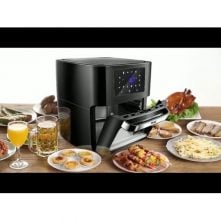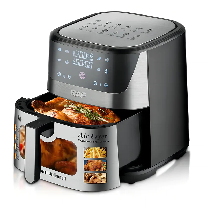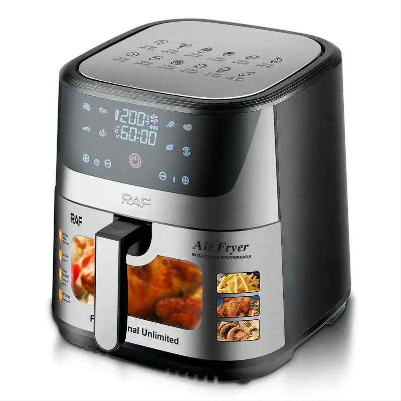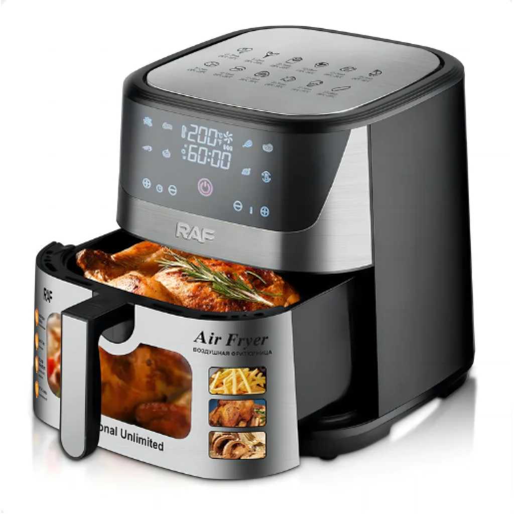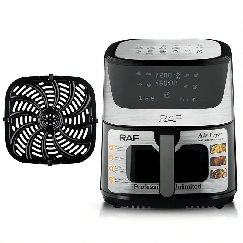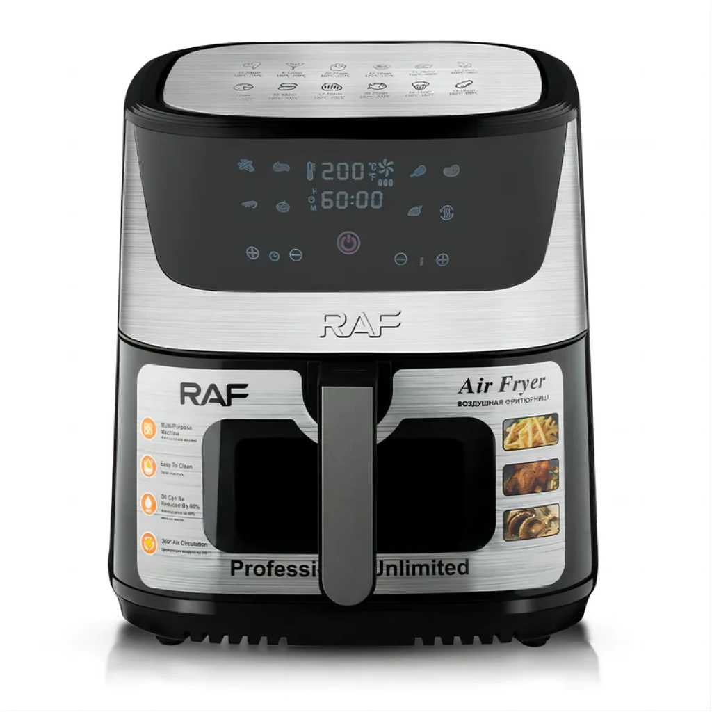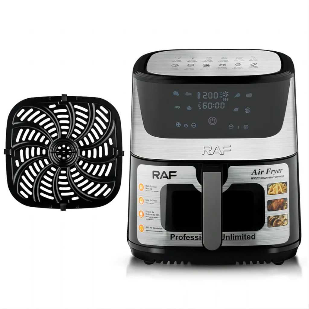 RAF 8L Digital Air Fryer | R.5350. RAF Air Fryer 8 litres R5350 digital Hot, grilling and deep frying pan for deep frying Grilling, frying, baking and roasting Heat food, keep it warm and defrost Low fat and gentle cooking with hot air With thermostat and timer control The rated power is 1300 watts The rated volume is 8 liters The shelf life is 5 years Frying without oil, without smoke, low in fat and easy to clean device. Buy this Air Fryer from TilyExpress The intelligent temperature control system heats the food evenly, frying with oil can be replaced with a hot stream of heat. Thanks to this, the food is heated quickly and crispy, and at the same time low in fat. The deep fryer can effectively reduce fat and remove oil while retaining juices. The food contains less fat and is crispier and juicier than traditional fried foods. Highlights: Electronic control and LCD display Electronic touch control with LCD display. Choose from many automatic operating modes such as: chicken, fries, seafood, cookies, steaks, skewers, sweet potatoes or use the manual mode and set the desired temperature and operating time yourself. After finishing work, the device will turn off automatically and announce the end of work. Large capacity of 8L and high power of 1300W Large capacity fryer, suitable for all kinds of delicacies, such as: baked chicken, baked fish, grill, cake, baked chicken wings, bread and baked cookies. The hot air circulation system evenly bakes the prepared dishes. If you want to eat healthy, it is worth investing in a fryer! Enjoy healthy and delicious food every day. Thanks to our deep fryer, you will reduce the consumption of fatty foods without having to give up your favorite snacks. Our device is ideal for frying, grilling, baking, reheating, defrosting, keeping warm and baking bread. Specifications 60 minutes timer Stainless Steel Easy to use with digital touch control panel Multi-functional cooking with little to no oil Adjustable time and temperature control Detachable non-stick basket for easy cleaning Dishwasher safe accessories Cool and touch handle Overheat protection Plug: VDE plug Rated voltage: 220V Rated power:1300W Digital Control