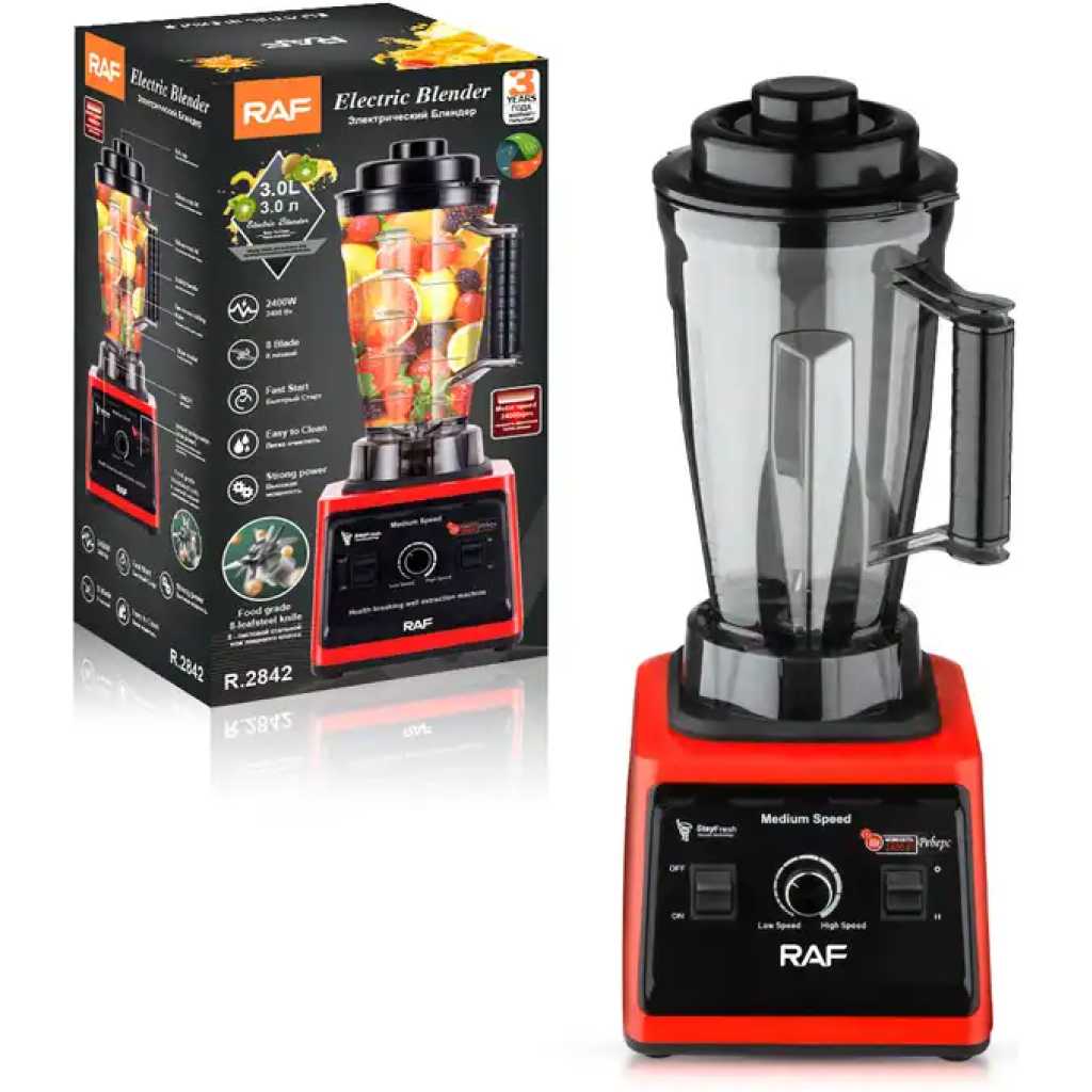RAF 3L Commercial Blender 2400W BPA Free Jar | R2842 Its sharp stainless-steel blades guarantee it will last you for a very long time, while its practical dosing cup makes it oh-so-easy to use! Simply open the lid and dosing cup to safely and easily add ingredients while the blender is operating. whole new world of possibilities, allowing you to grind and grate your spices and ingredients in the blink of an eye. Blending has never been so easy! RAF Blender is a must have kitchen appliance for every home. It is a safe and healthy way of blending and grinding food in the kitchen, cleaning will be easier than ever before. It is better than the old and crude way of grinding pepper in our homes. Staying healthy requires that you eat balanced meals, to help you prepare these meals conveniently; you need the right appliances. Find the RAF Stand Blender today on TilyExpress at the best price you can ever imagined today. Highlights 2400W Removable Measuring Cup 3L Plastic Cup Stainless Steel Blade 8 Speed Settings Plus Pulse Setting Motor Housing Easy To Clean Specifications Brand: RAF Usage: blender Model: R.2842 Capacity: 3L Power:2400w 8 blade Food grade 8-leafsteel knide Motor speed 2400rpm Fast start Easy to cleam Strong power