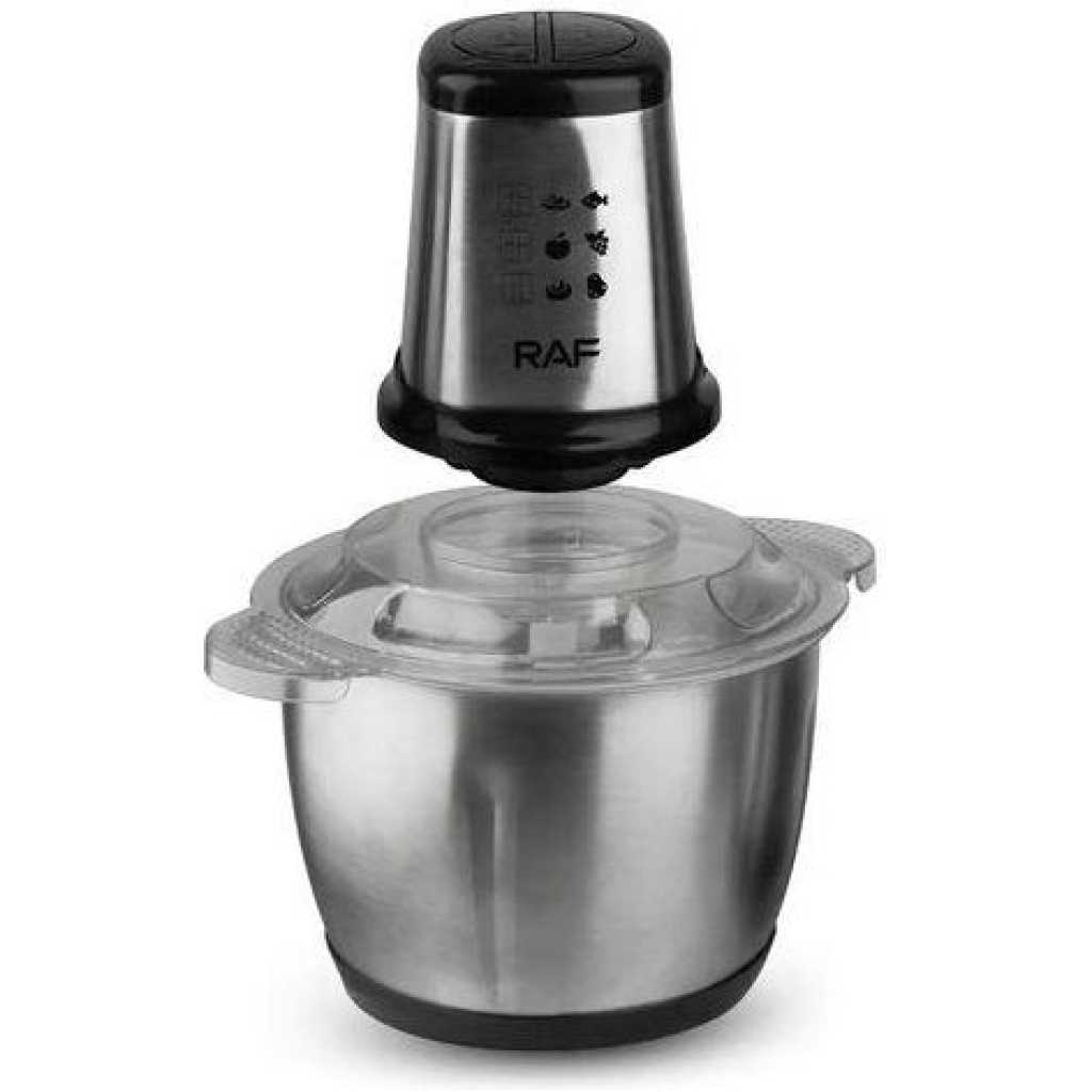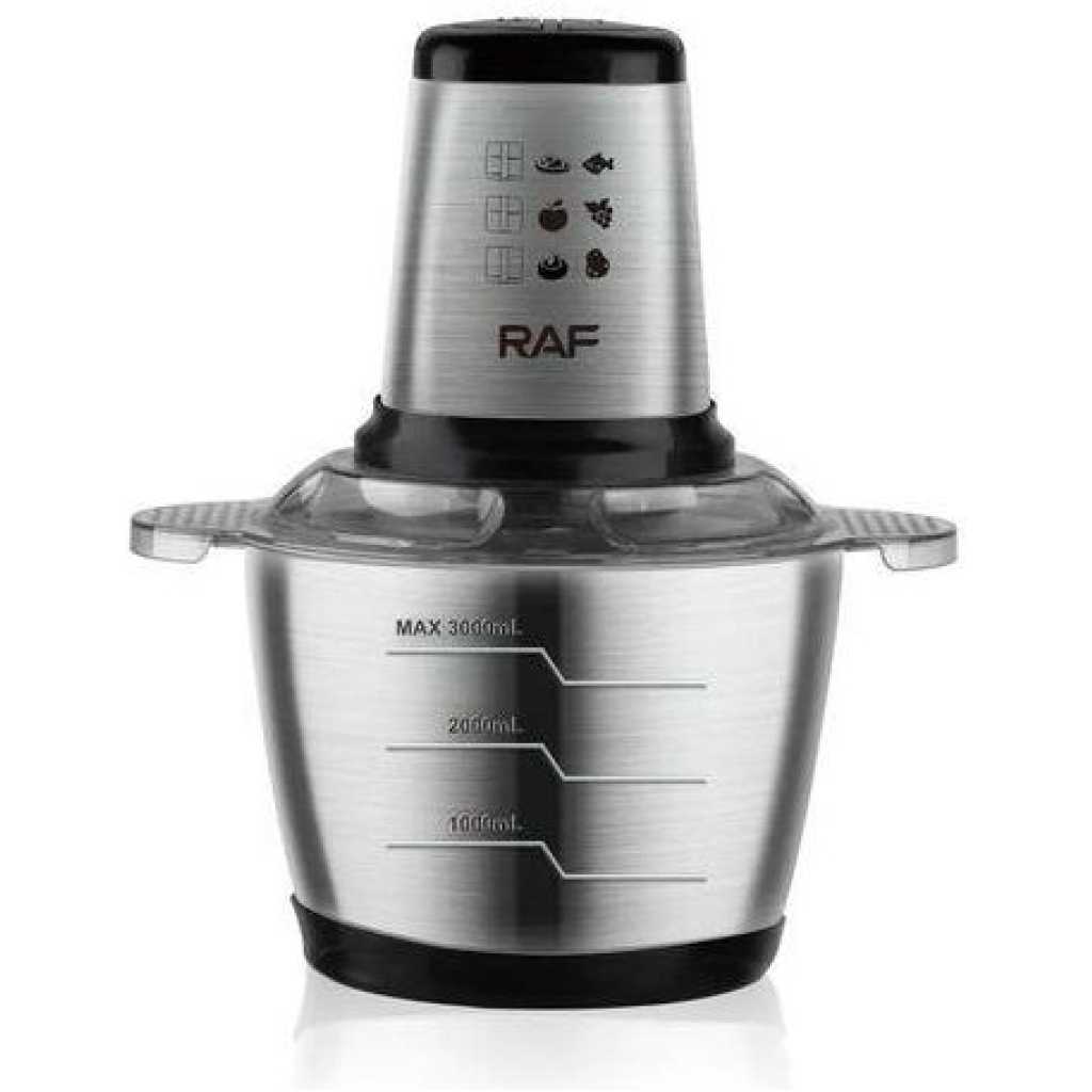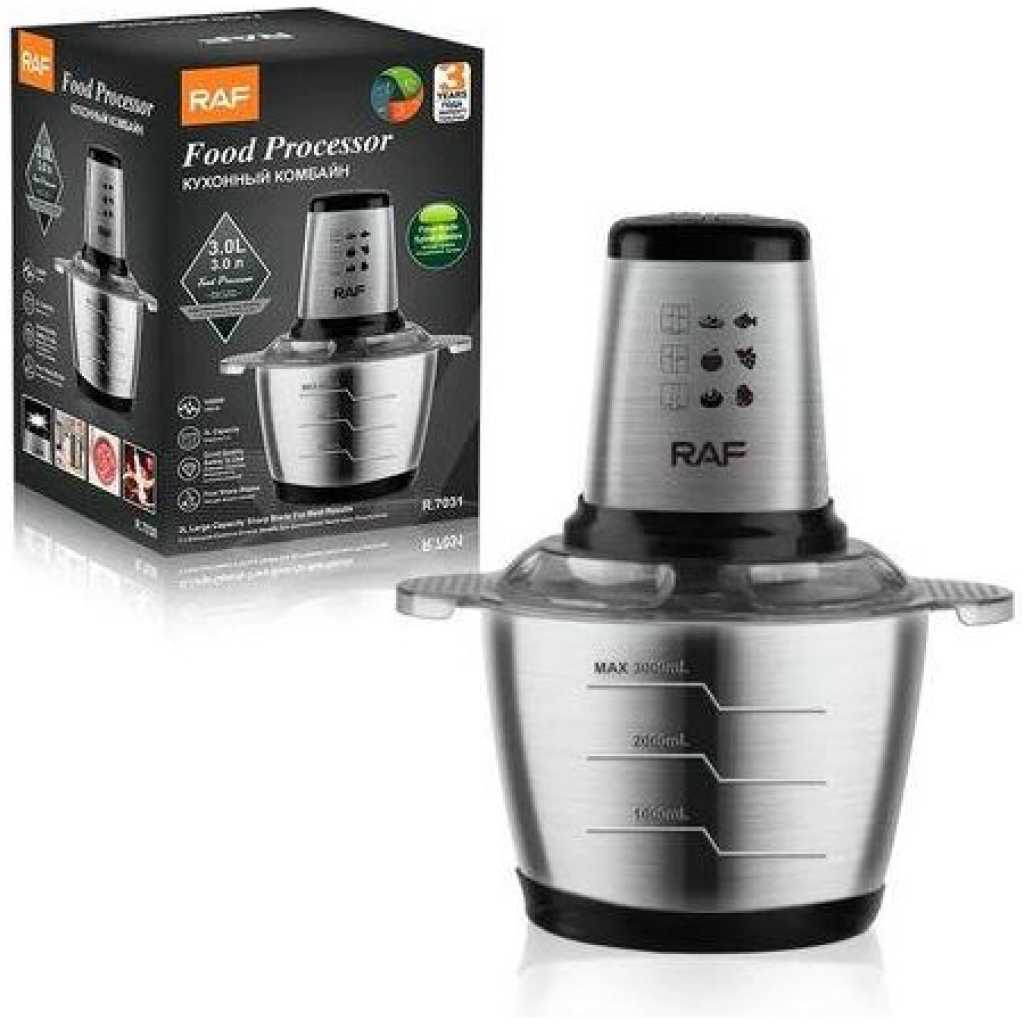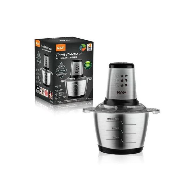 Key Features: RAF Electric Meat Grinder Food Processor Chopper Stainless Steel Kitchen Machines Vegetable Chopper Slicer Machine Household Grinder Power: 1000 W Material: stainless steel Bowl volume: 3 l Number of knives: 4 Number of speeds: 2 Dimensions: 18 x 25 x 30 cm. Equipment: Food processor RAF R7031 Capacious bowl Instructions Factory packaging.