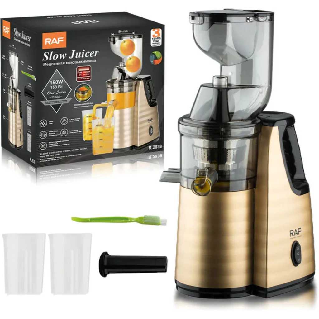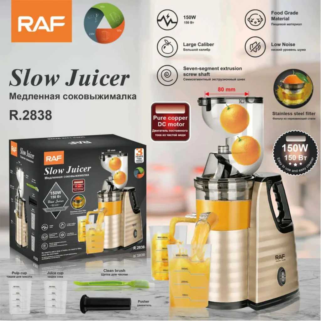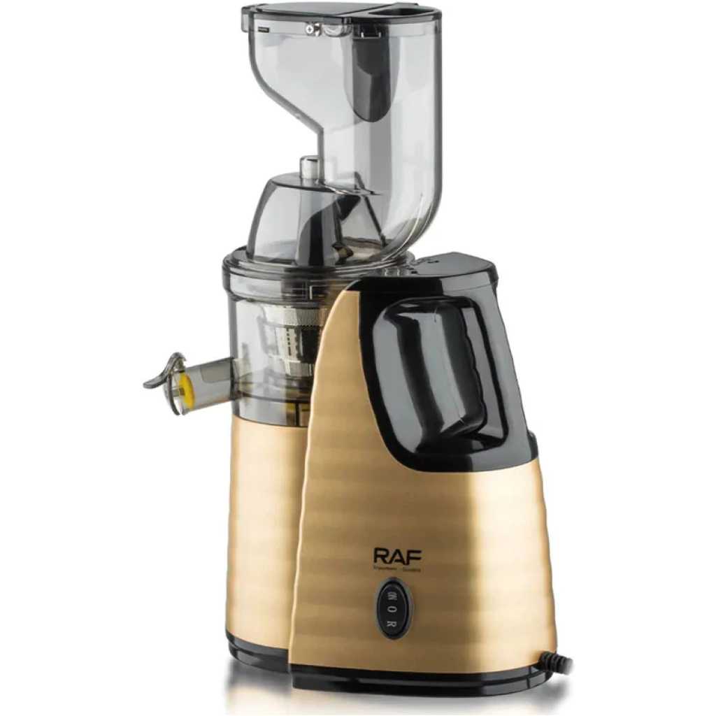 RAF Slow Juicer 150W | R.2838. This professional-grade blender provides commercial-level juicing capabilities in a compact, easy-to-use design. Its powerful motor quickly transforms carrots or other fruits and vegetables into nutritious, cold-pressed juice for convenient, healthy consumption. Its professional-level speed and performance make it an ideal choice for commercial use. 150W Blender Carrot Extractor Machine Cold Press Professional Commercial Slow Juice. RAF Fruit Juicer 150W High-Quality Plastic Low Noise With An Ice Cream Filter Stylish Design. Amazingly convenient to use, immensely simplified method of operation with completely new juicing mechanism. The new series juicer of no filter is amazingly easy to assemble—all you have to do to get ready for juicing is fit the chamber into the groove in the base. Fast and thorough cleaning: Say good bye to small metal holes on the strainer that you had to scrub to remove pulp. With the new filter-free strainers with large, elongated grooves, no need to scrub repeatedly, simply rinse the parts in water. Taste & Pulp Control Juice created with this slow juicer is fresh, unprocessed and pure. Specifications: DC motor with 75 RPM Low noise With safety switch and on/off/return switch Reverse switch for self-cleaning, avoid foods stuck Large Feeder 80mm for whole apple and other fruits Tritan material BPA free Fast pulping large caliber seven segment extrusion screw shaft Continuous work less than 15min With 2 cups one for juice the other for dregs Compact with elegant design 220-240V 50Hz 150w MODEL No; R2838 Key Features: RAF Slow Juicer 150W | R.2838. MODEL No; R2838 Easy to Clean Easy to use Made of high quality materials