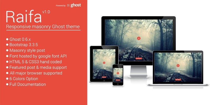 Raifa - Responsive Masonary Ghost Theme. Raifa is responsive masonary theme for your ghost blog. Clean simple and minimalist template for your new ghost blog.