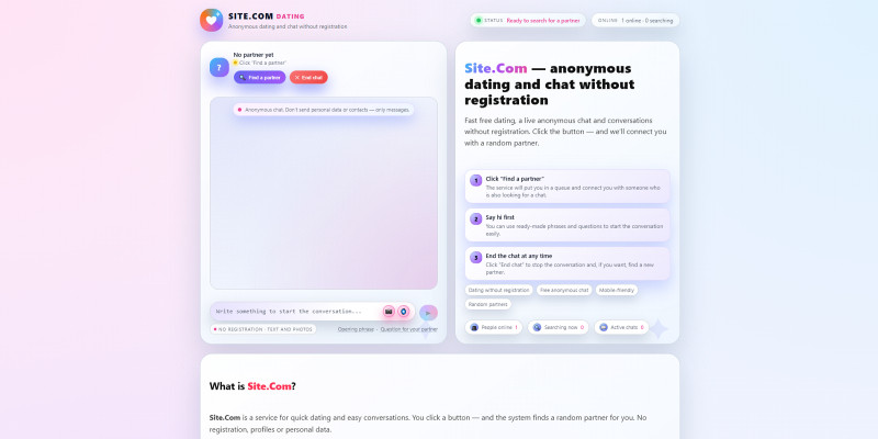 Random Anonymous Chat Script with Photos. Anonymous random chat with queue, photo sharing, sound alerts and stats. Clean PHP + MySQL script, ready to deploy.