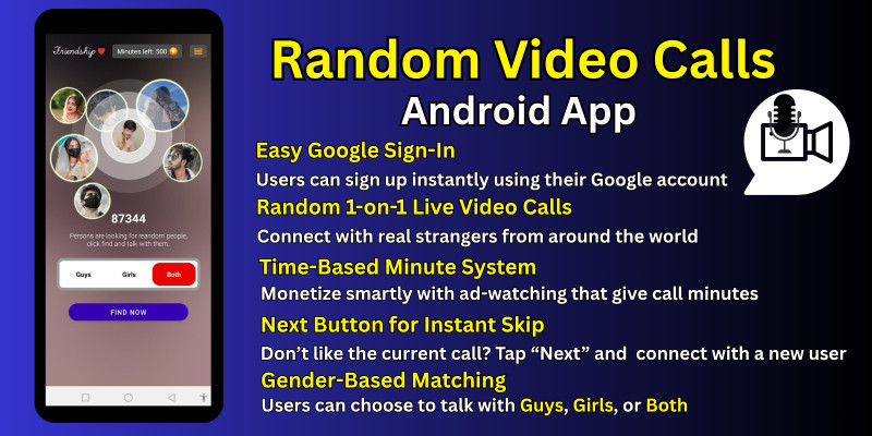 Random Video Calls Android App. Launch your own video chat app with gender filter, ad rewards & real-time Firebase backend. Fully Customizable.
