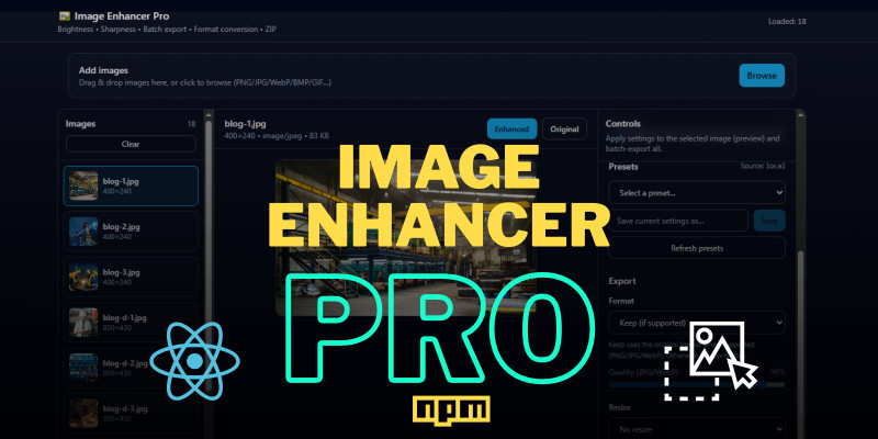 React Image Edit Enhancer Pro . Image Enhancer Pro is a fast browser-based image editing tool with batch enhancement, resize options, and ZIP export built using R