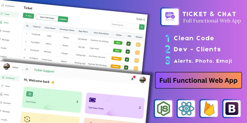 Real Time - Support Ticket & Chat System. A powerful ticket support system with React.js frontend, Node.js backend, real-time chat, push notifications, and SQL database int