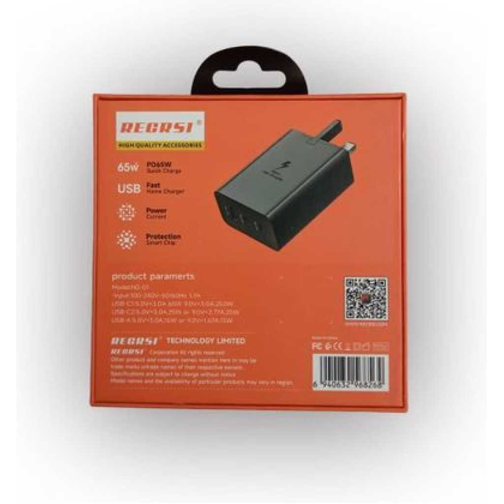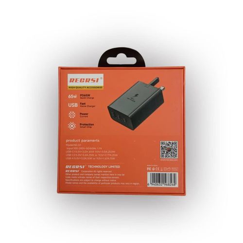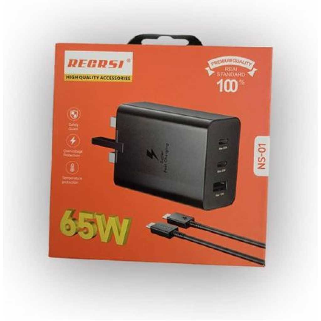 Compact Design The sleek and portable design makes this charger easily transportable, perfect for travel or everyday use without adding bulk. High-Speed Charging Delivers an impressive 30W output for rapid charging, ensuring your devices are powered up quickly and efficiently, saving valuable time. Versatile Compatibility Compatible with a wide range of devices including iPhone 15/14/13/12, Galaxy S23, and more, making it an ideal charging solution for multiple gadgets. Brand : Recrsi Model: NS-01 Input: 100-240V-50/60Hz 1.7A Output Power: 65W Type: USB – A, USB – C and USB – C USB-C1: OV = 3.A 65W 9.0V = 3.0A, 25.0W USB-C2: 5.0V 3.0A.25W or 9.0V = 2.77A, 25W USB-A 5.0V 3.0A,15W or 9.OV = 1,67A,15