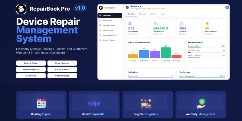 RepairBook Pro — Device Repair Booking System. Complete device repair shop management with booking engine, Stripe payments, EasyShip shipping, warranty system & admin dashbo