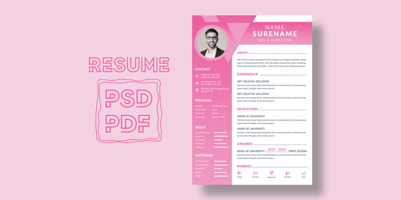Resume Layout with Sidebar and Pink Elements. It is Resume Template Design.This template download contains 300 DPI Resolution, Print-Ready format, CMYK Color Setting, All main