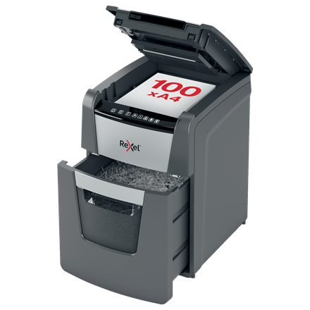 Key Features: Auto feeds 100 sheets at once P-4 security level (4x28mm) 34L pull-out waste bin 20 minutes continuous run time Ultra-quiet operation at 55dBA