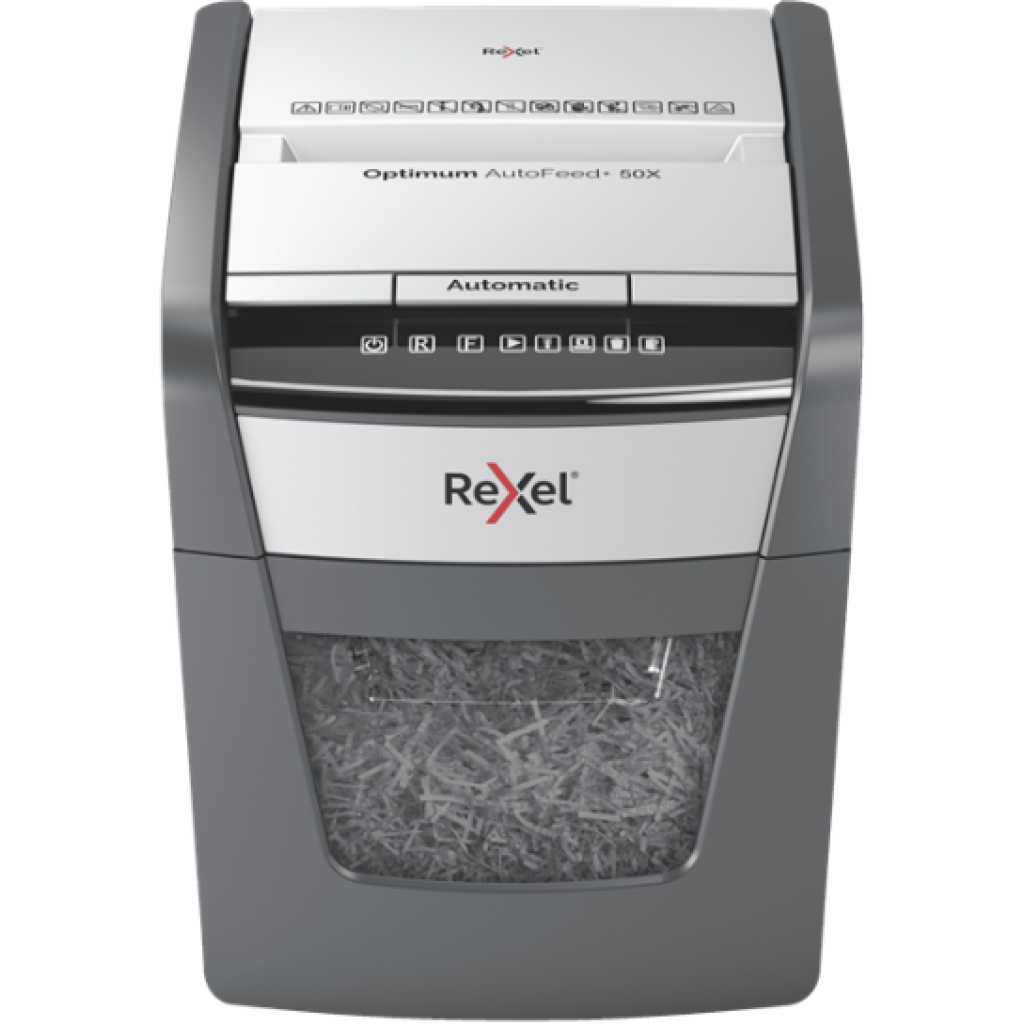 The Rexel Optimum AutoFeed+ 50X Cross-Cut Shredder is a compact yet powerful shredding solution ideal for both home and small office use. Designed to simplify document disposal, this shredder can automatically handle up to 50 sheets of A4 paper at once, reducing the time and effort needed to secure your confidential information. The P-4 security level ensures that your documents are shredded into 4x28mm pieces, offering a high level of protection against data theft. One of the standout features of the Optimum AutoFeed+ 50X is its ability to shred not just paper, but also staples, paper clips, and even credit cards. This makes it a versatile tool for managing a variety of office waste without the hassle of manually removing these items beforehand. The 20L pull-out bin provides ample capacity for shredded materials, and the infrared sensor ensures you are notified when the bin is full, preventing overflow and maintaining a tidy workspace. The shredder operates with a continuous run time of 10 minutes, backed by fan cooling technology to prevent overheating. Despite its robust capabilities, it remains ultra-quiet, operating at just 55 dBA, making it suitable for any work environment without causing disruption. The intuitive touch control panel offers ease of use, while the anti-jam technology ensures a smooth shredding experience, minimizing interruptions. For added convenience, the shredder includes a manual feed slot for up to 6 sheets, perfect for quickly disposing of smaller batches. With its sleek design and efficient functionality, the Rexel Optimum AutoFeed+ 50X is a reliable choice for anyone needing to manage sensitive documents securely. Whether you’re dealing with personal information or proprietary business data, this shredder offers the security, efficiency, and ease of use that modern offices demand. Technical Specifications: Sheet Capacity: Auto-feed up to 50 sheets, manual feed up to 6 sheets Cut Type: P-4 cross-cut (4x28mm) Bin Capacity: 20L pull-out bin Run Time: 10 minutes continuous, with fan cooling Noise Level: 55 dBA ultra-quiet operation Shreds: Paper, staples, paper clips, credit cards Anti-Jam Technology: Yes Bin Full Sensor: Infrared sensor Control Panel: Touch control interface Dimensions: W363 x D430 x H405mm Weight: Approximately 7.8 kg