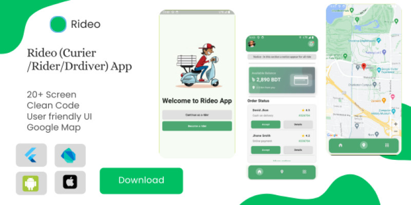 Rideo Courier Rider App UI Kit. Rideo is a sleek and modern app UI designed for the transport industry, catering to both riders and drivers