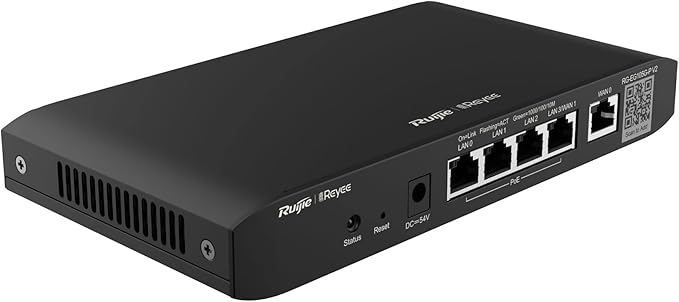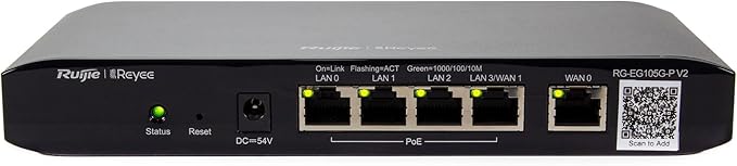 RG-EG105G-P V2 5-Port Gigabit Cloud Managed Router, 802.3af/at PoE-Out On LAN1-4, 600Mbps Max Throughput, Dual Core 880MHz CPU, 100 Competitor Users The Ruijie Reyee RG-EG105G-P V2 is a cloud-managed router with 5 Gigabit Ethernet ports, designed for small to medium-sized businesses. It offers features like user-friendly configuration, multi-WAN support with load balancing, application blocking, and customizable portal pages. The router also supports secure remote access to internal devices. Simplified Configuration and Powerful Features: Powerful features for small-sized networks, and simplified configuration. Enhanced Reliability: Benefit from high reliability and load balancing across WAN ports for uninterrupted connectivity. Cloud-Managed: The router is managed through the Ruijie Cloud platform, offering centralized configuration, monitoring, and remote management.