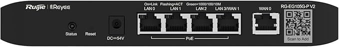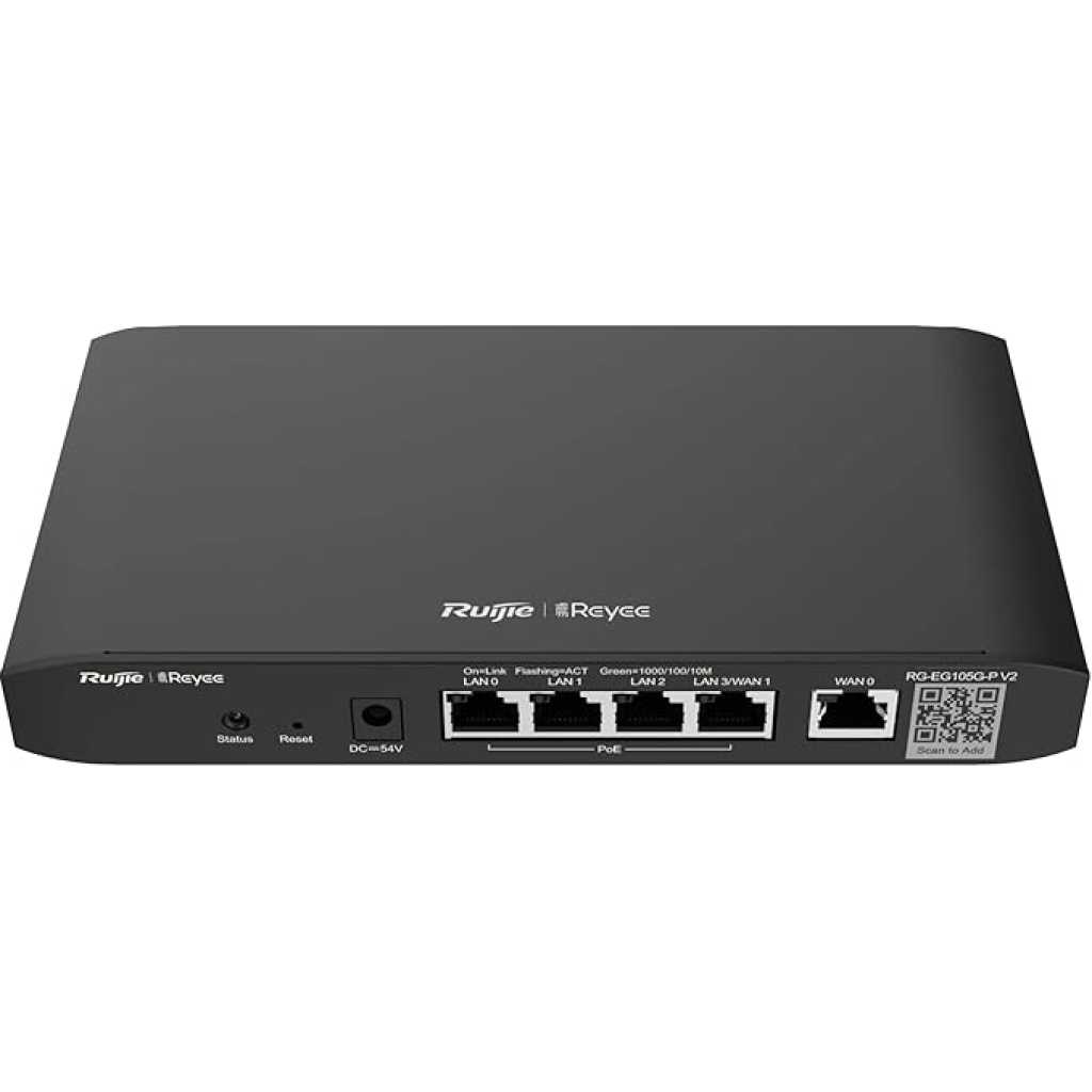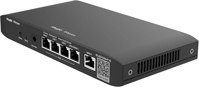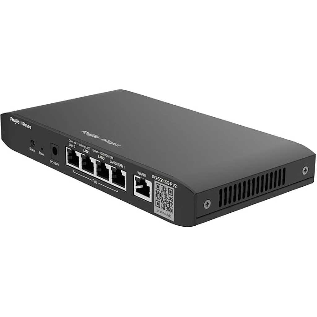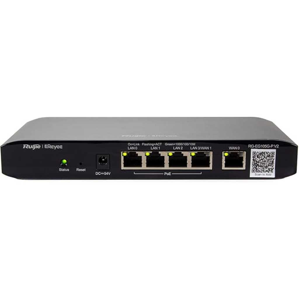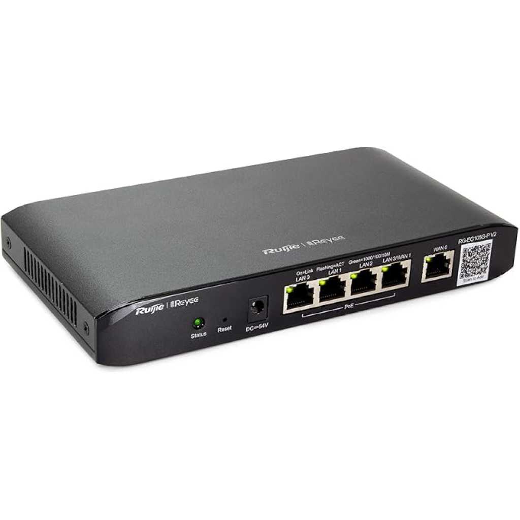 Ruijie RG-EG105G V2 5-Port Gigabit Cloud Managed Router, 802.3af/at PoE-Out On LAN1-4, 600Mbps Max Throughput, Dual Core 880MHz CPU, 100 Competitor Users The Ruijie Reyee RG-EG105G V2 is a cloud-managed router with 5 Gigabit Ethernet ports, designed for small to medium-sized businesses. It offers features like user-friendly configuration, multi-WAN support with load balancing, application blocking, and customizable portal pages. The router also supports secure remote access to internal devices. Cloud Management: The RG-EG105G V2 is managed through a cloud-based platform, allowing centralized control and monitoring. Simplified Configuration and Powerful Features: Powerful features for small-sized networks, and simplified configuration Interface installation. Secure Access: to Internal Devices Remotely Secure monitoring of NVR/IPC/internal server anywhere and anytime. Gigabit Ports: It features 5 Gigabit Ethernet ports (RJ45) for fast data transfer. Multi-WAN Support: The router can be configured with up to 2 ports as WAN, providing failover and load balancing. Application Blocking: It can block unwanted applications using an automatically updating library. QoS: Quality of Service (QoS) features allow prioritization of traffic for optimal performance. VPN: Supports VPN connectivity for secure remote access. Security: Advanced security features like firewall, access control, and content filtering are included. User-Friendly Configuration: The router is designed for ease of use and configuration. Customizable Captive Portal: A customizable portal page can be created. Free Ruijie Cloud: It integrates with Ruijie’s free cloud service for easy device management. Key Features: Ruijie RG-EG105G V2 5-Port Gigabit Cloud Managed Router, 802.3af/at PoE-Out On LAN1-4, 600Mbps Max Throughput, Dual Core 880MHz CPU, 100 Competitor Users User-friendly configuration and easy to use. High reliability and load balancing through WAN ports. Easy to block unwanted applications with automatically updating library. Customized portal page, what you see is what you get (WYSIWYG). Secure access to internal devices remotely.